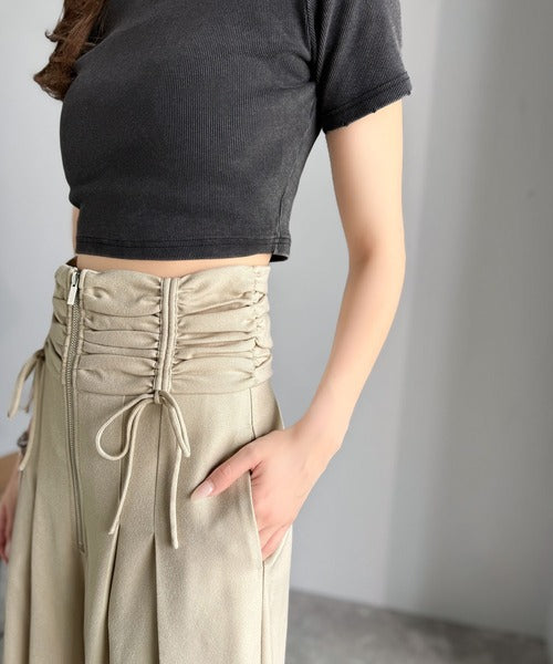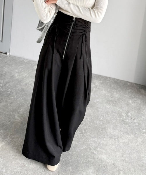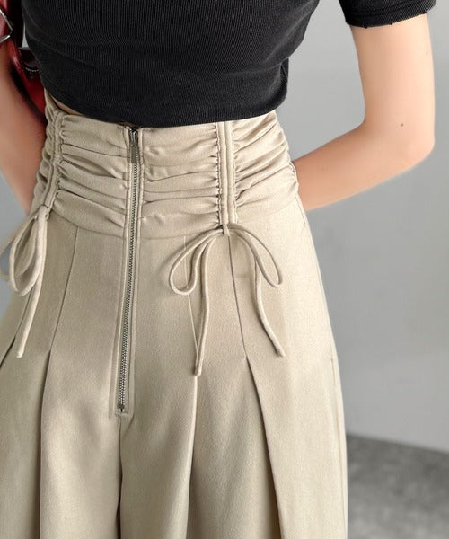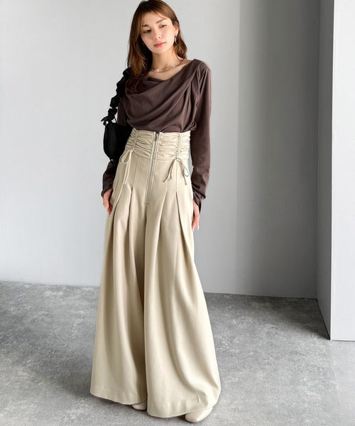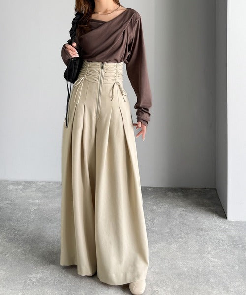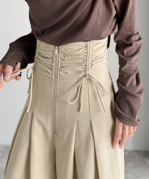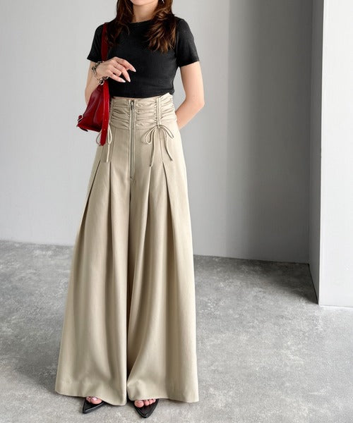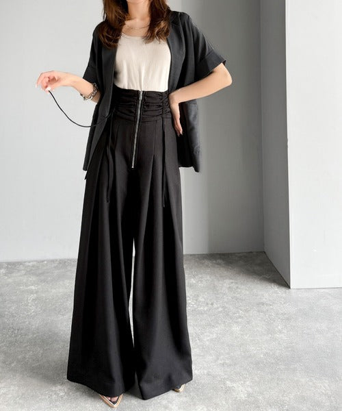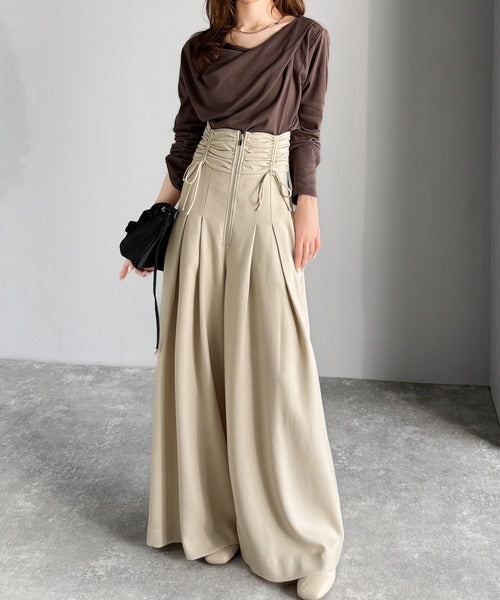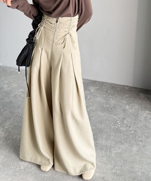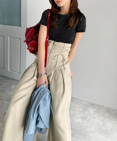 【mily bilet】コルセット風で“キュッ”と細見え。ウエストシャーリングハイウエストタック入りワイドパンツ mi1329054
