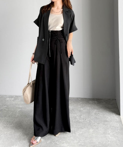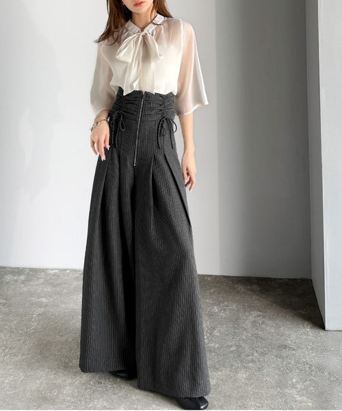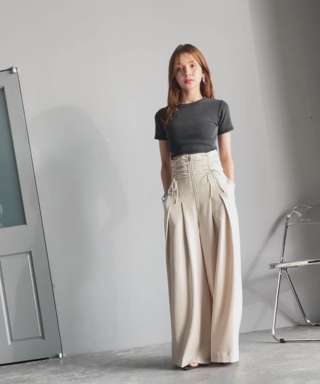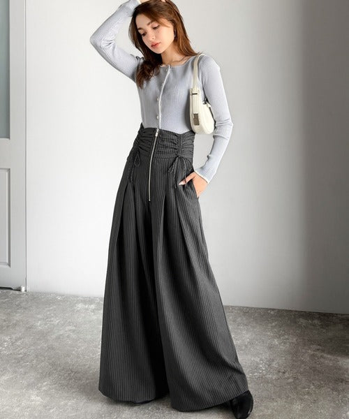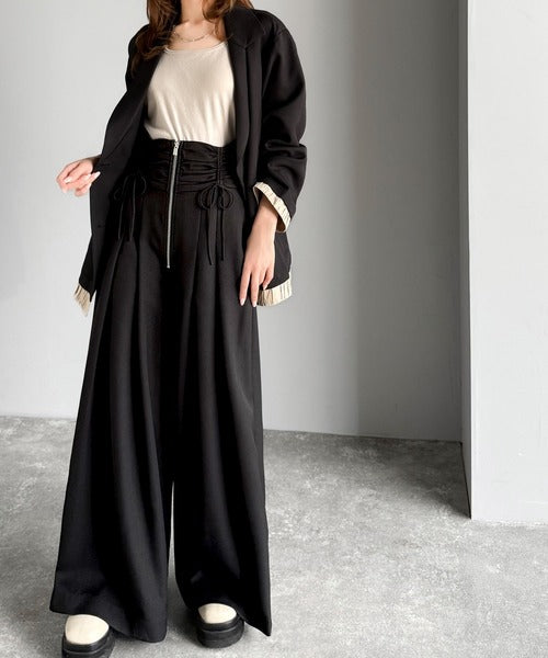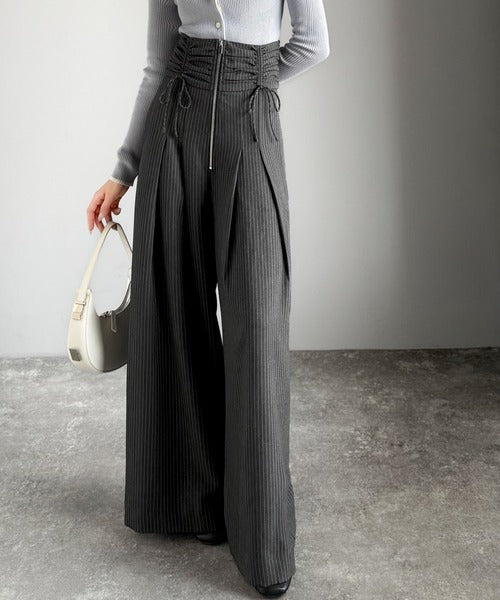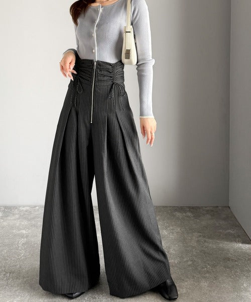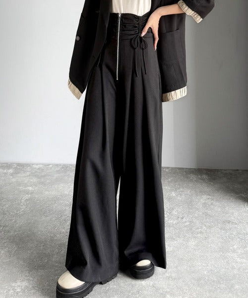 【mily bilet】コルセット風で“キュッ”と細見え。ウエストシャーリングハイウエストタック入りワイドパンツ mi1329054