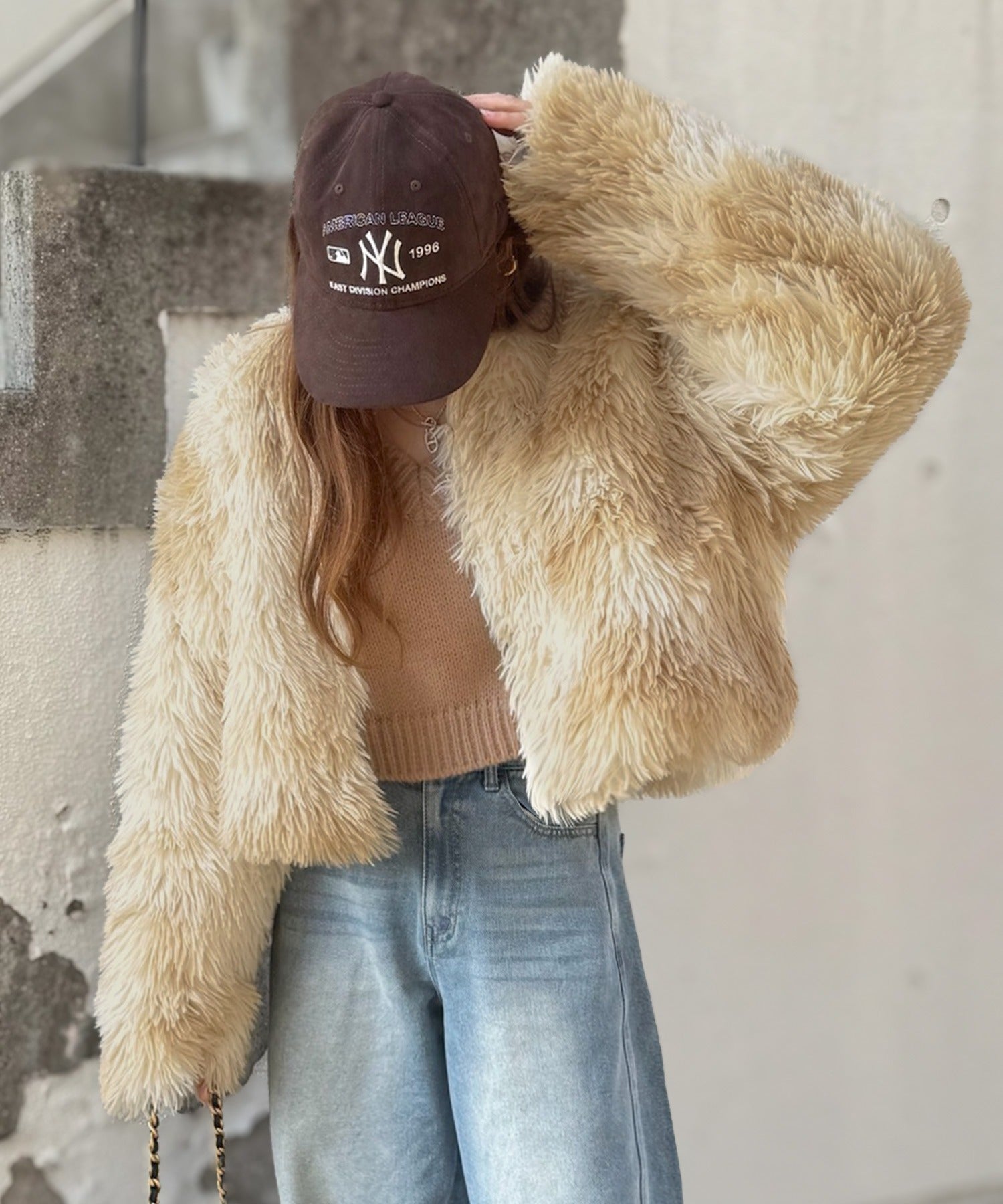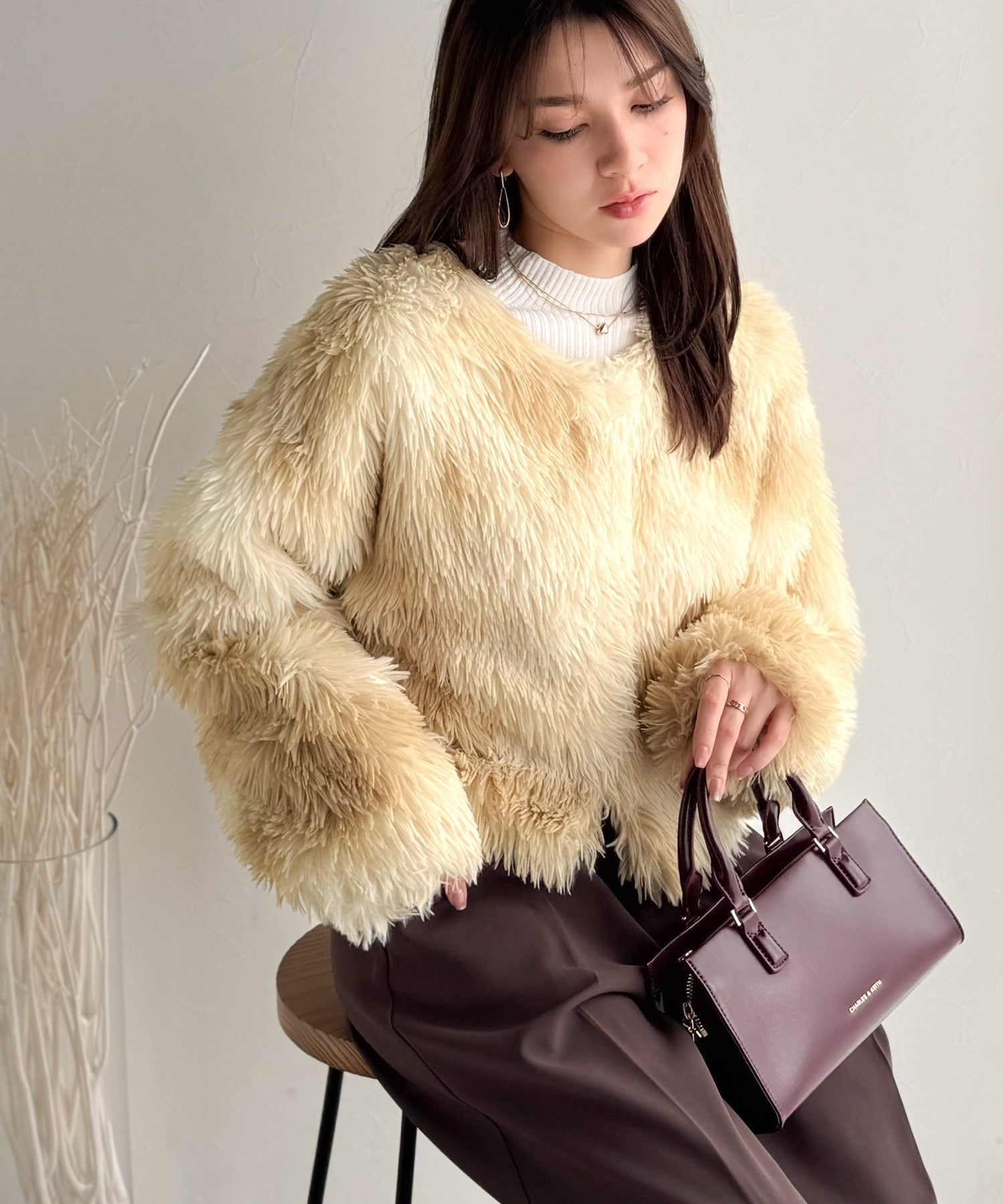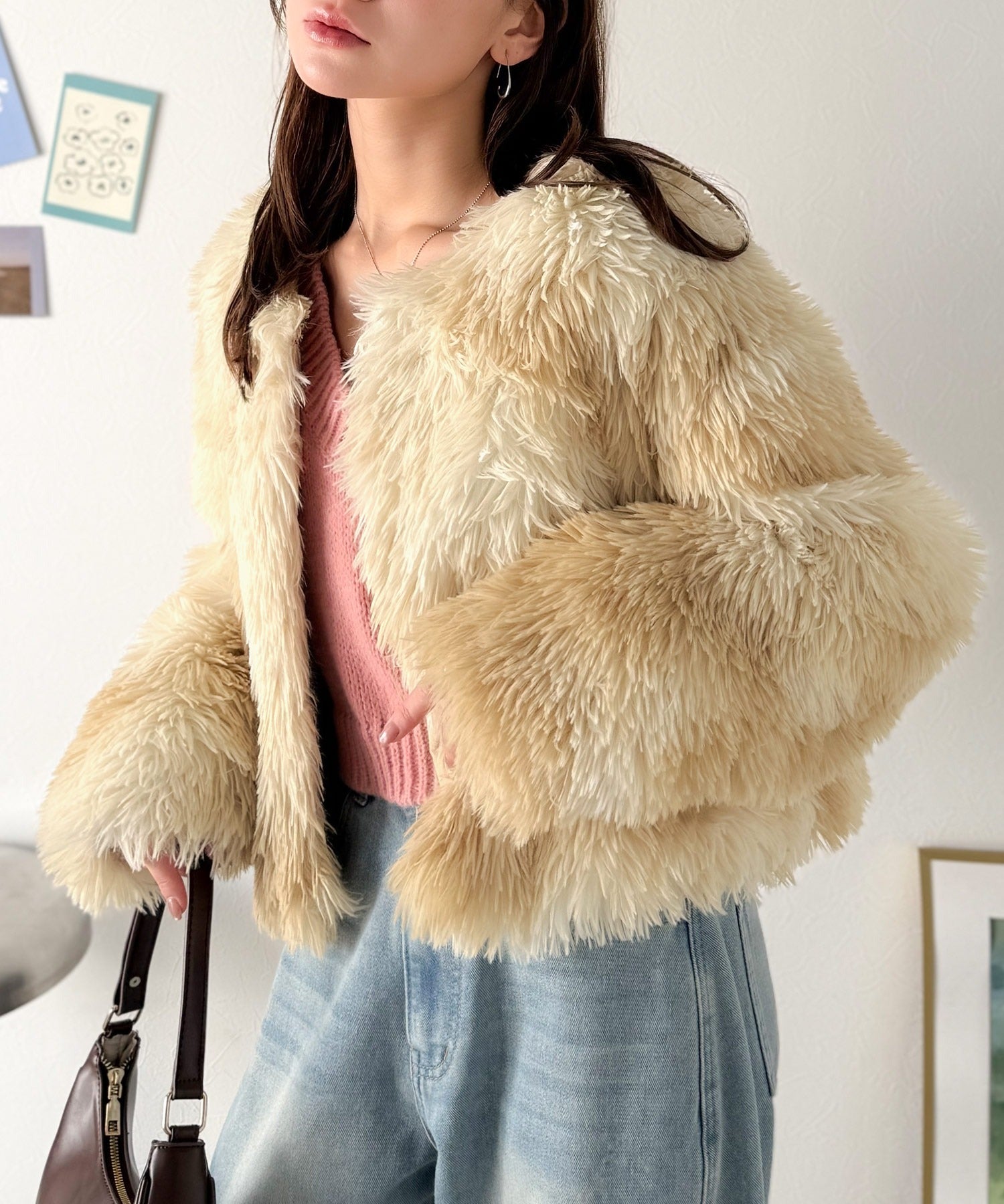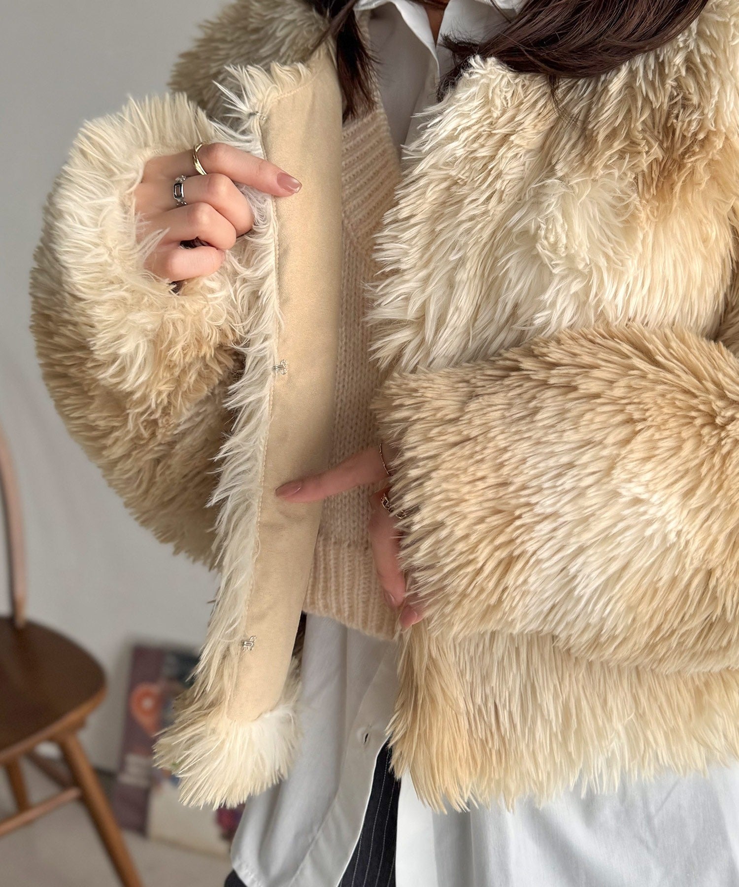贅沢に使用された毛足長めのフェイクファーは、軽やかでありながら暖かさを保ちます。