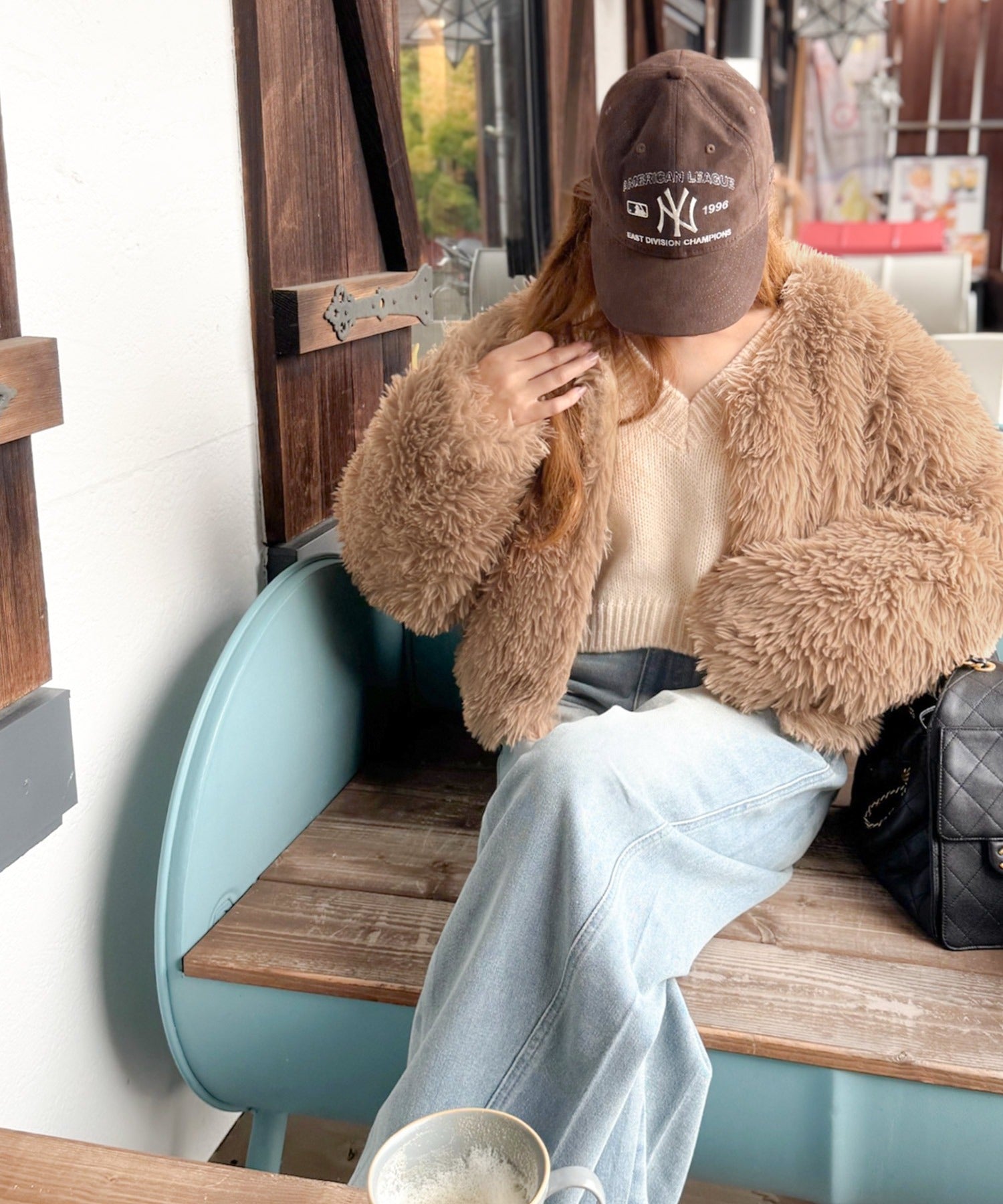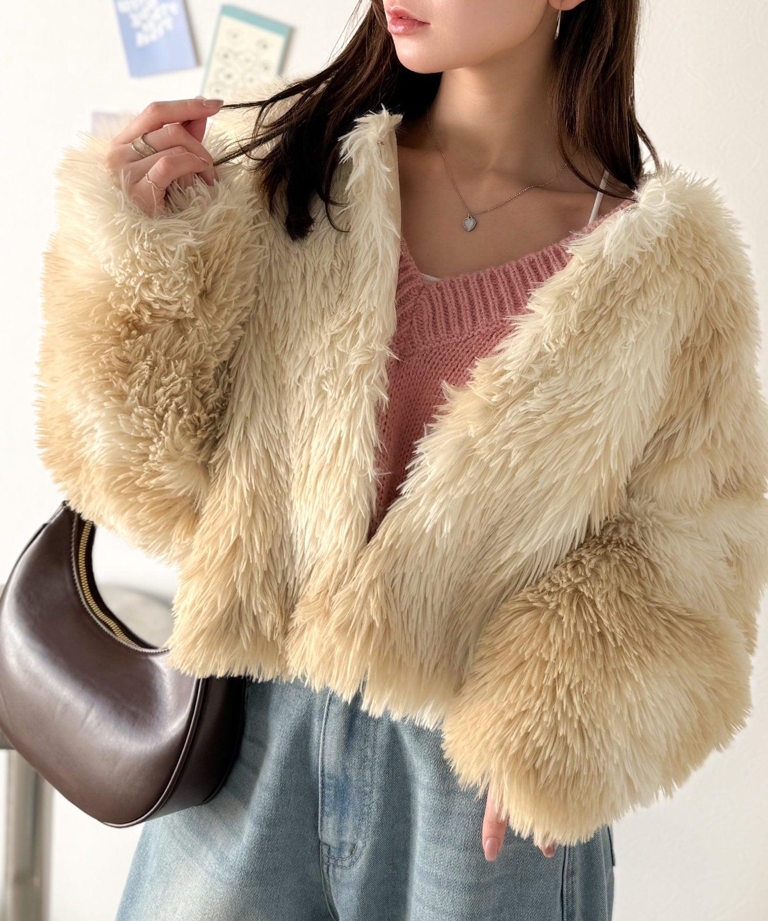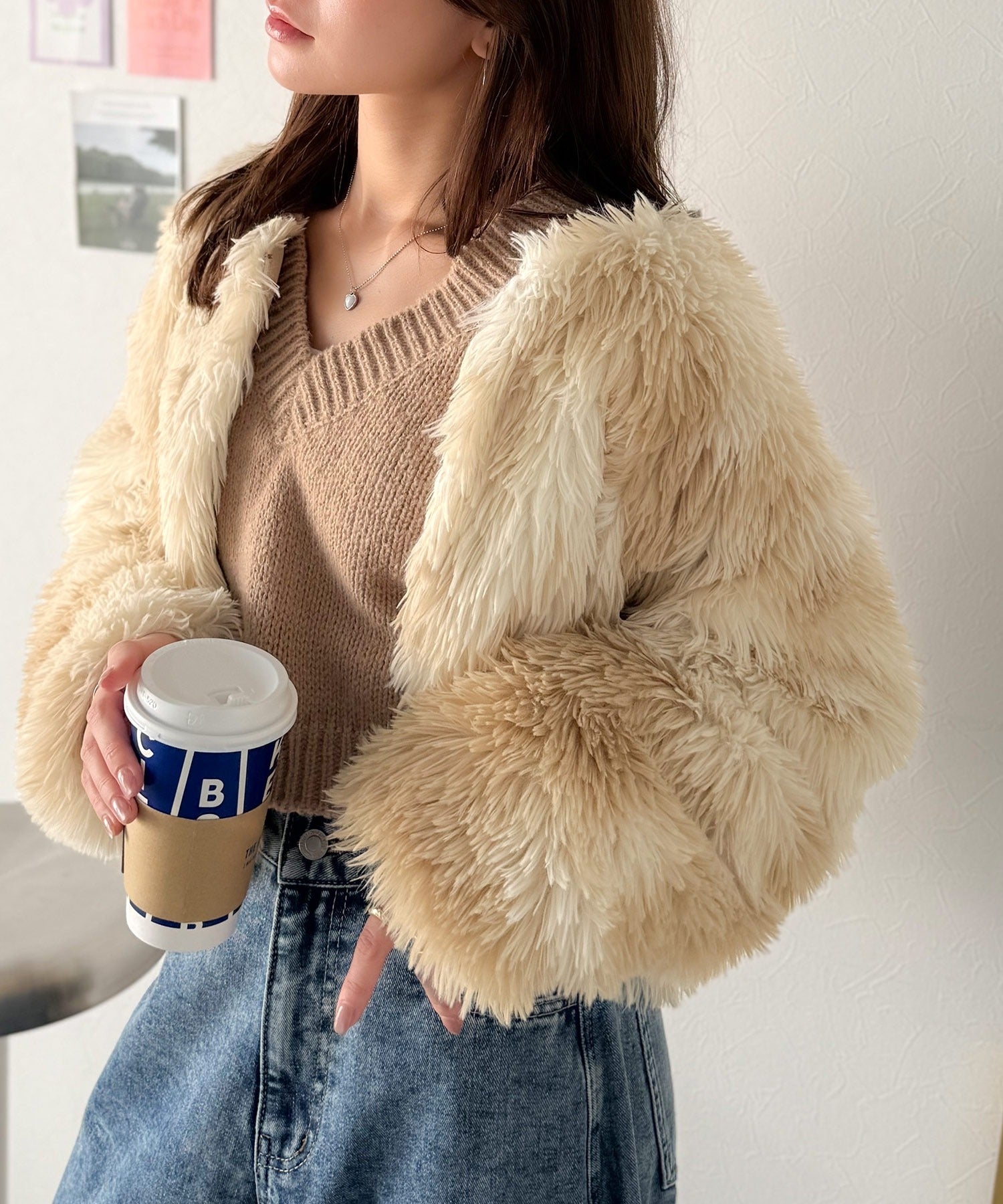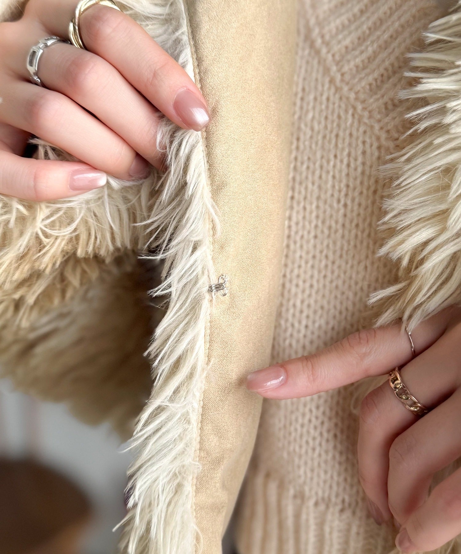 贅沢に使用された毛足長めのフェイクファーは、軽やかでありながら暖かさを保ちます。