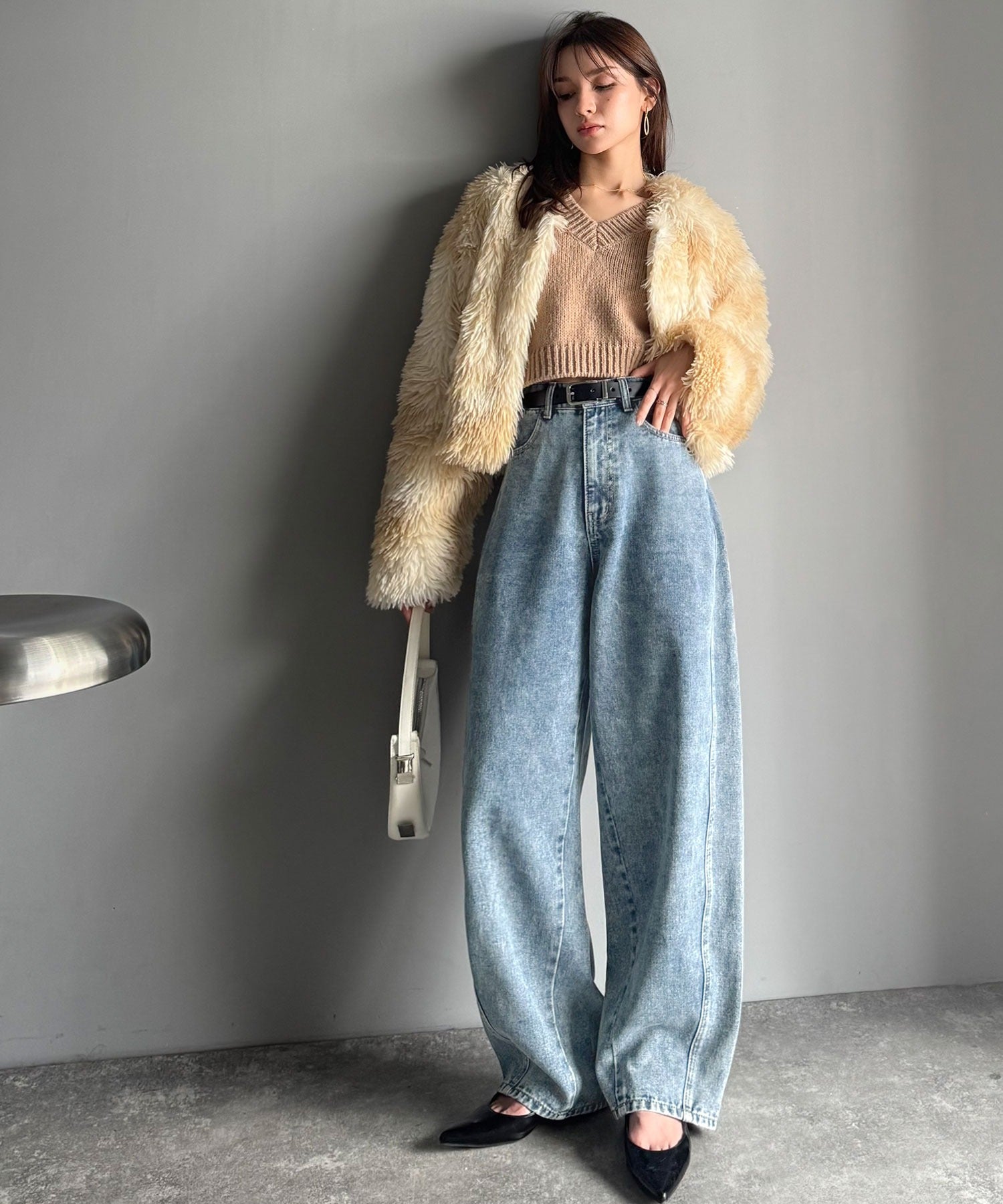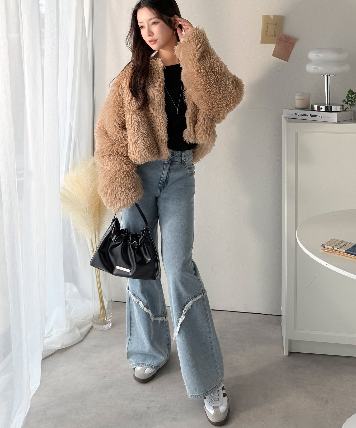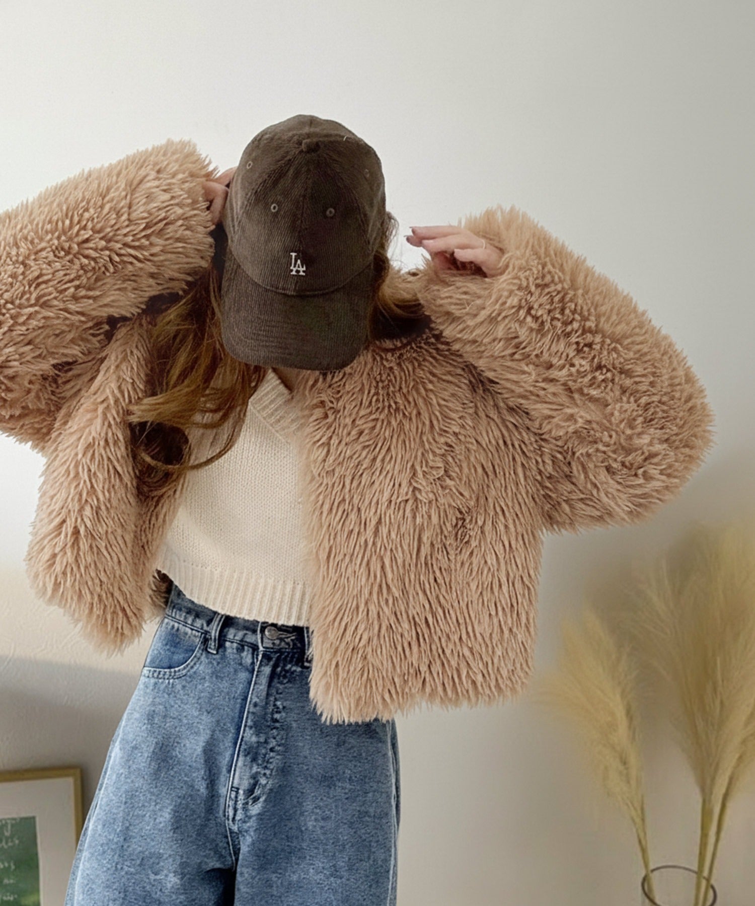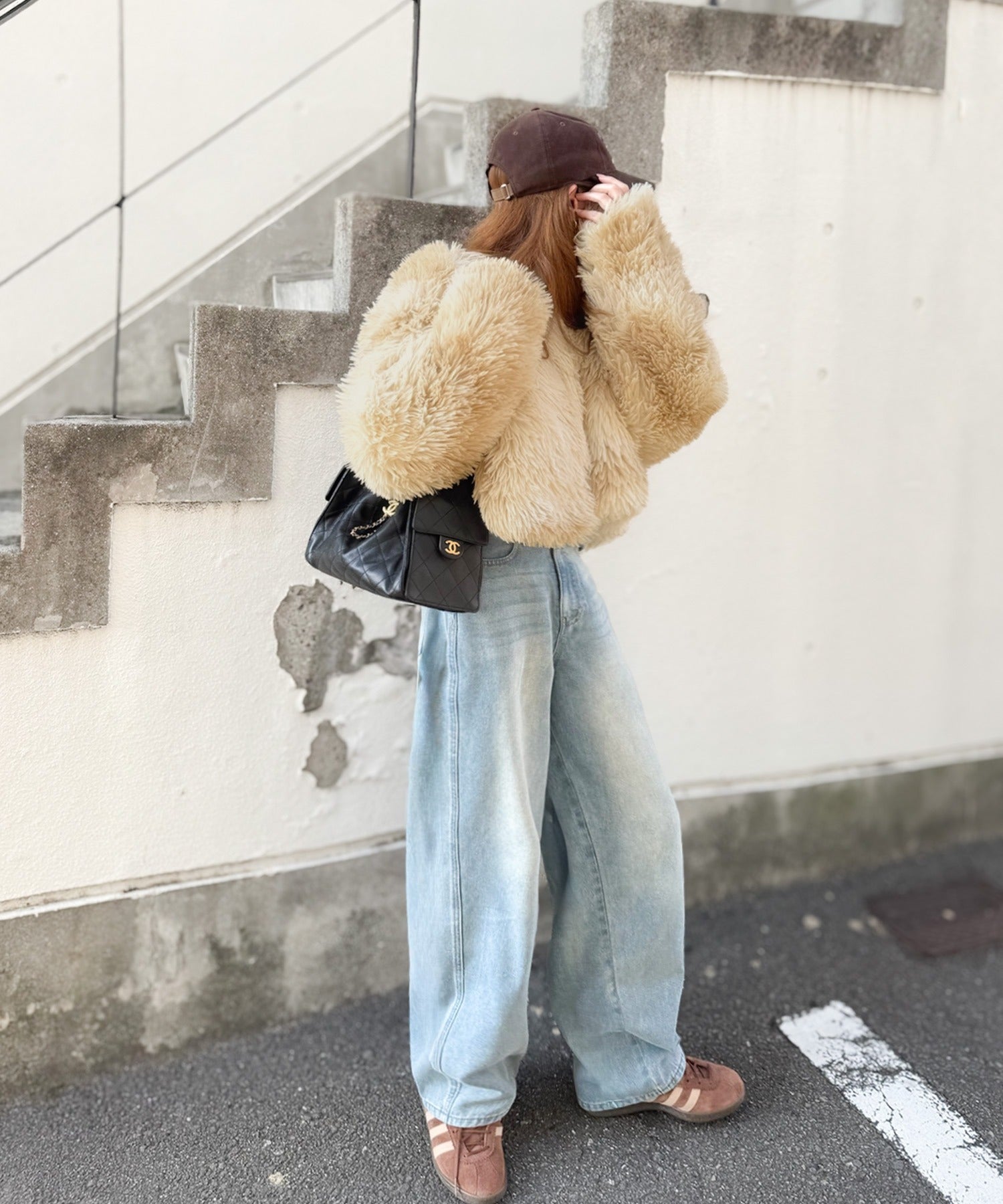 贅沢に使用された毛足長めのフェイクファーは、軽やかでありながら暖かさを保ちます。