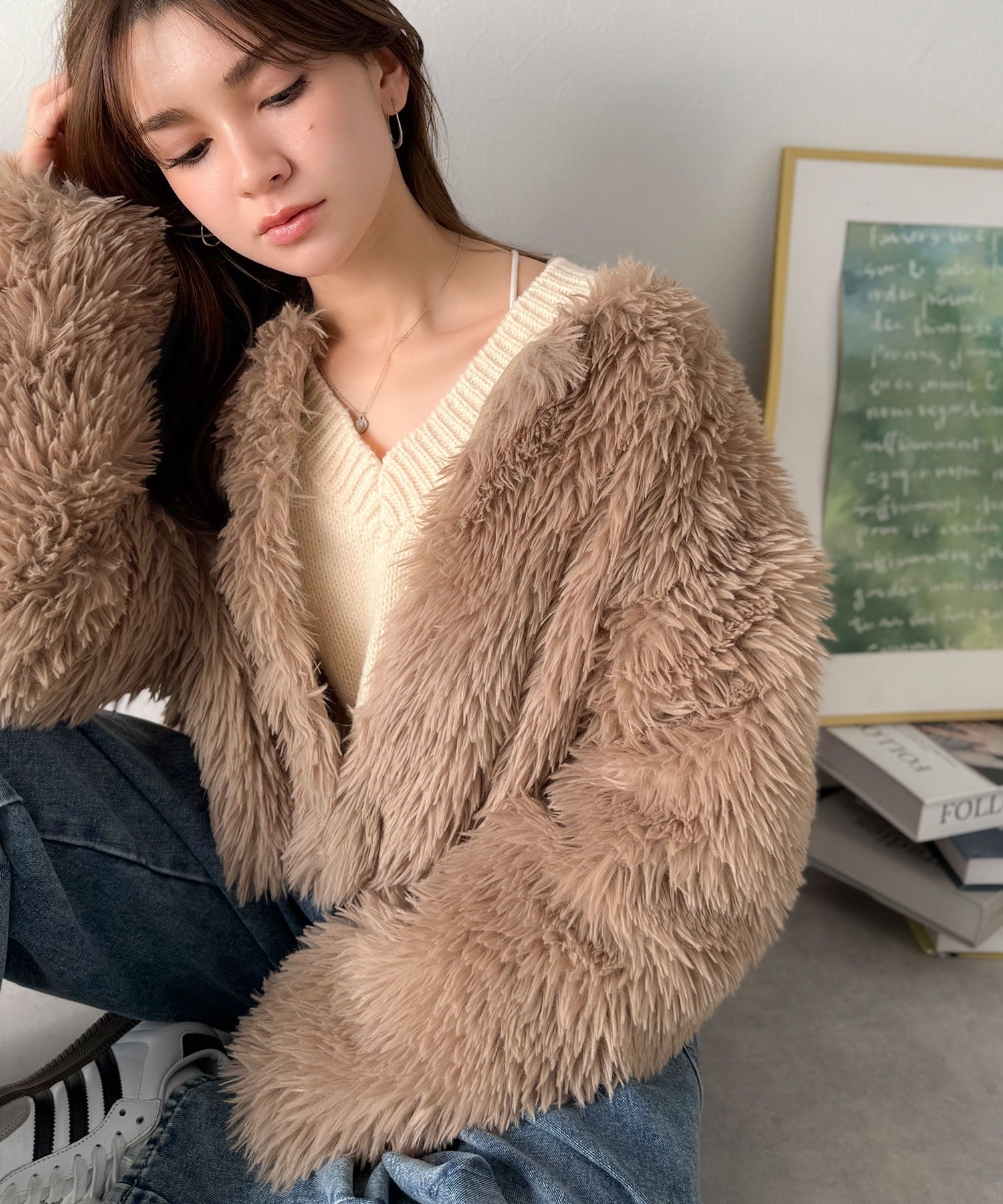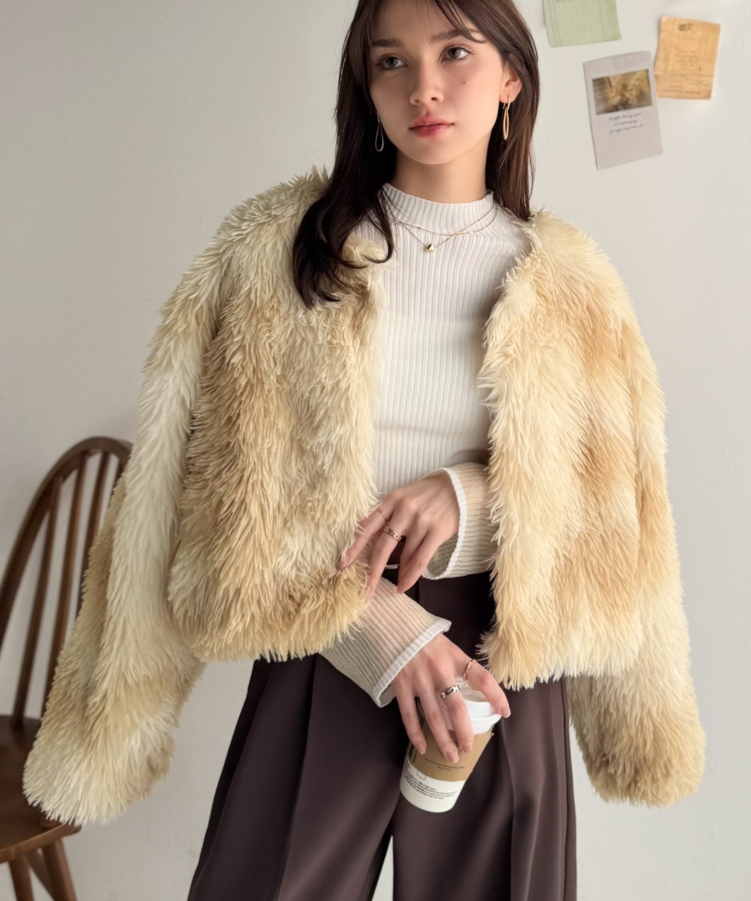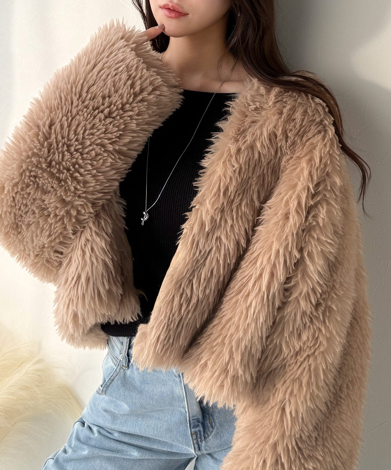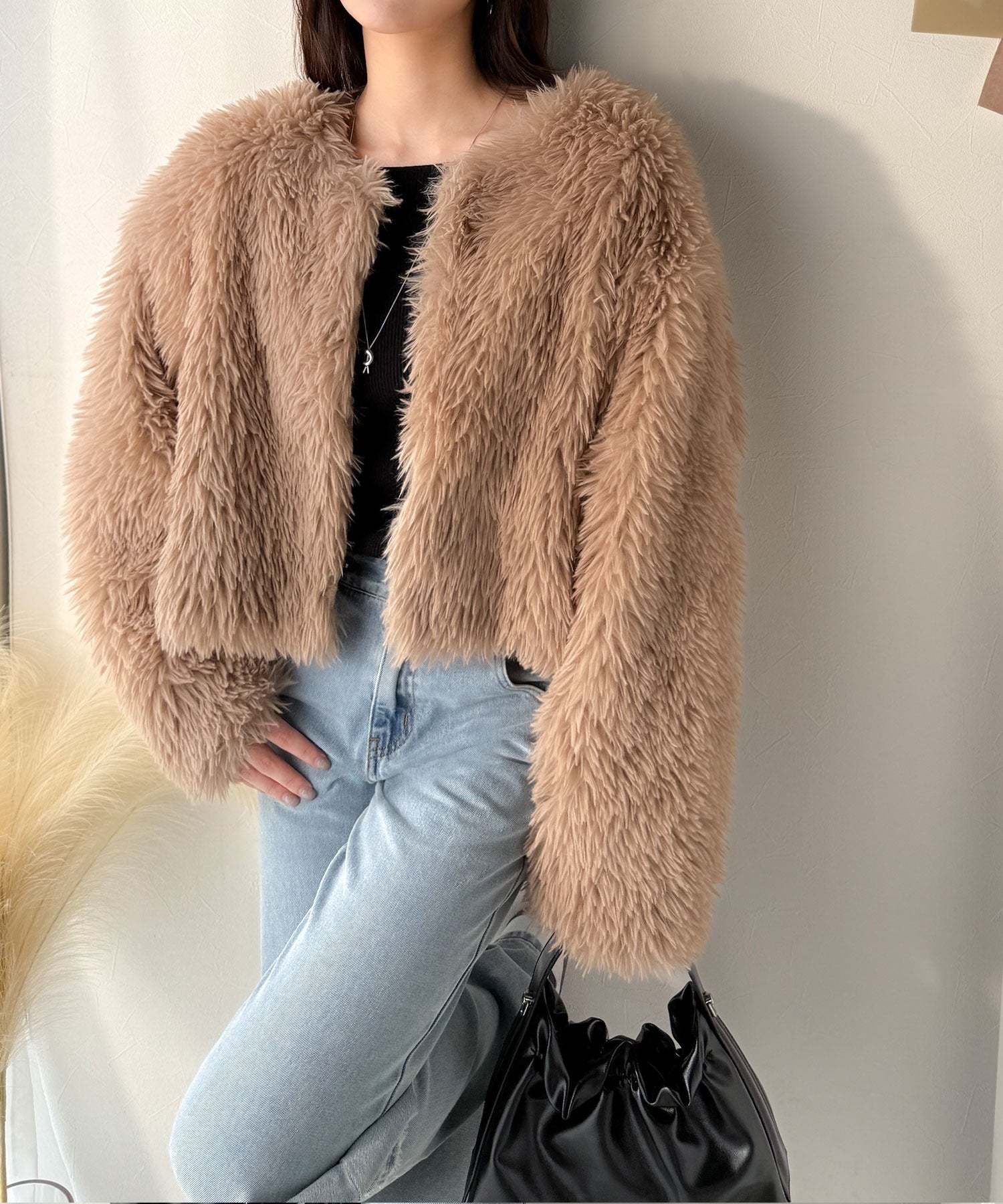 《AYA×クラシカルエルフコラボ》品なノーカラーショートファーコート。ノーカラーショートファーコート ce1010522