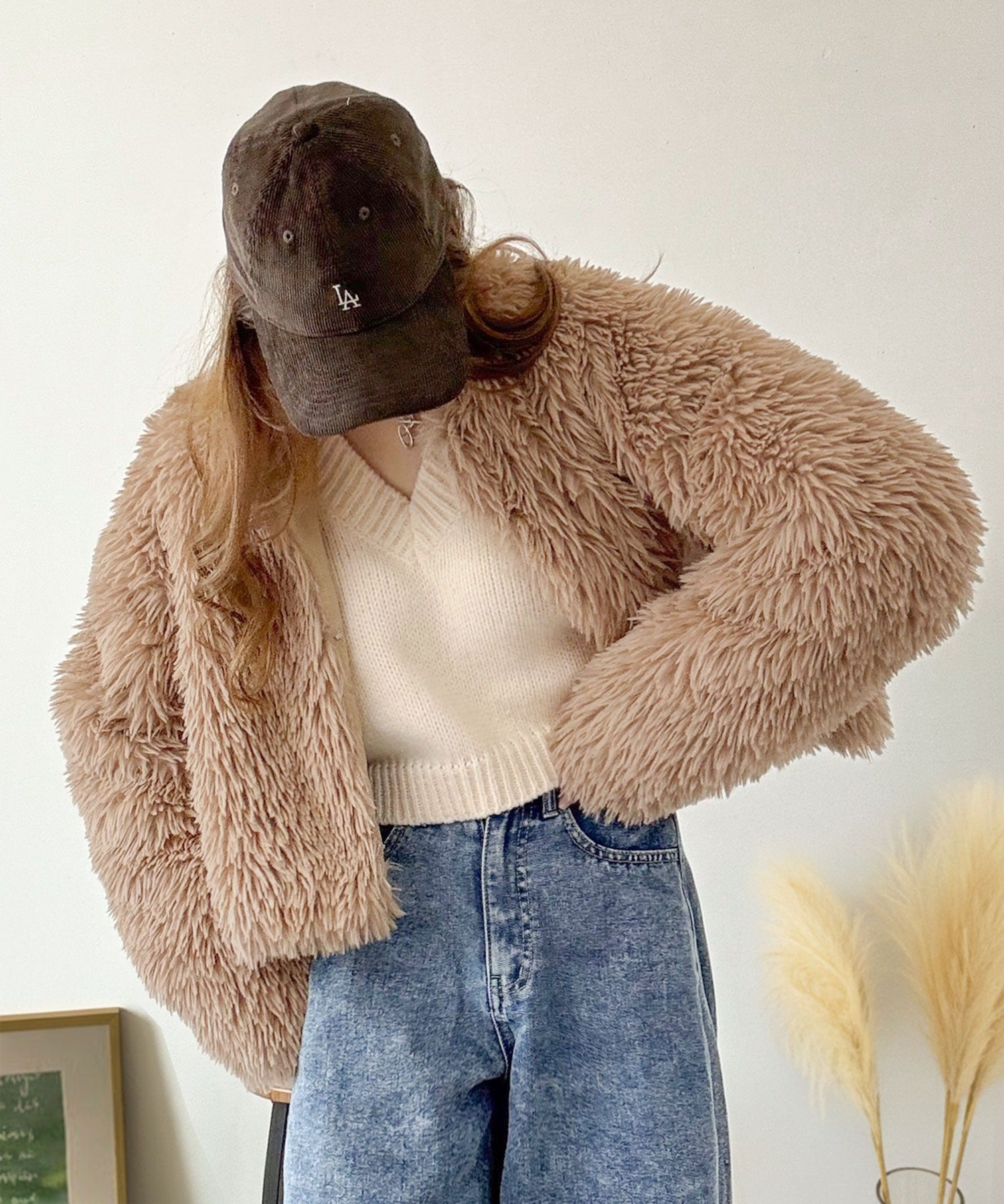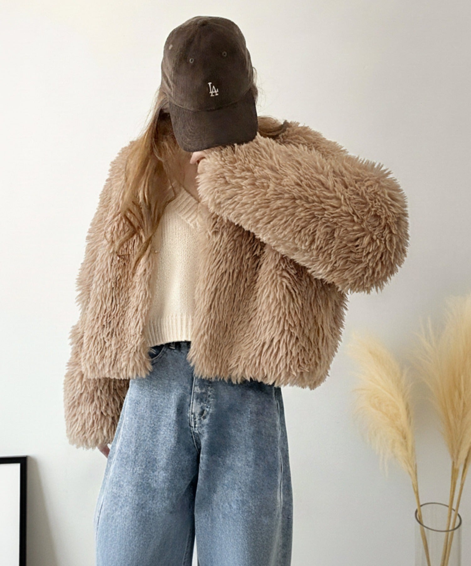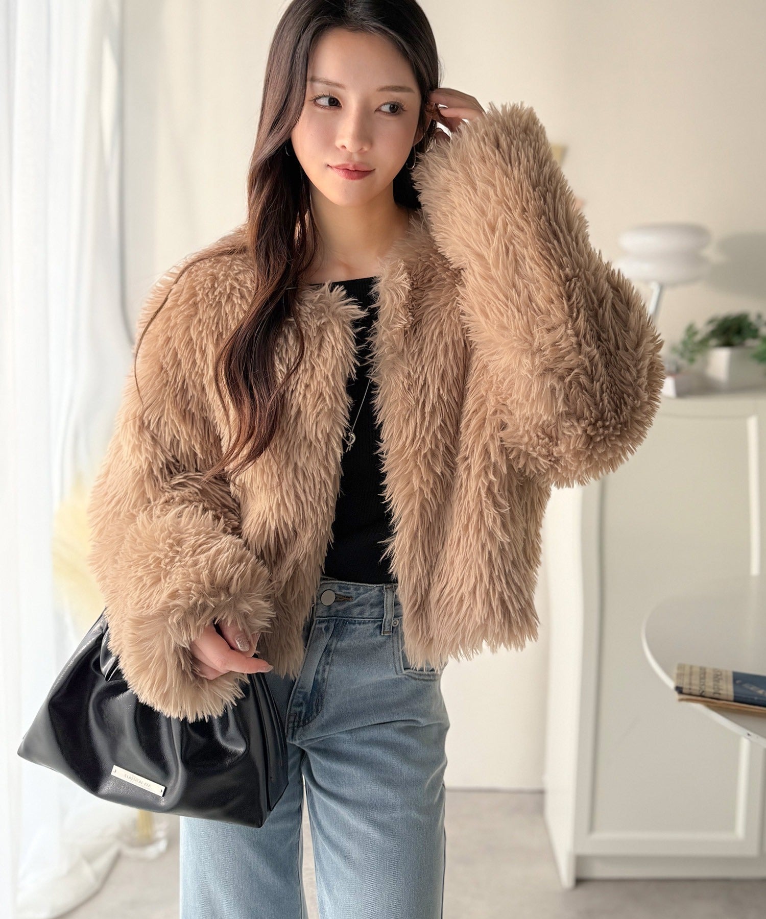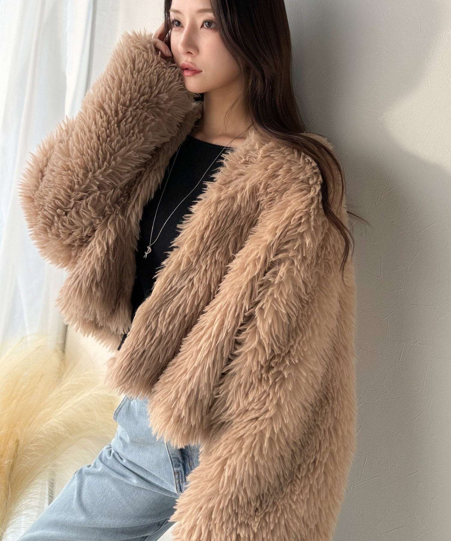 新しい魅力を引き出す、上品なノーカラーショートファーコート。