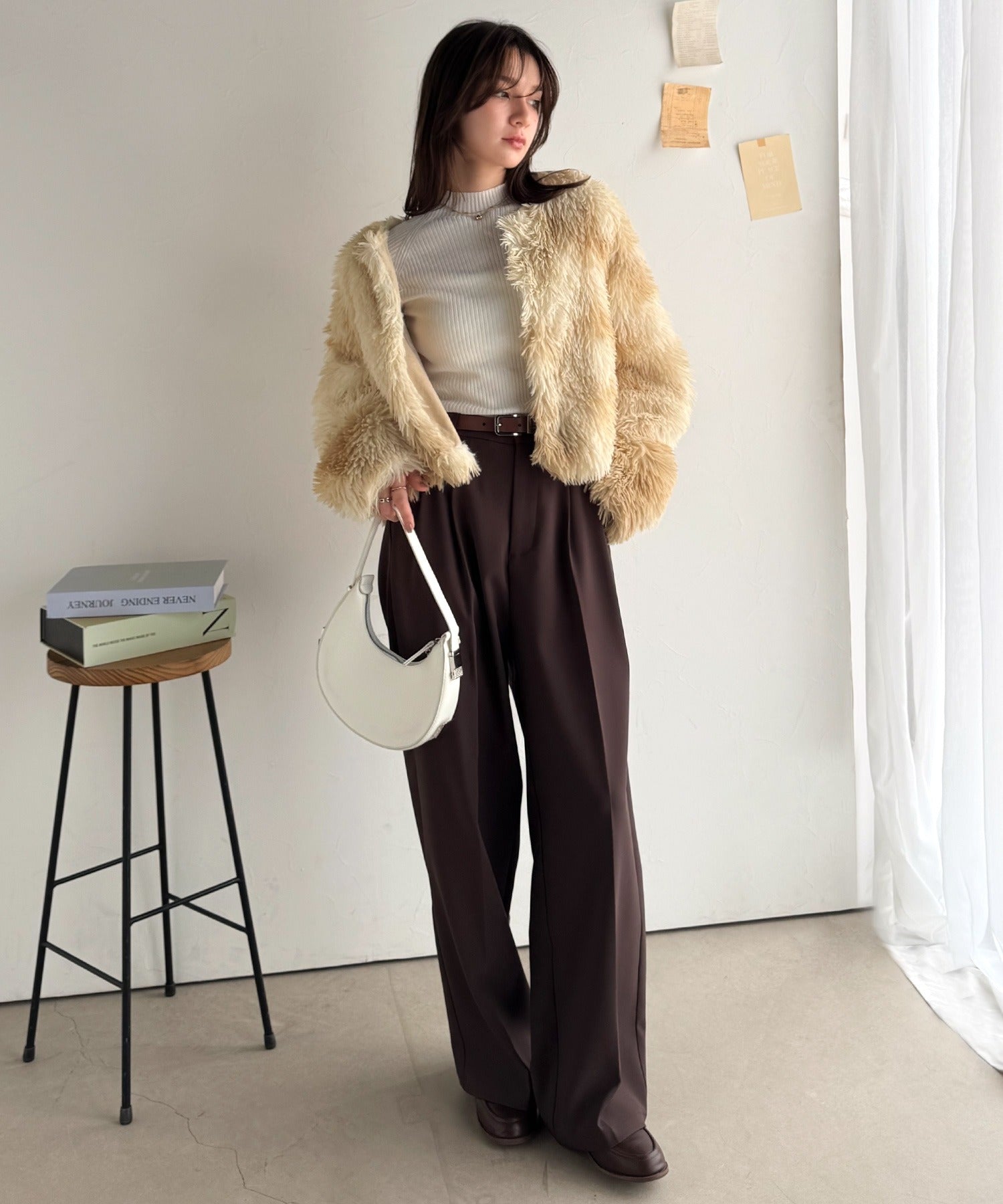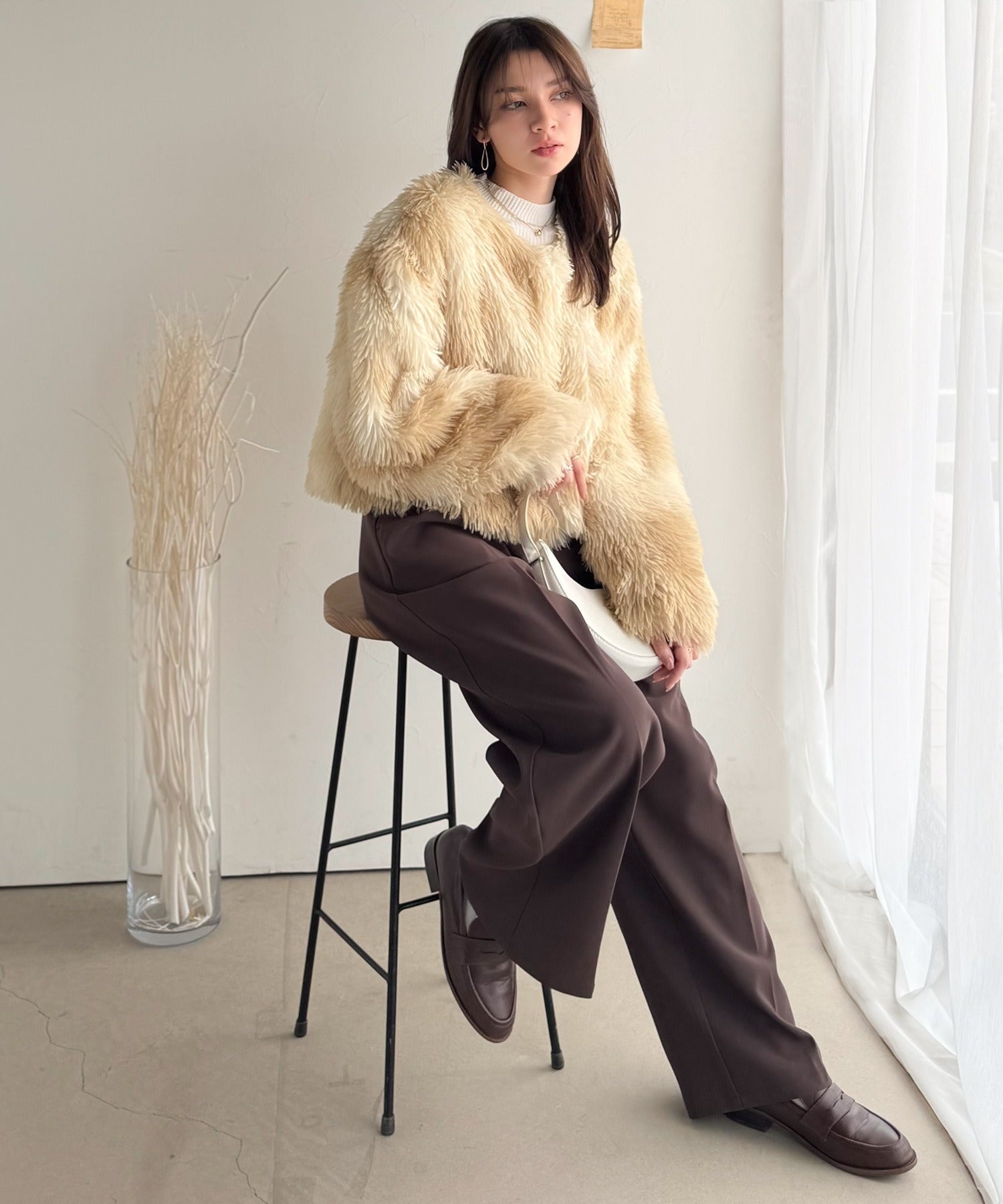 華やかなフェイクファーを使用し、上品でありながらもカジュアルにも着こなせるアイテムです。