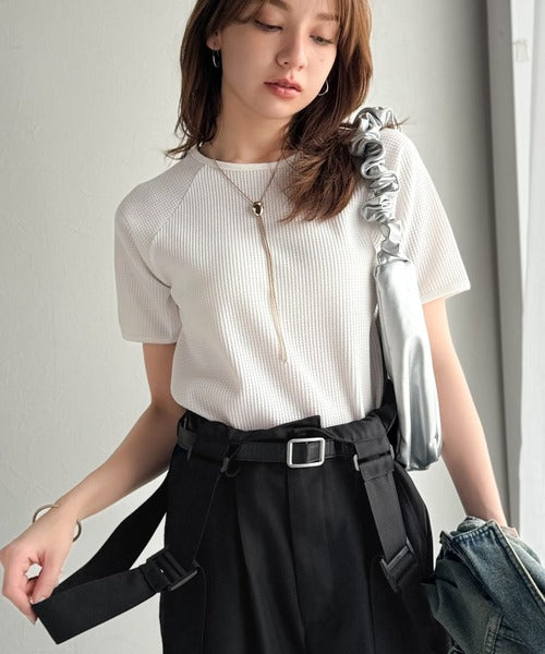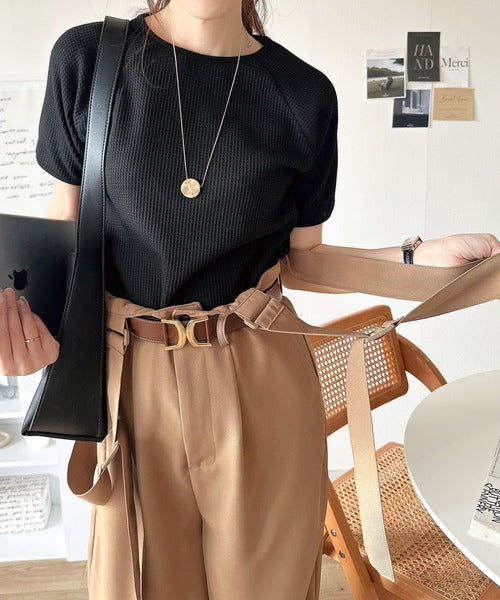 きれいめな落ち感素材と、ウエストマークのベルトデザインが主役。