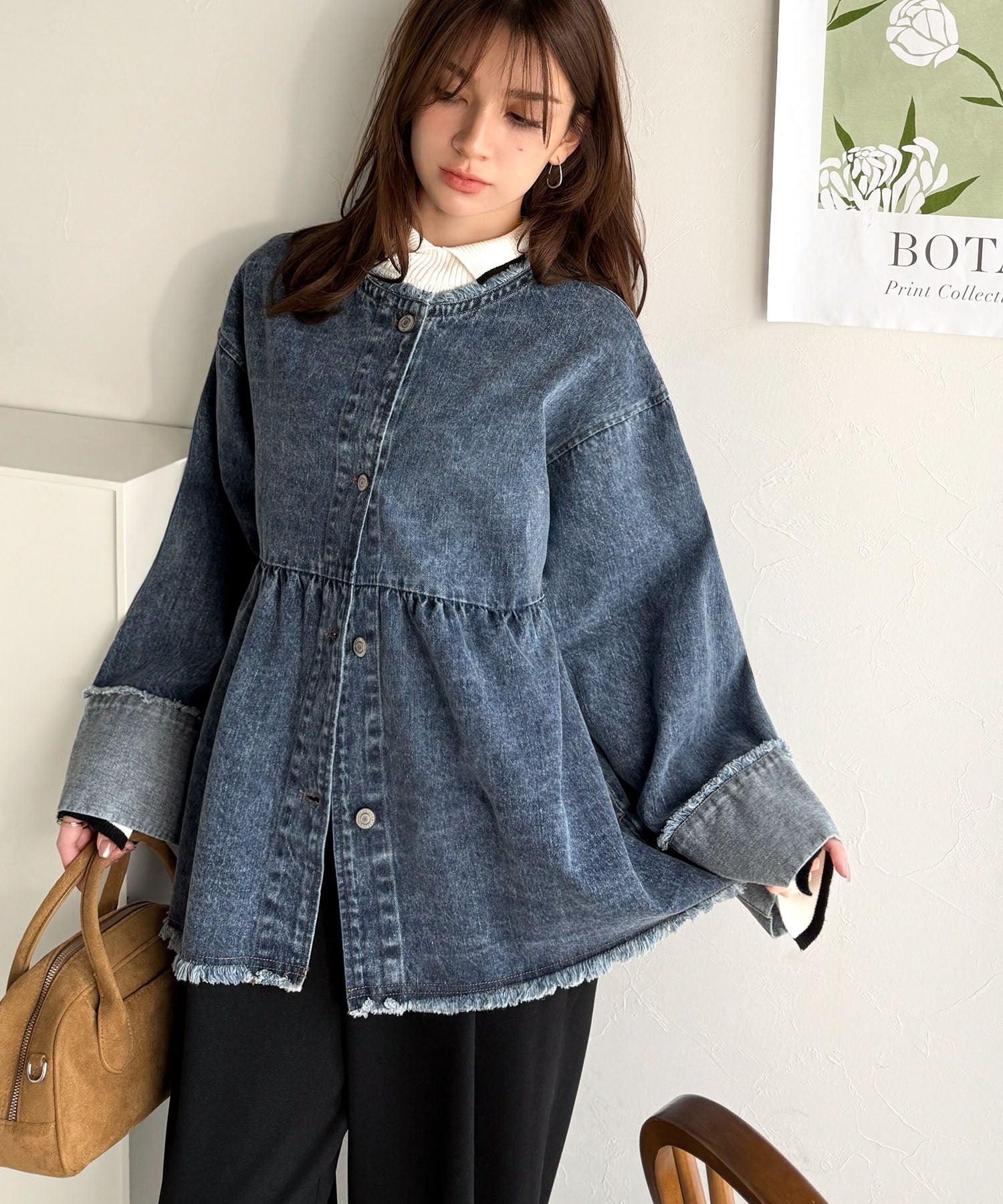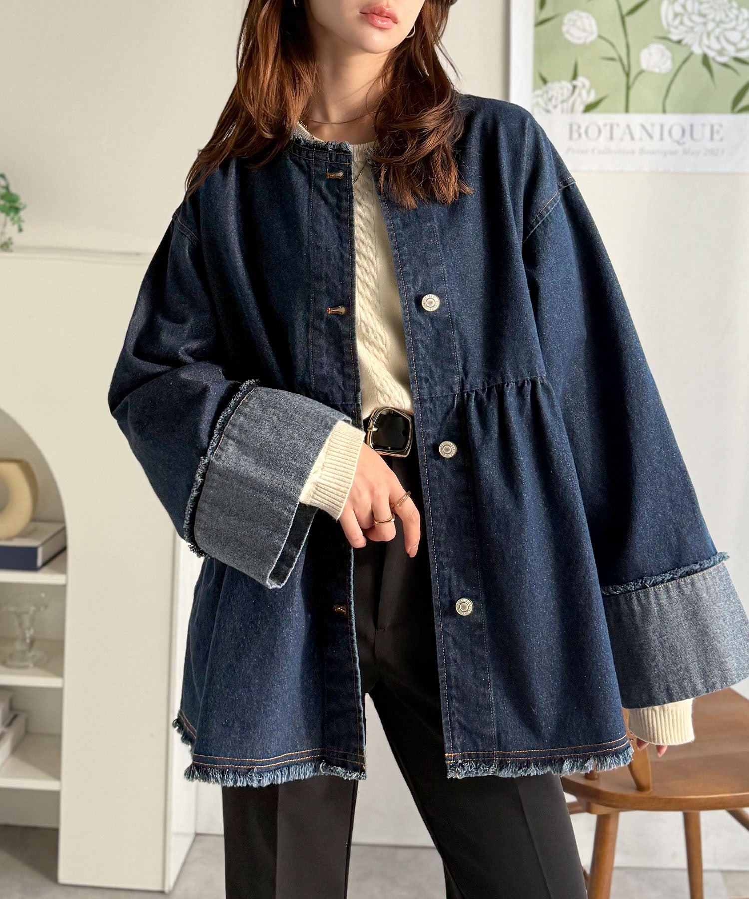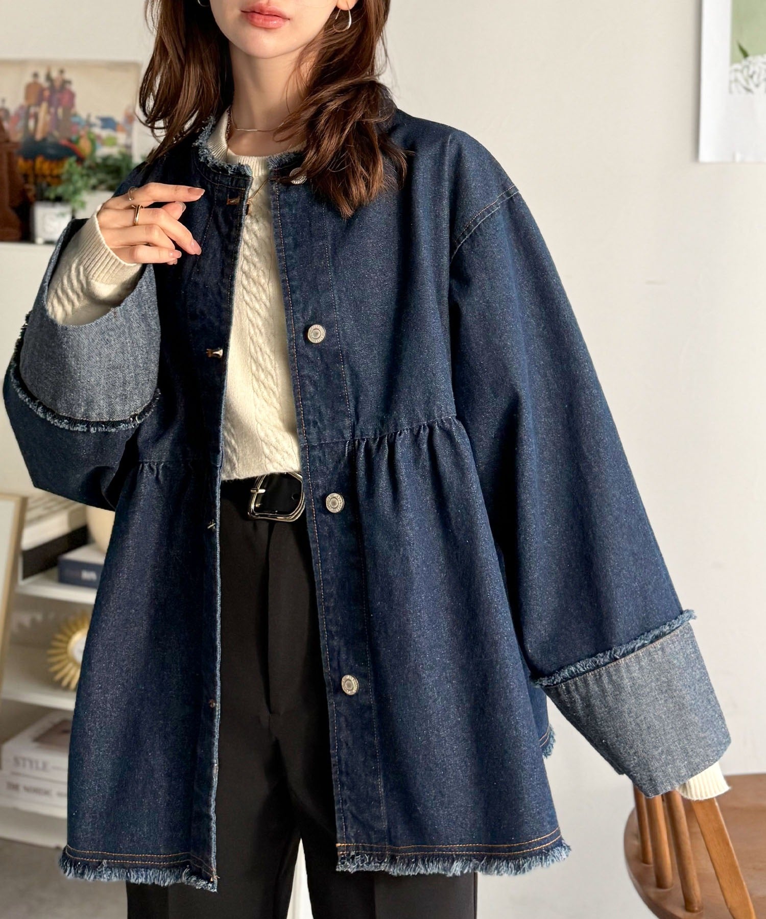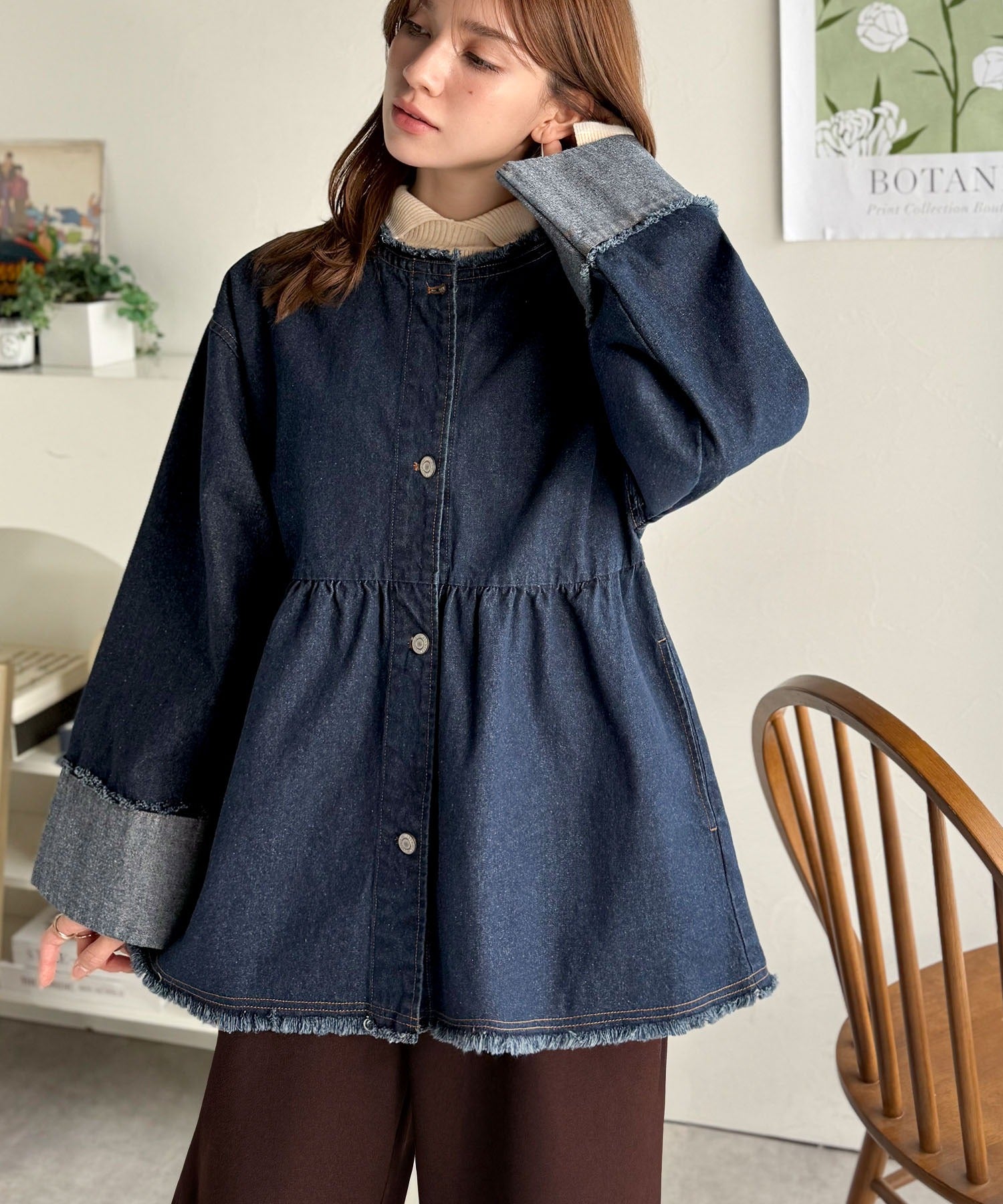 《daaco×クラシカルエルフコラボ》フリンジ×デニムの最強コンビ!綿100%ペプラムノーカラーデニムジャケット ce1010515