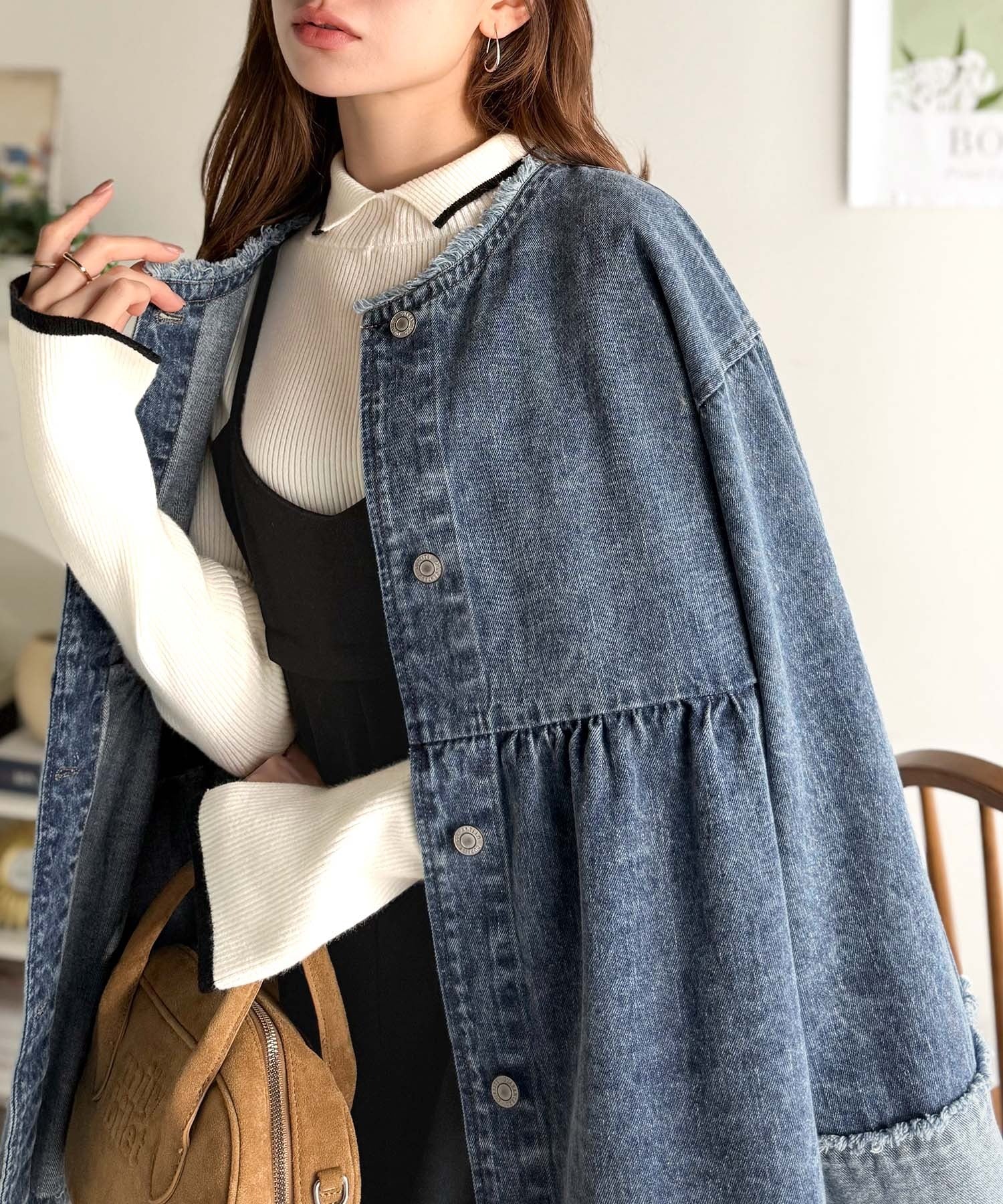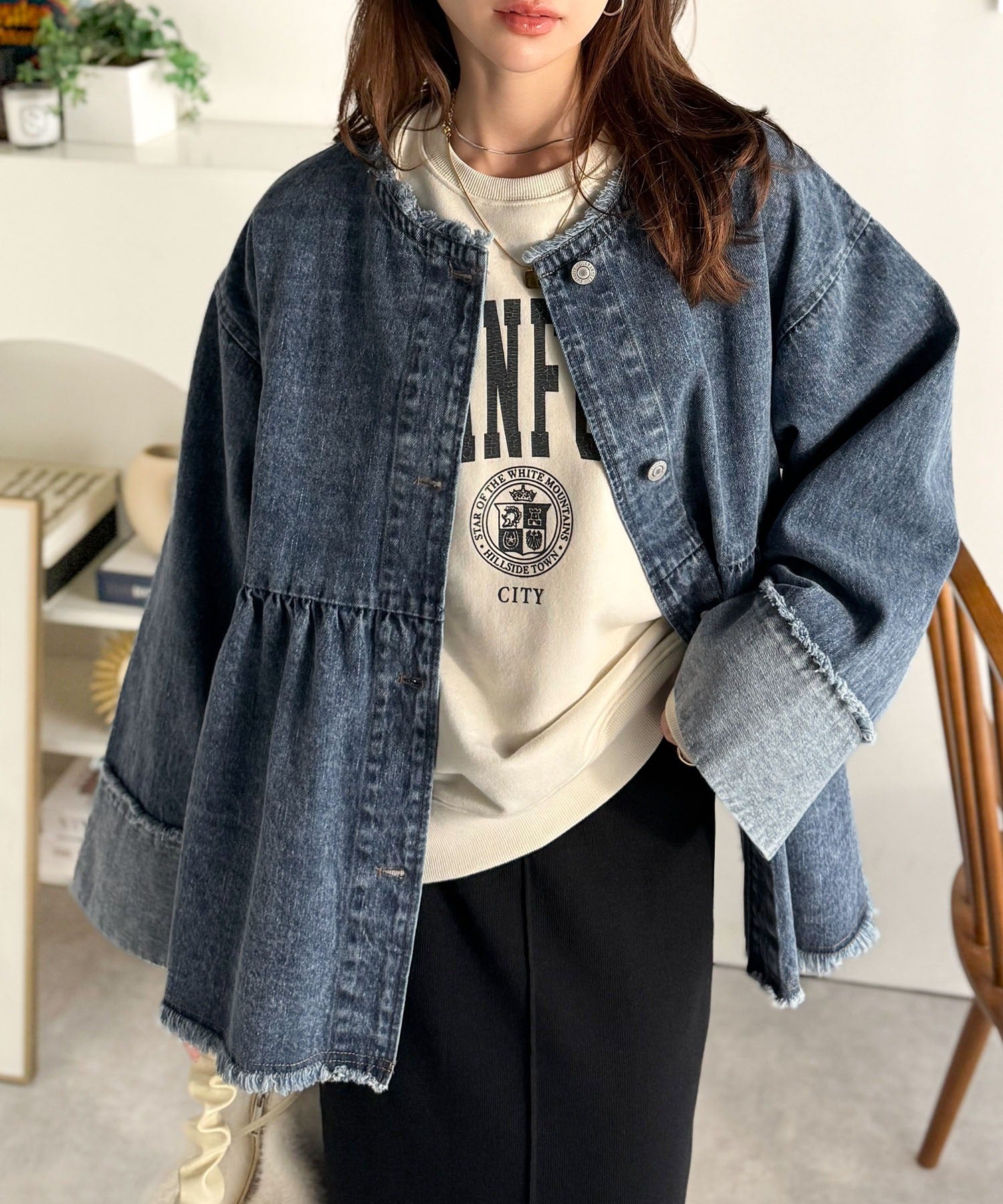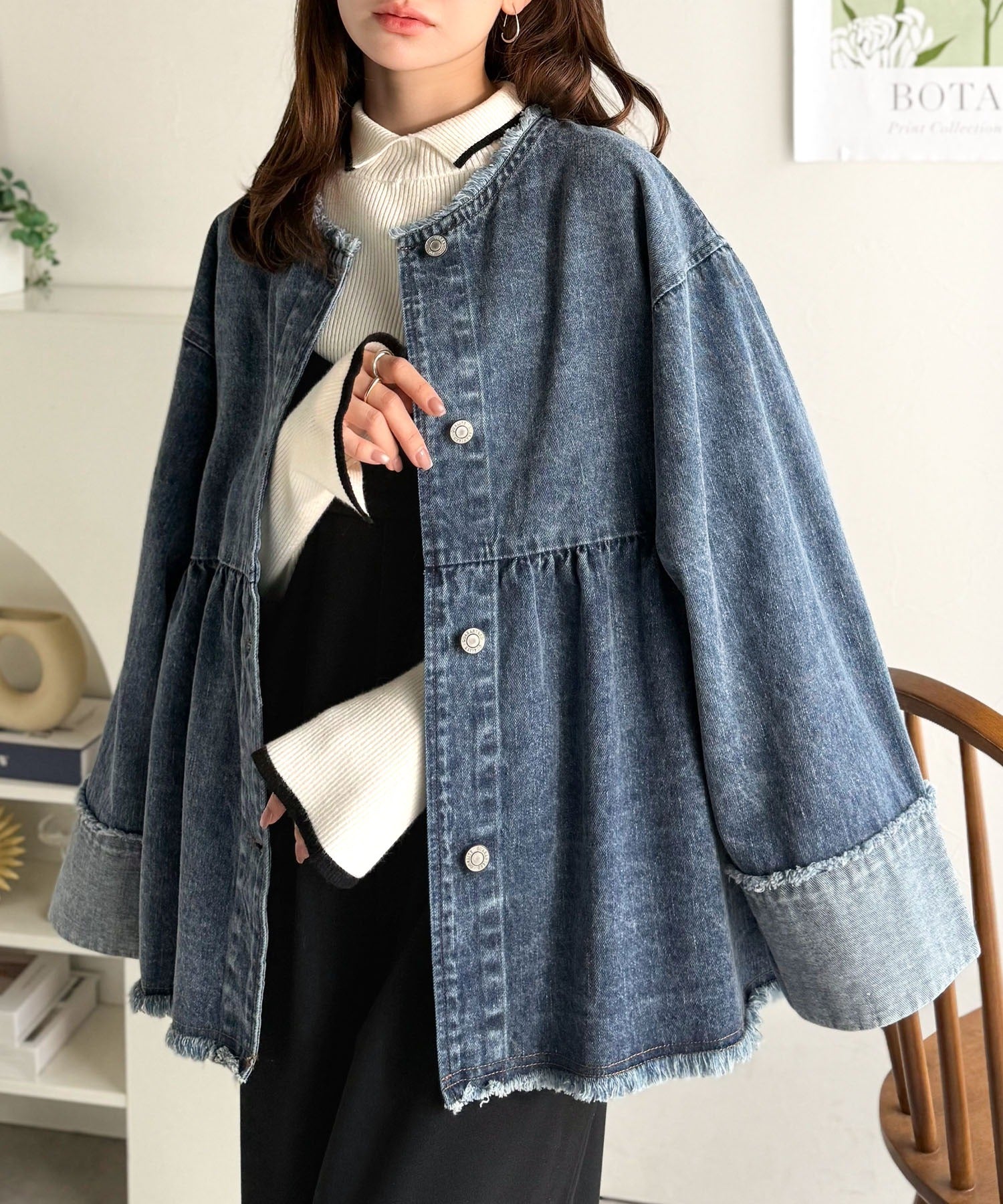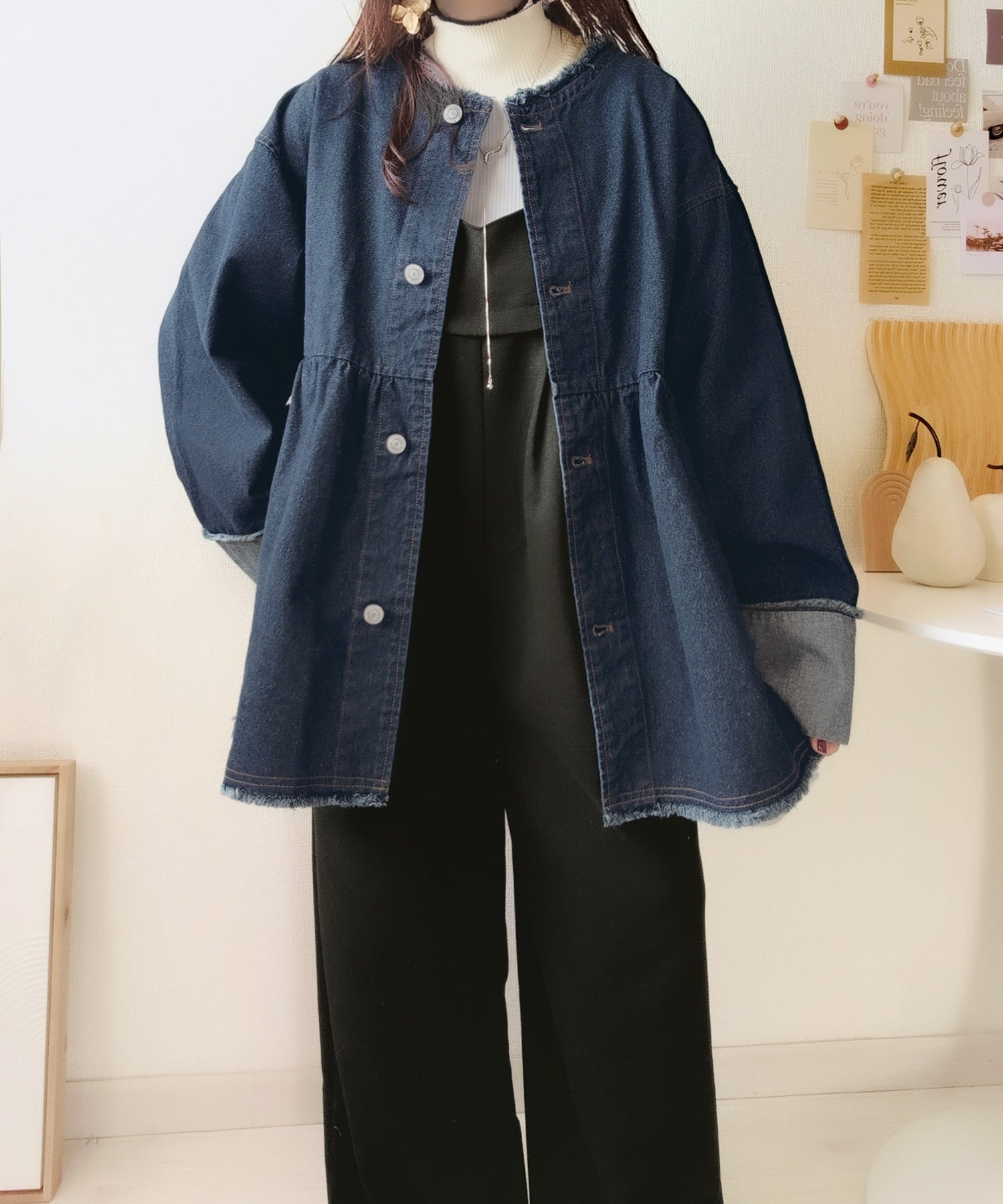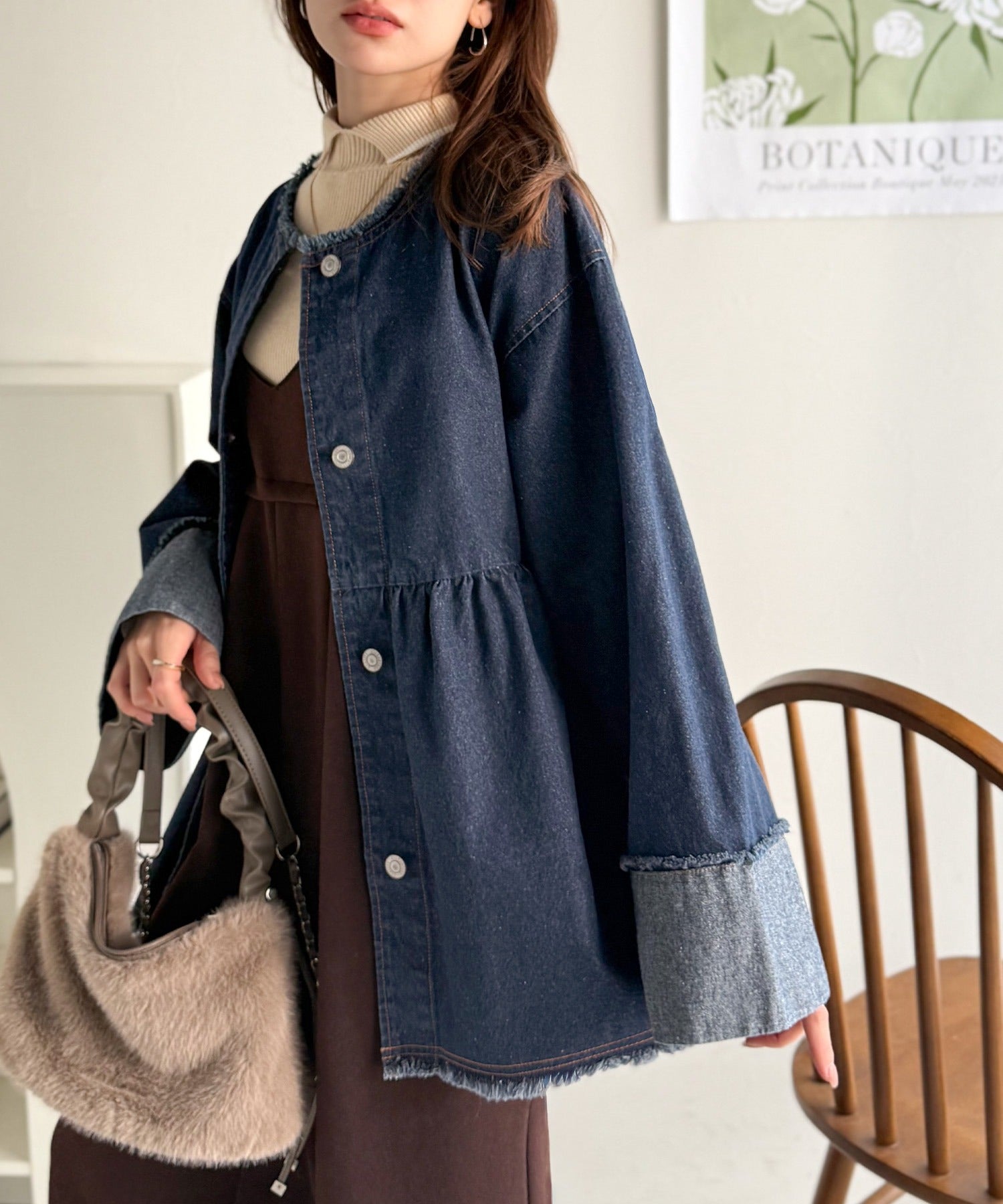 《daaco×クラシカルエルフコラボ》フリンジ×デニムの最強コンビ!綿100%ペプラムノーカラーデニムジャケット ce1010515