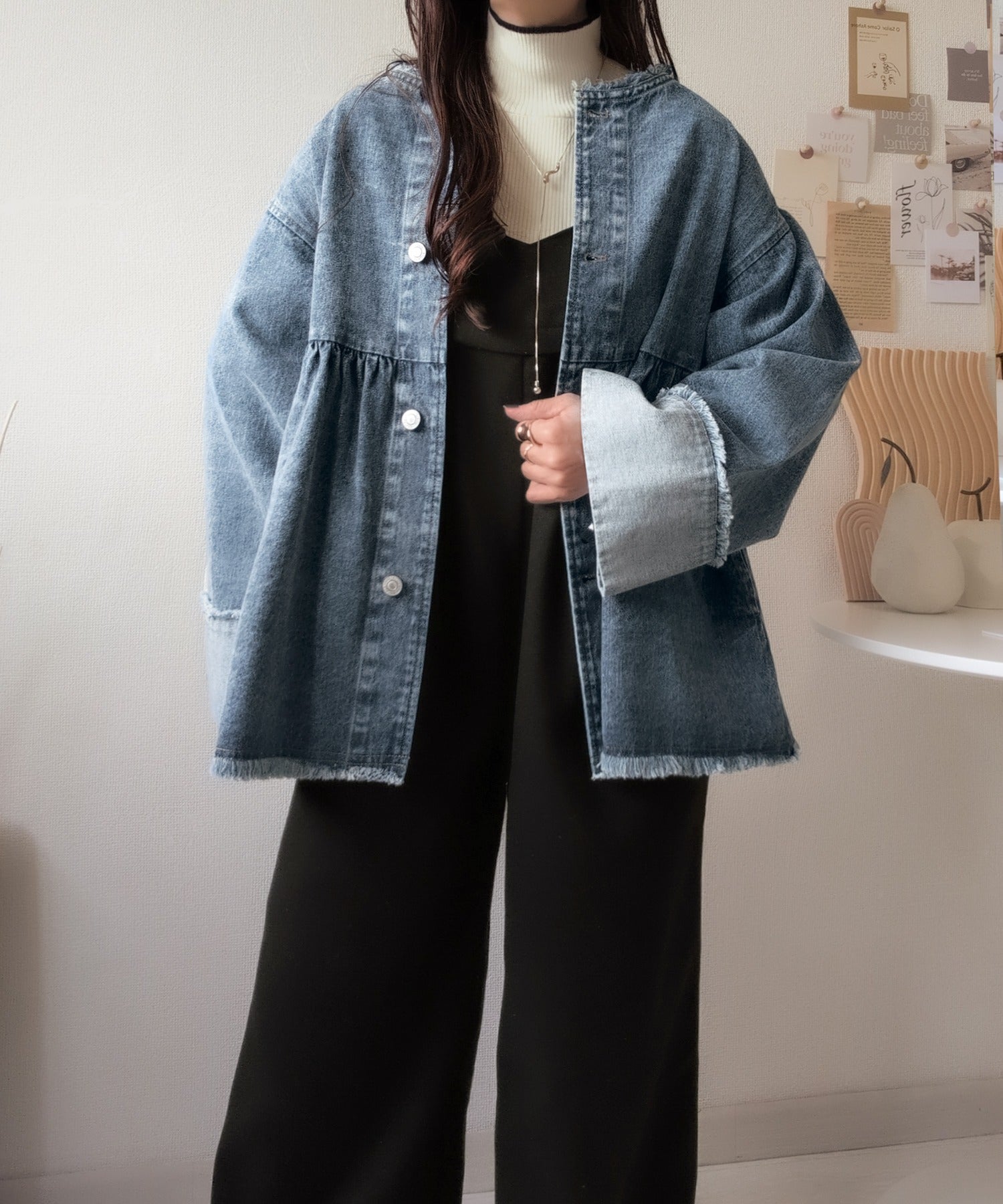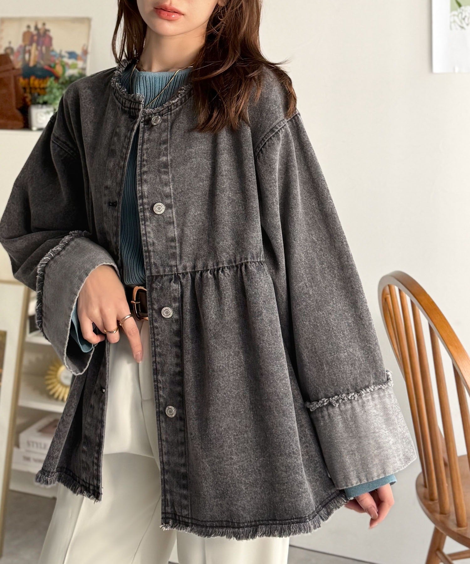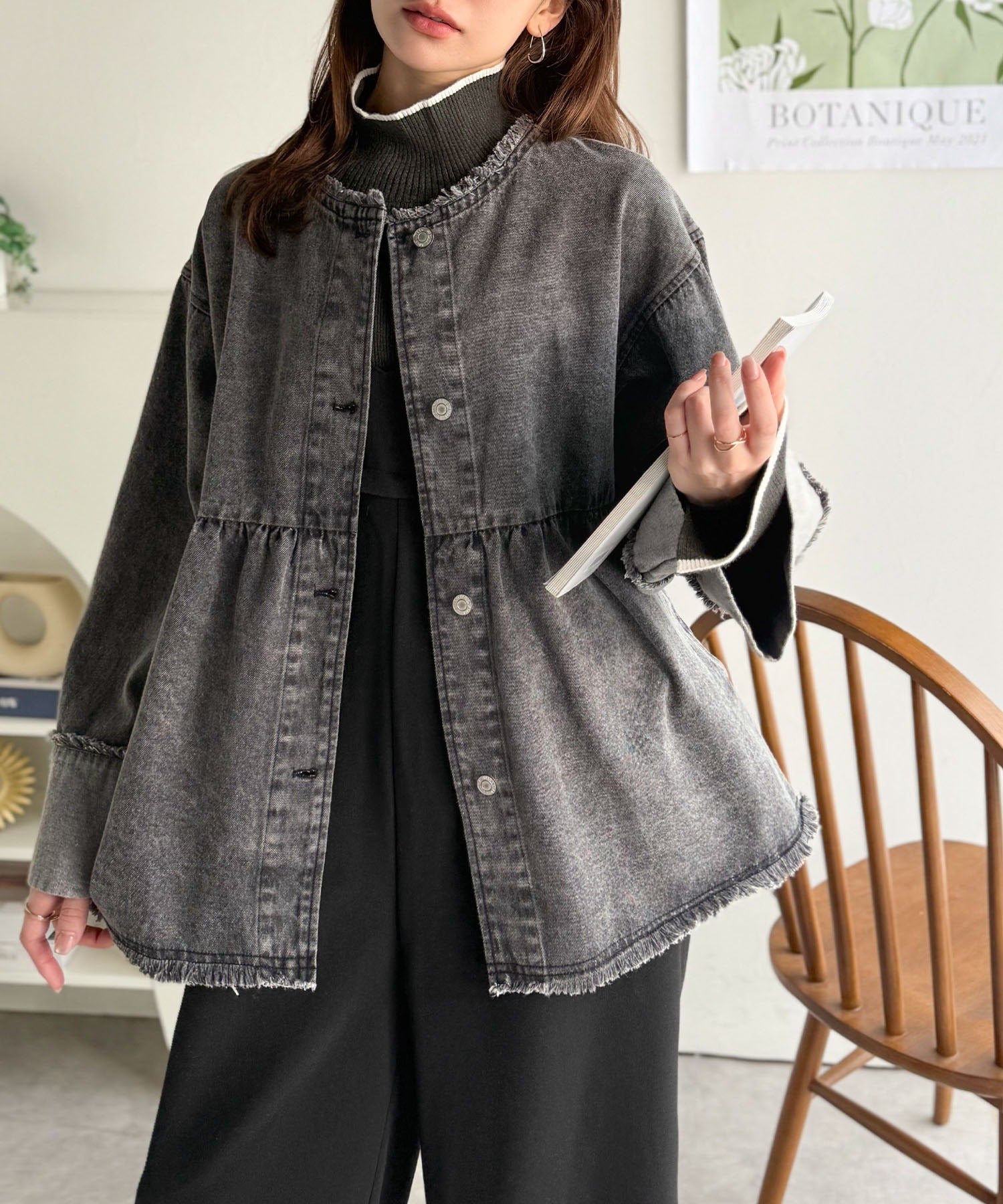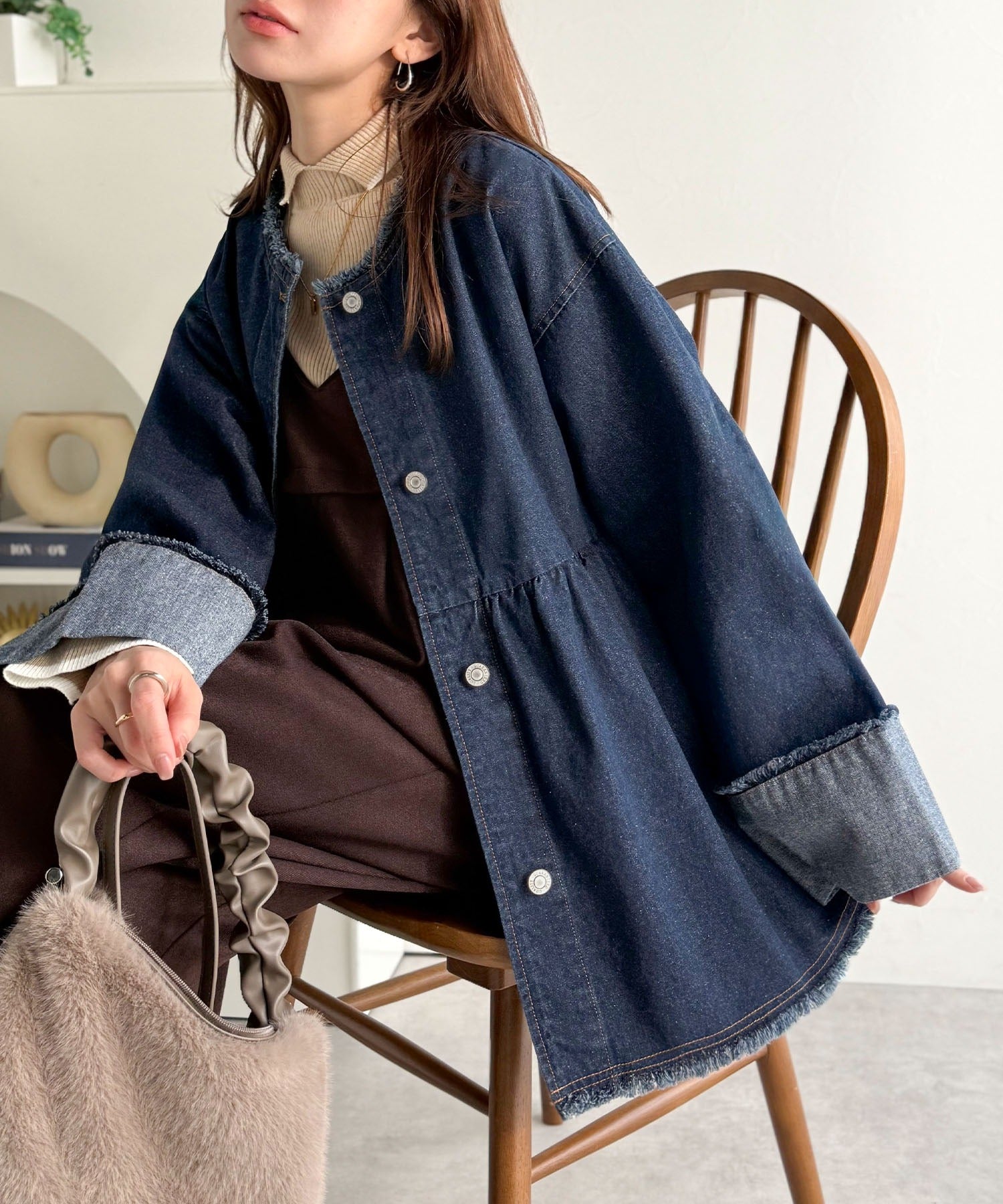 《daaco×クラシカルエルフコラボ》フリンジ×デニムの最強コンビ!綿100%ペプラムノーカラーデニムジャケット ce1010515