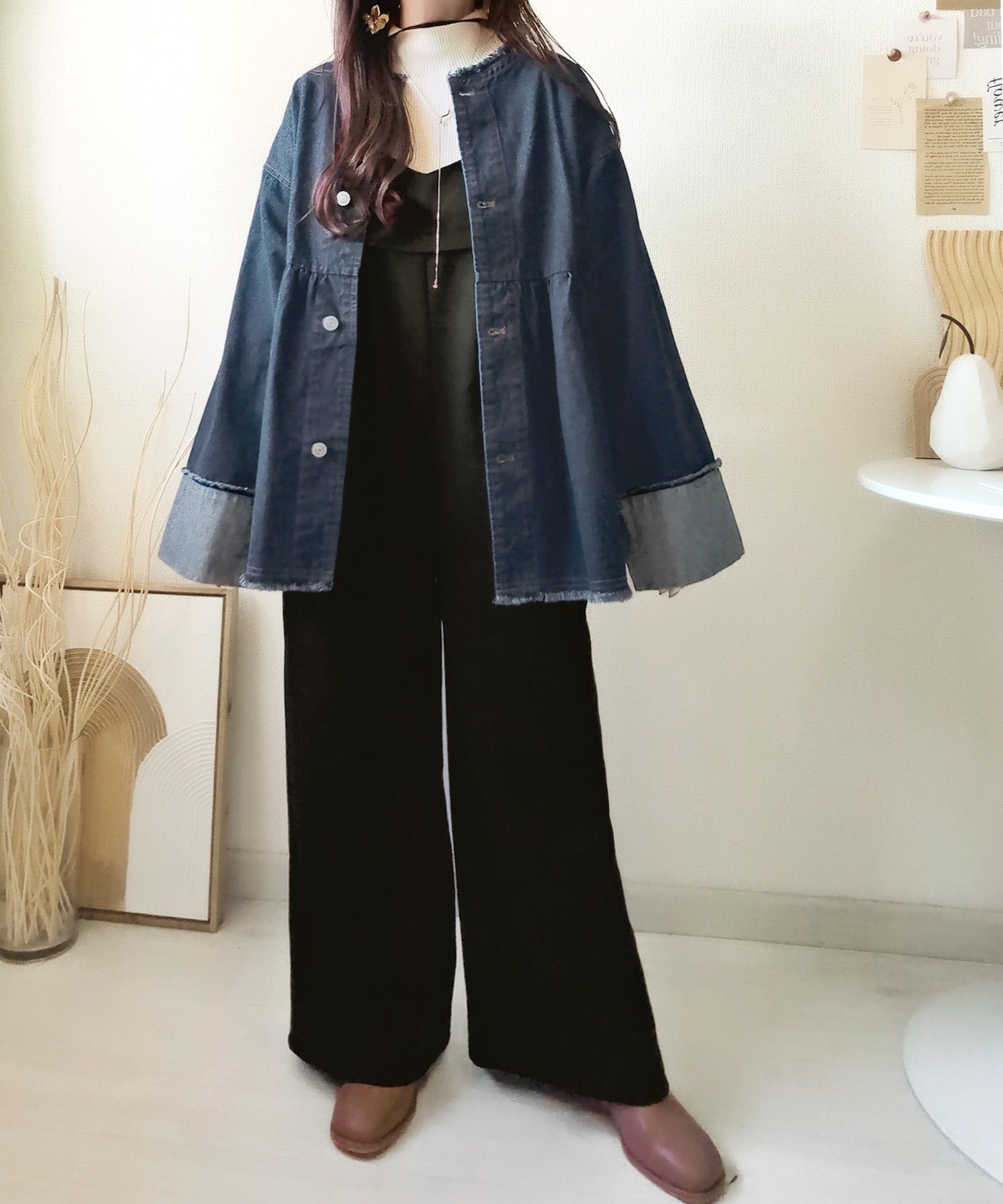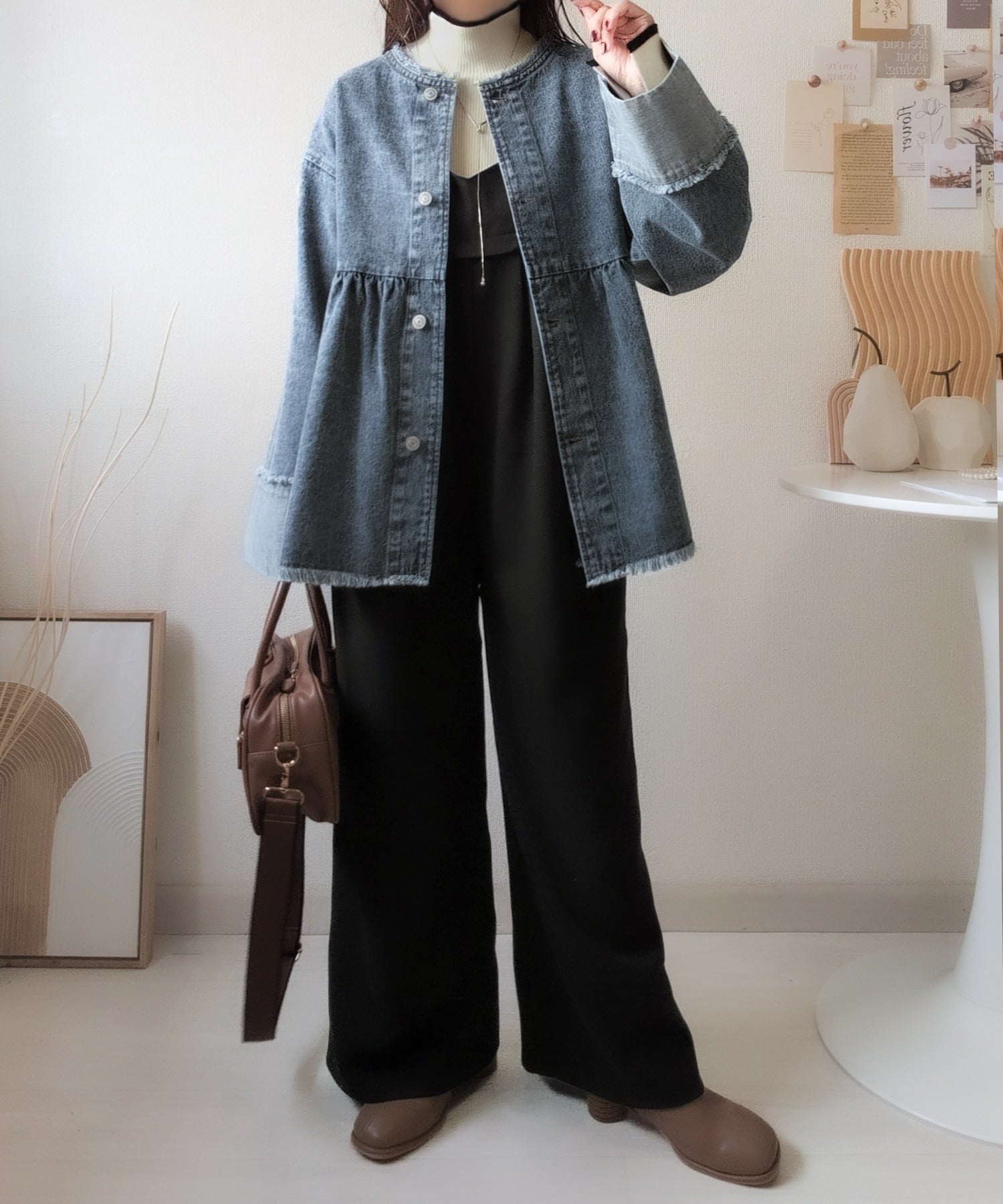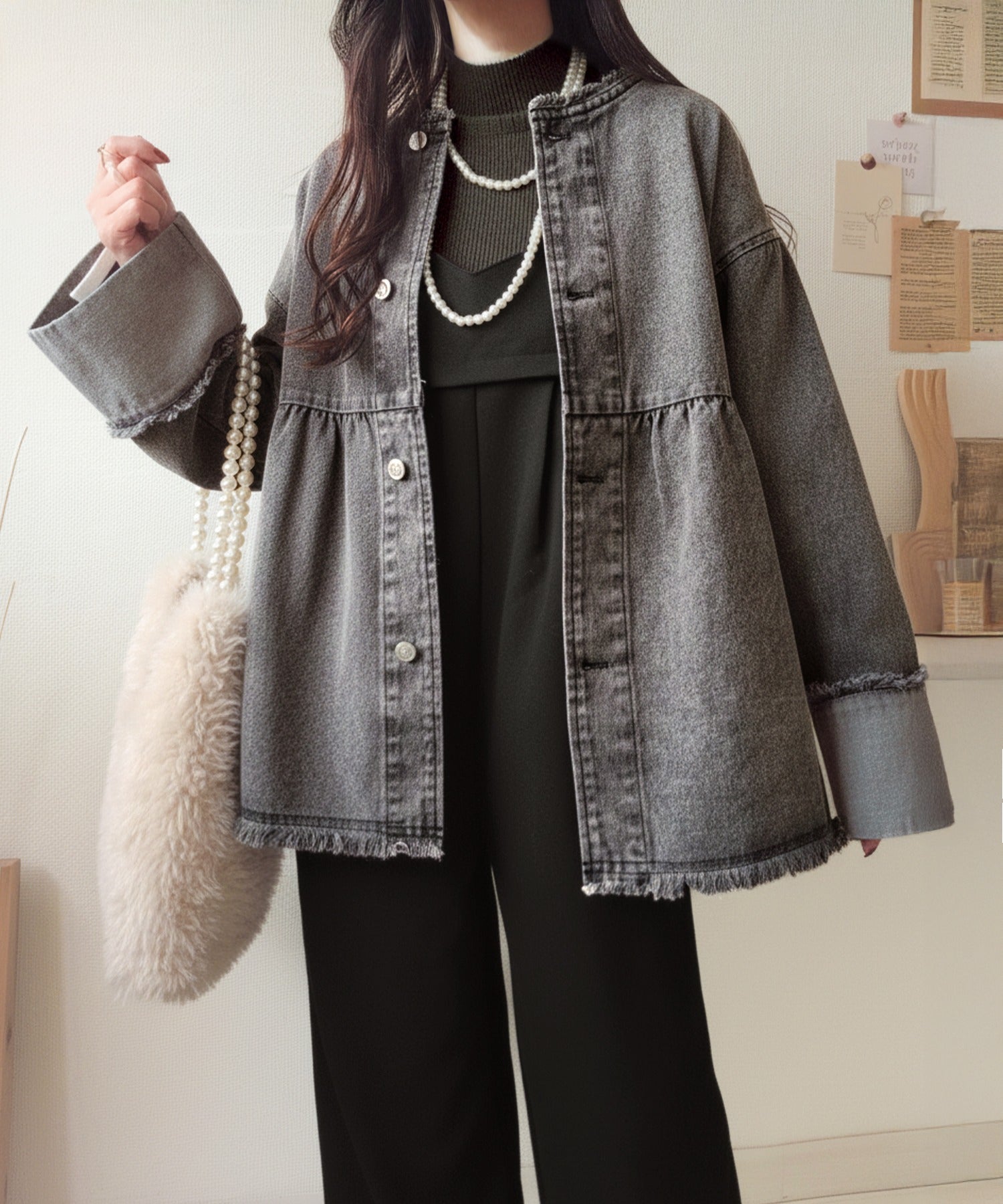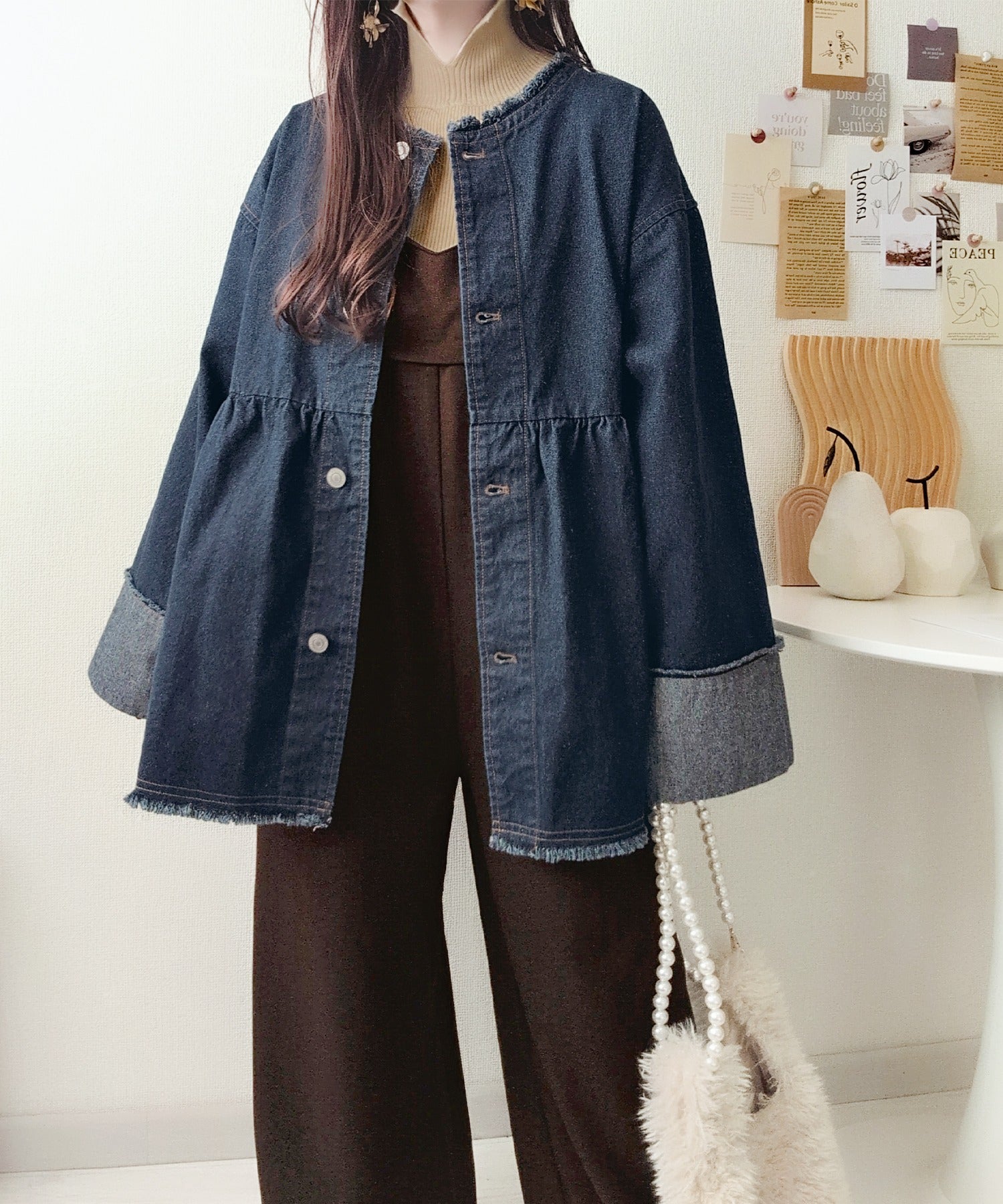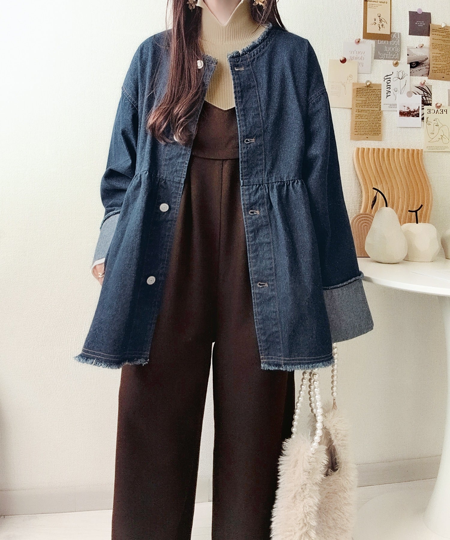 《daaco×クラシカルエルフコラボ》フリンジ×デニムの最強コンビ!綿100%ペプラムノーカラーデニムジャケット ce1010515