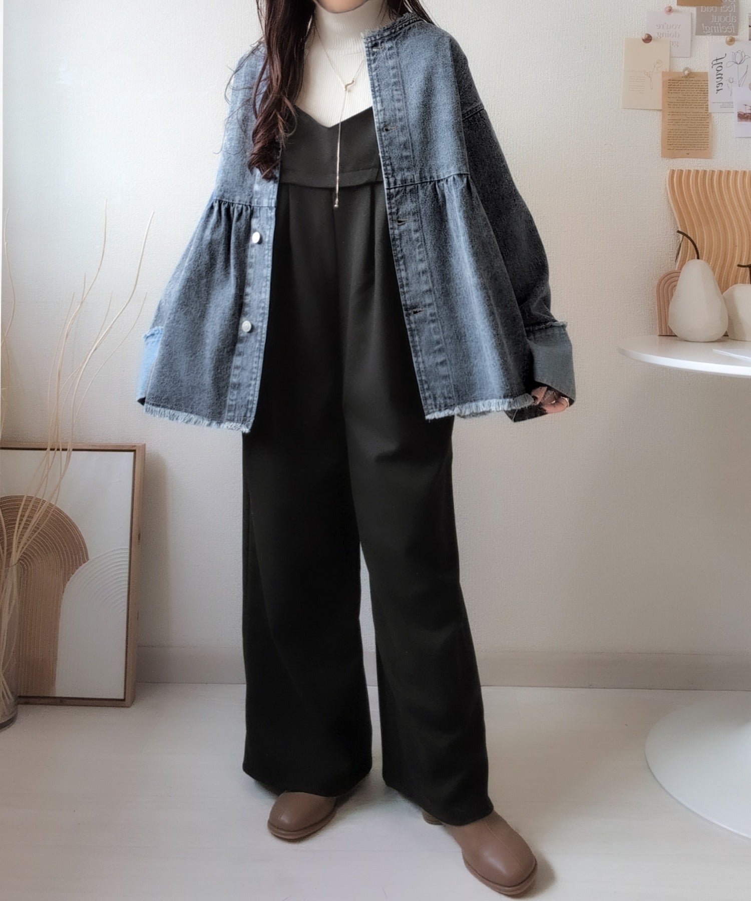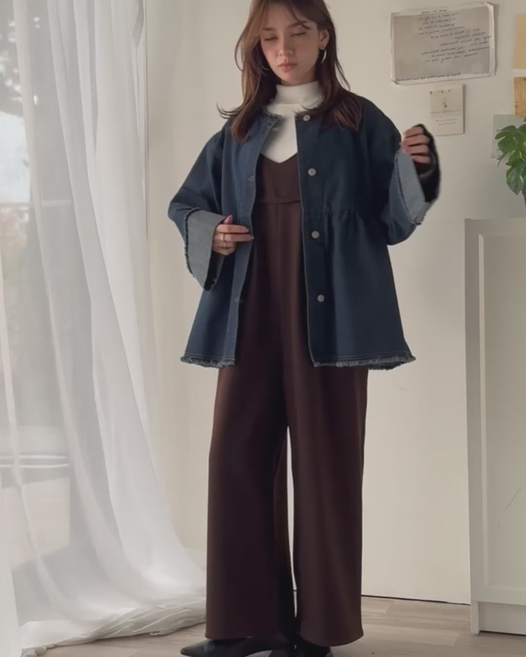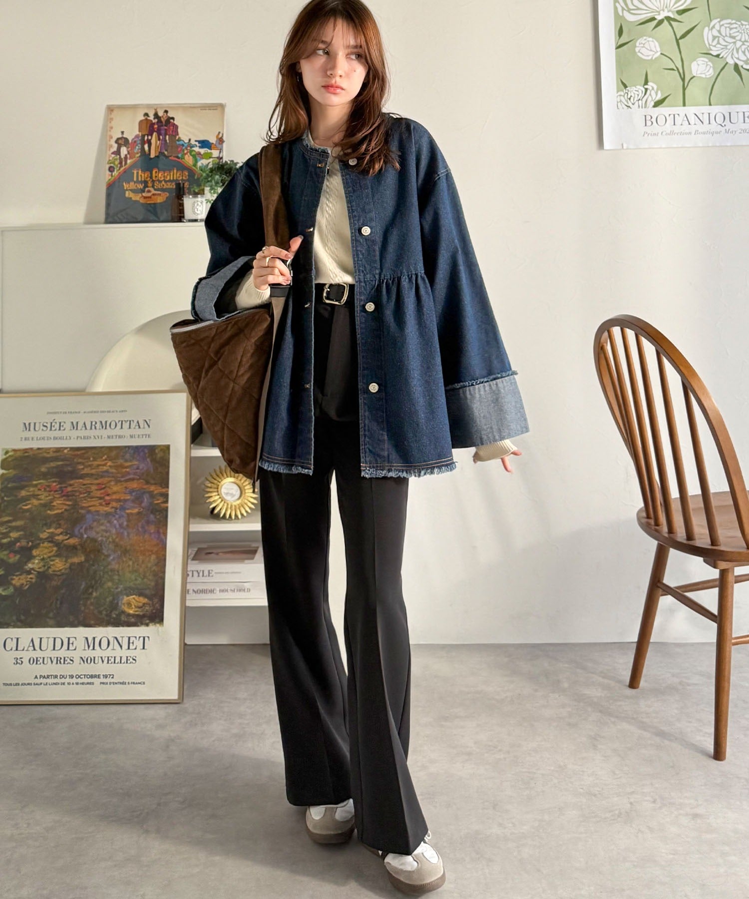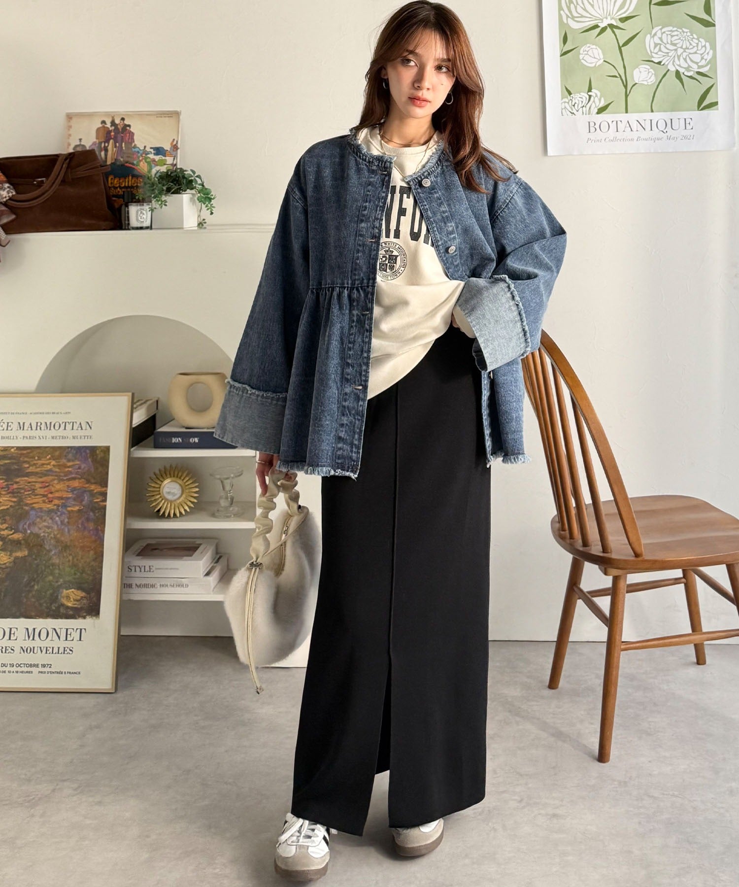 《daaco×クラシカルエルフコラボ》フリンジ×デニムの最強コンビ!綿100%ペプラムノーカラーデニムジャケット ce1010515