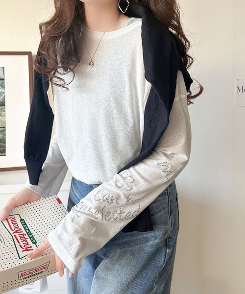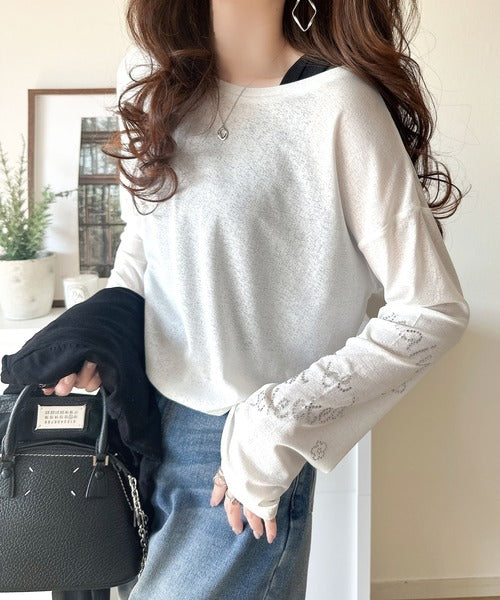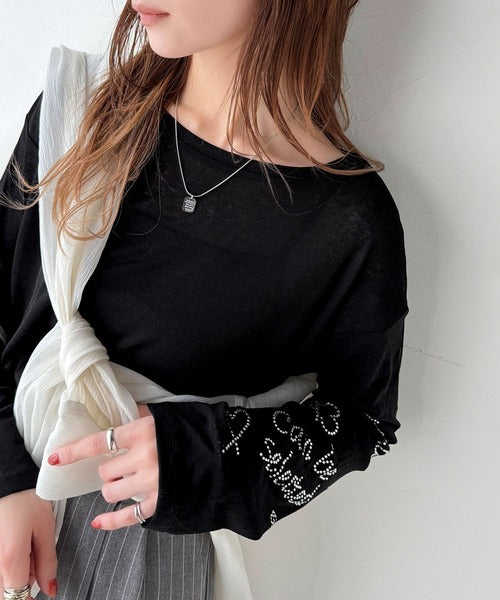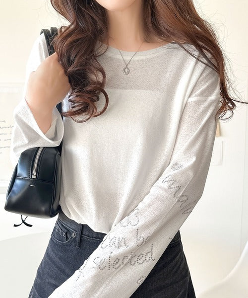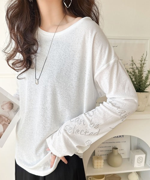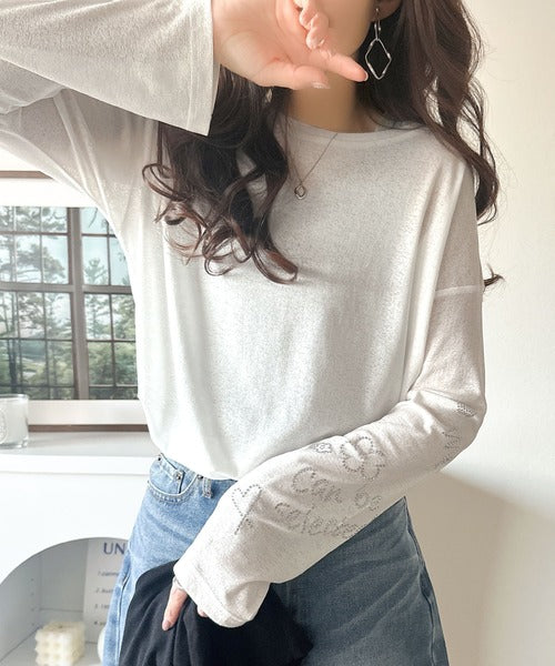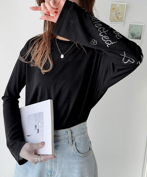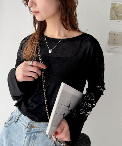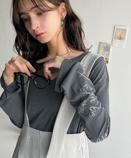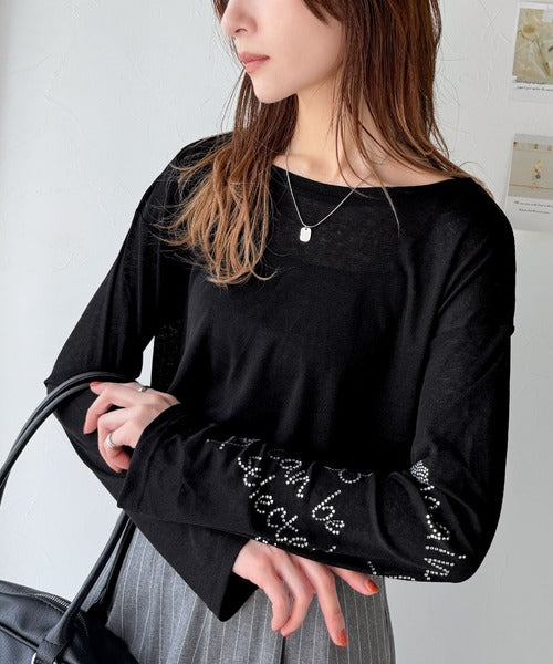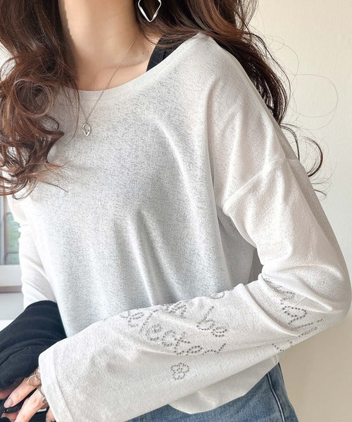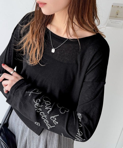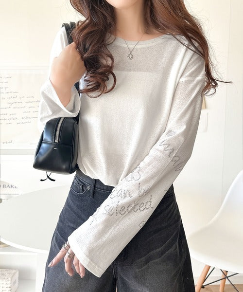 きらめきを纏う。ロゴとフラワーモチーフ袖ラインストーン付きシアー長袖トップ(フレアスリーブ) ce1010422