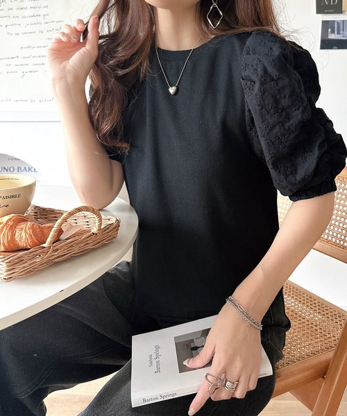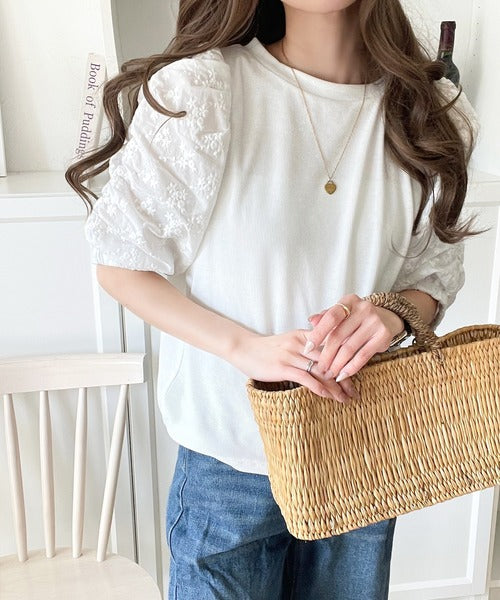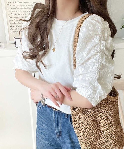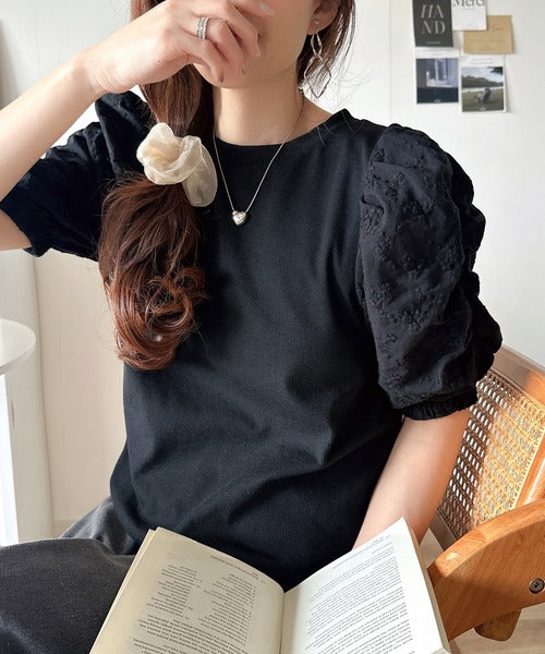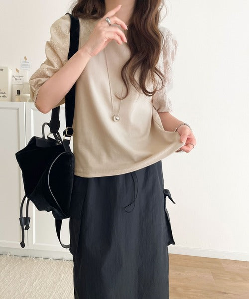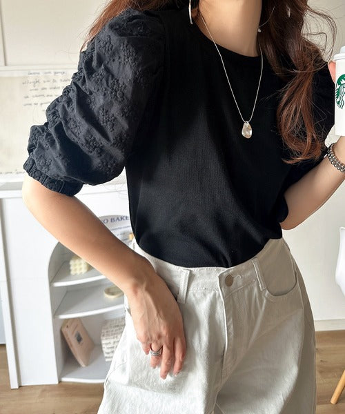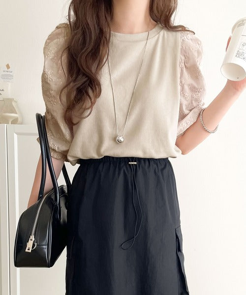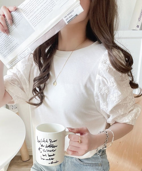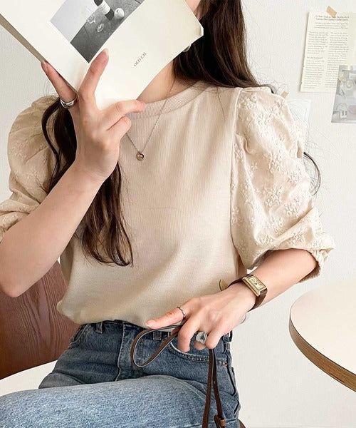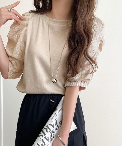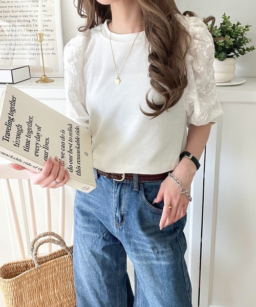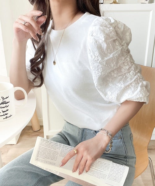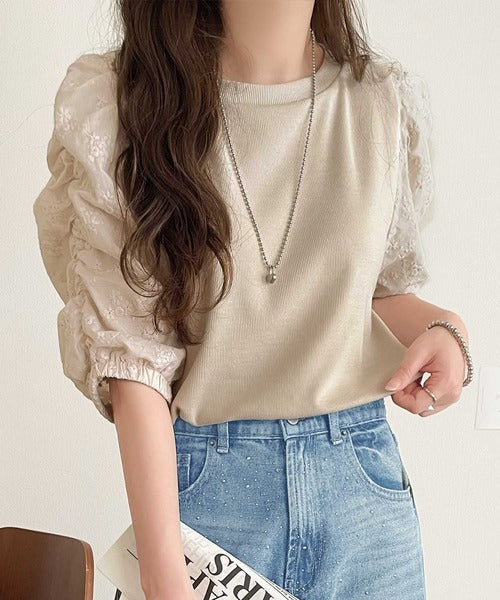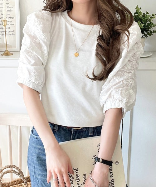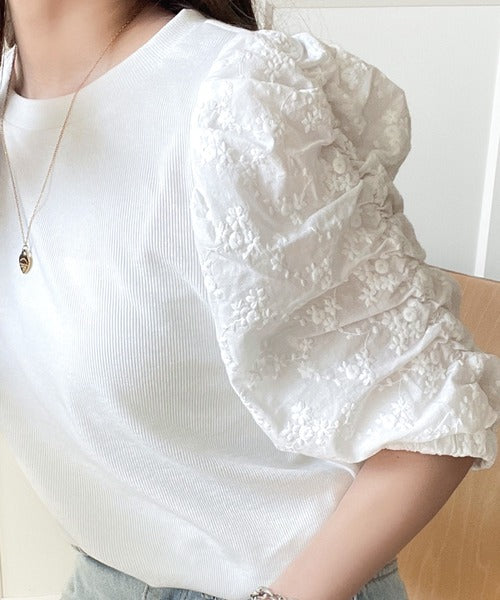 一枚で魅せる花柄スリーブの魔法。綿100%ふんわり袖花柄レースギャザードッキングトップス(半袖) ce1010435