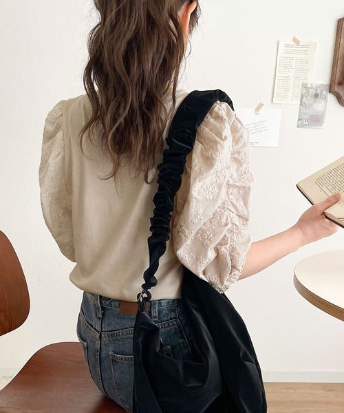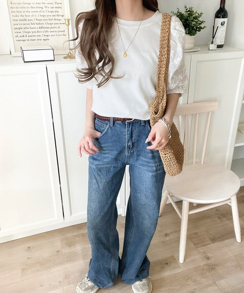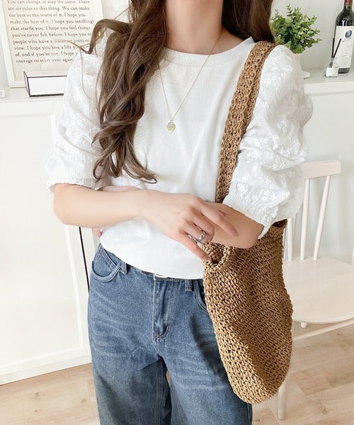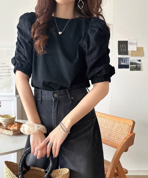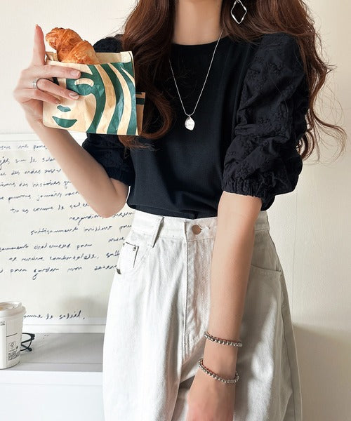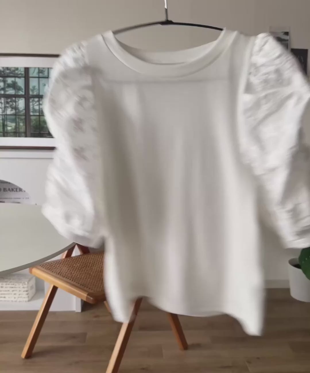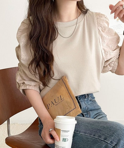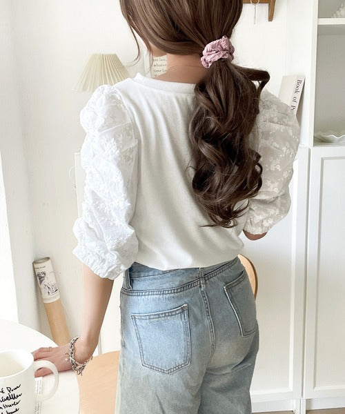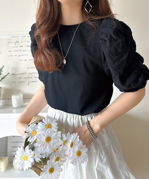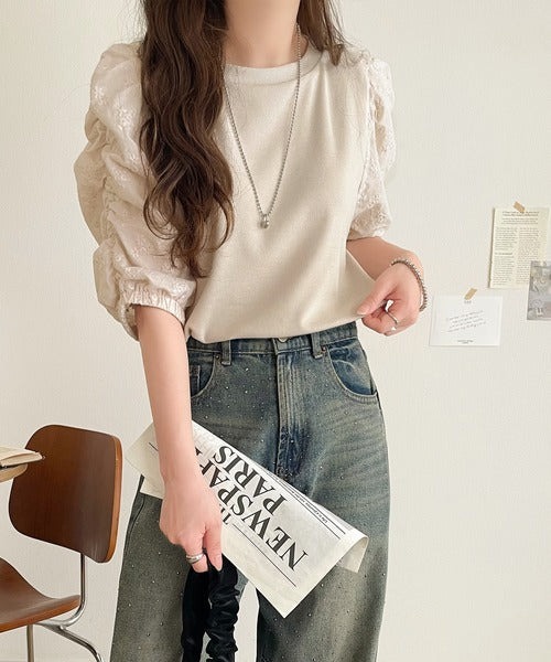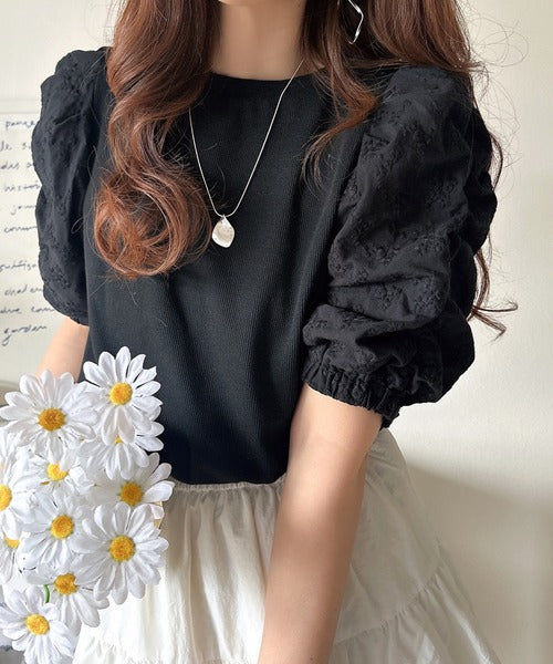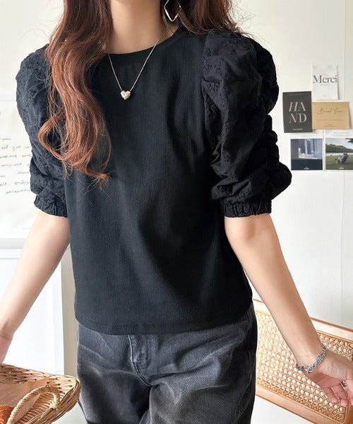 一枚で魅せる花柄スリーブの魔法。綿100%ふんわり袖花柄レースギャザードッキングトップス(半袖) ce1010435