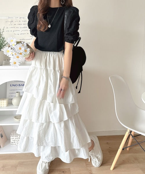 カジュアルコーデを楽しむならカーブデニムやティアードスカートを合わせるのがオススメ!