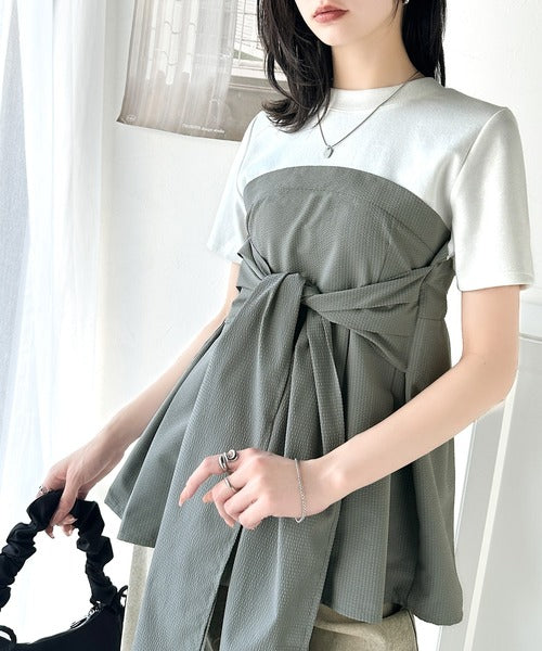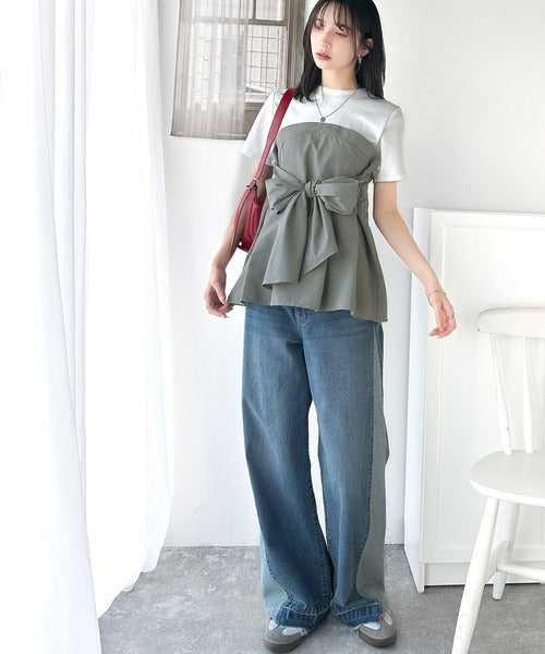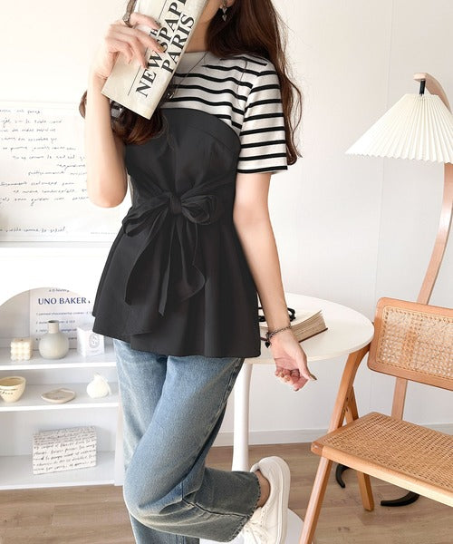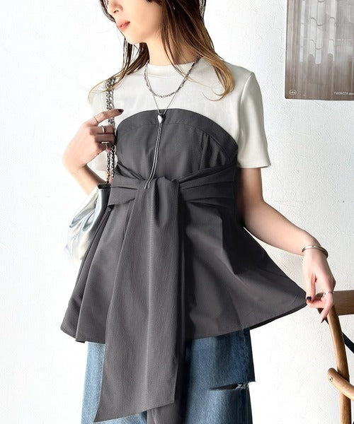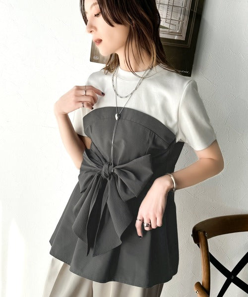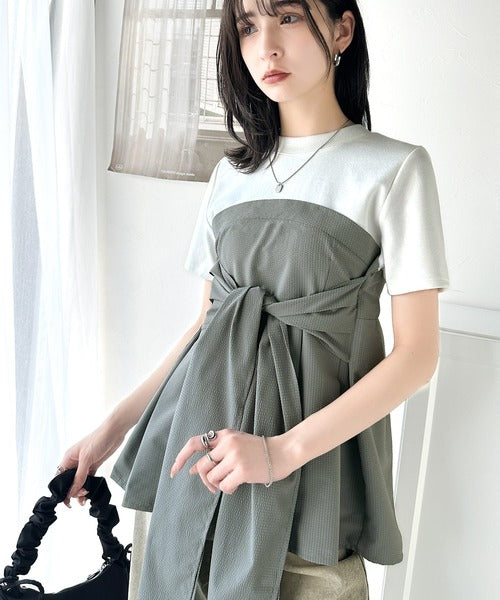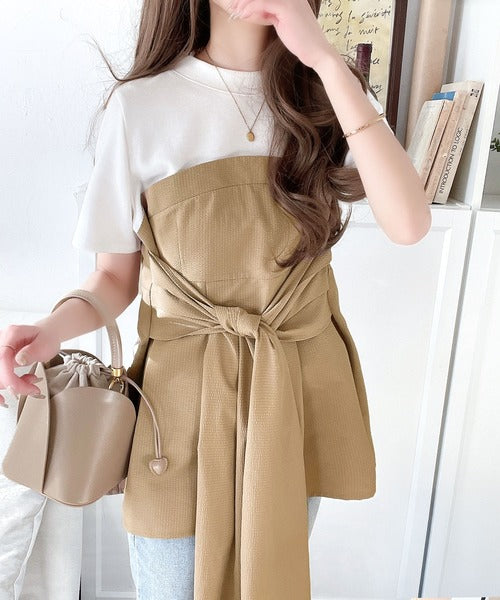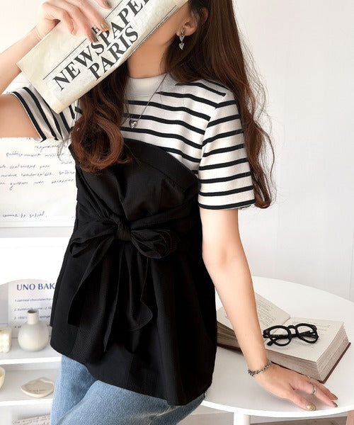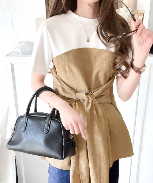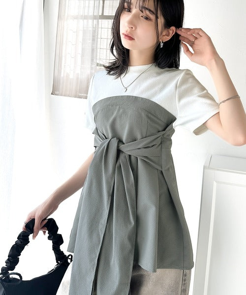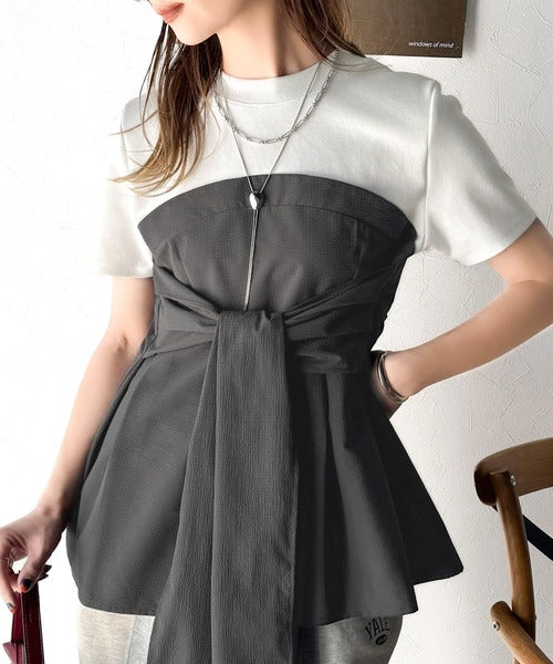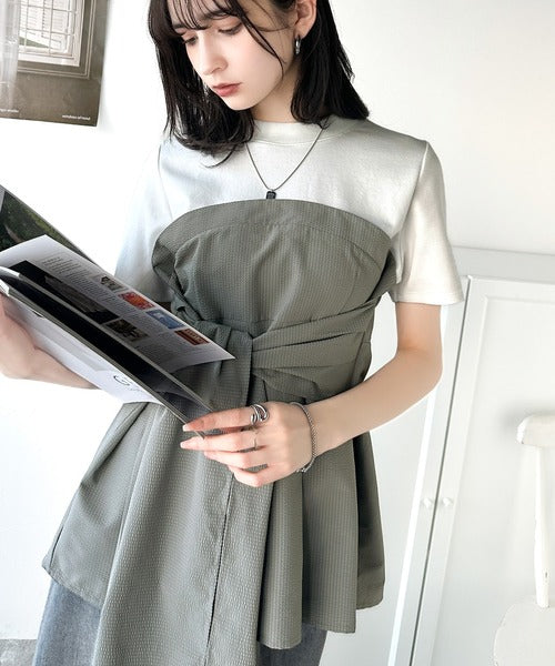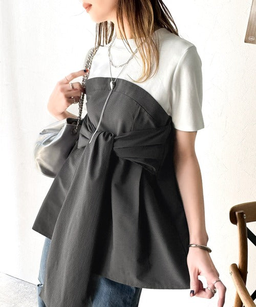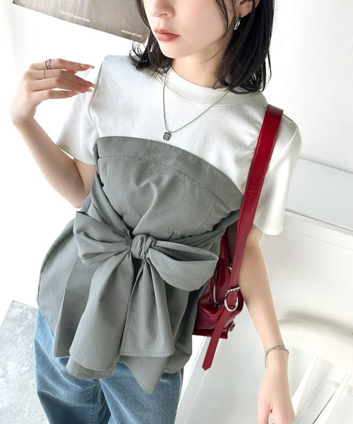一枚でトレンドコーデが完成♪ビスチェ風2wayリボン使いサッカー素材ドッキングトップス(半袖) ce1020193