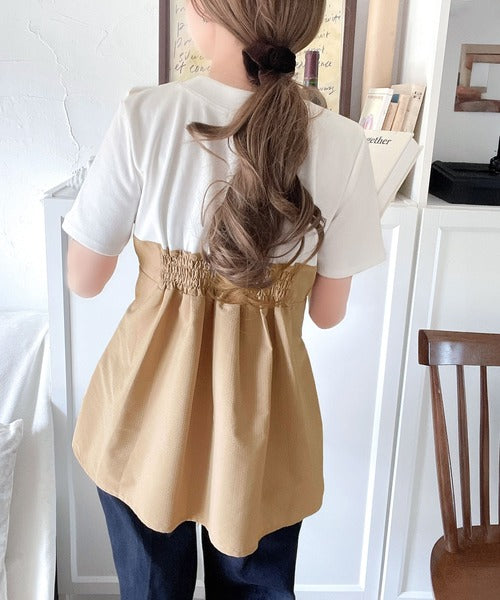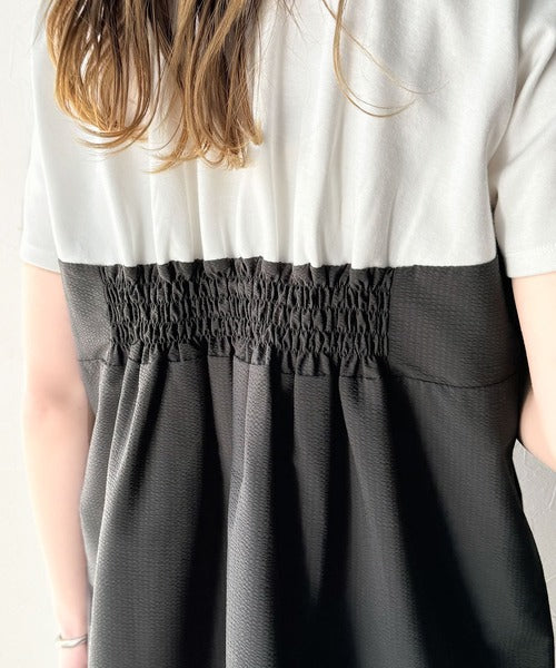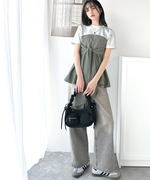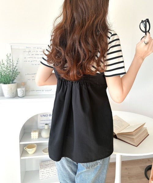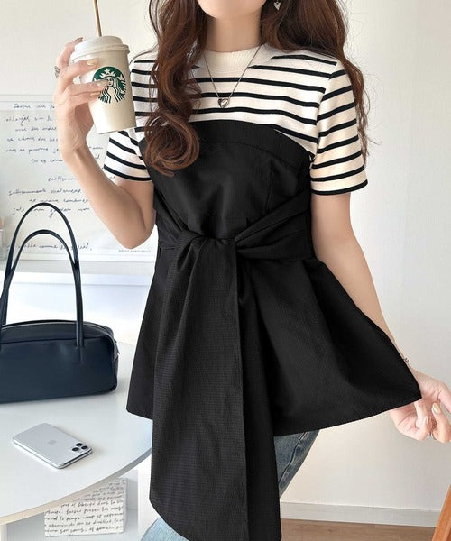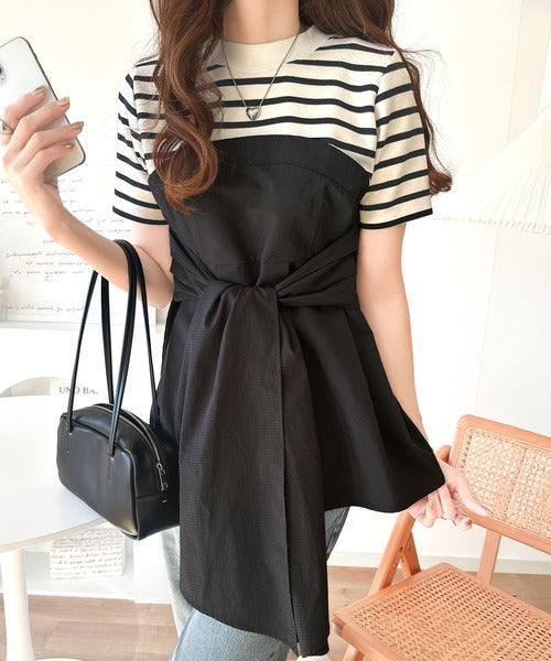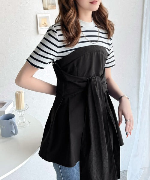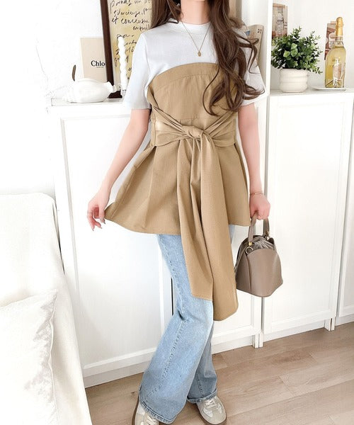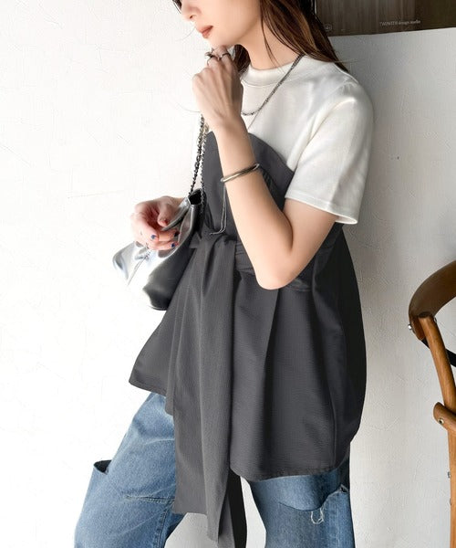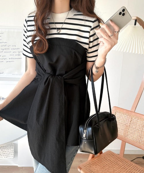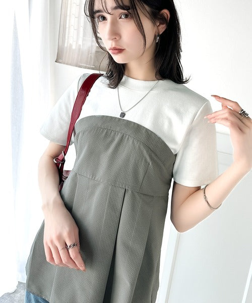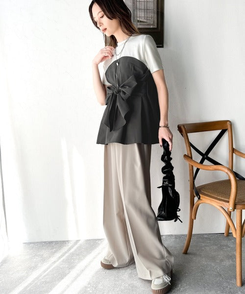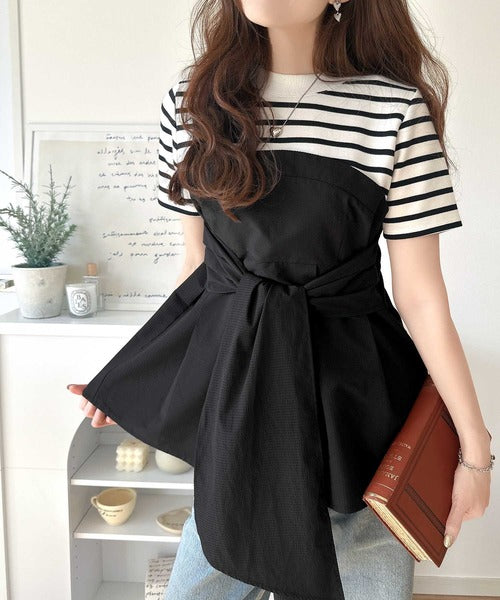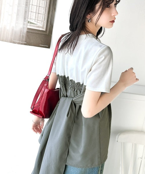 一枚でトレンドコーデが完成♪ビスチェ風2wayリボン使いサッカー素材ドッキングトップス(半袖) ce1020193
