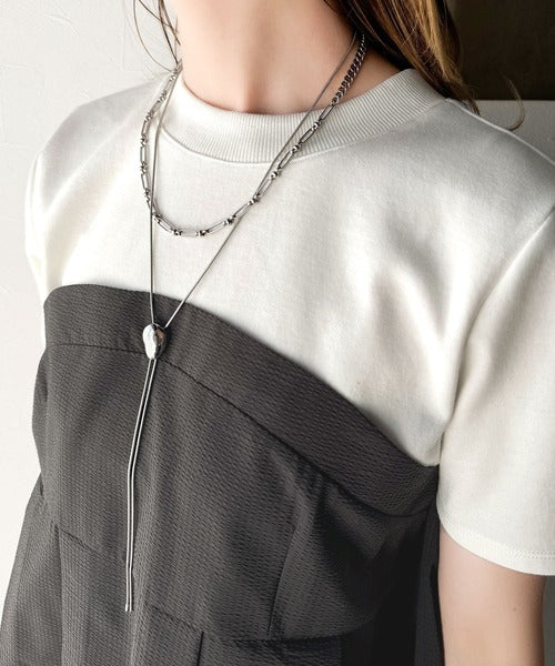 サッカー素材のビスチェにカットソー素材のトップスをコーデしたような