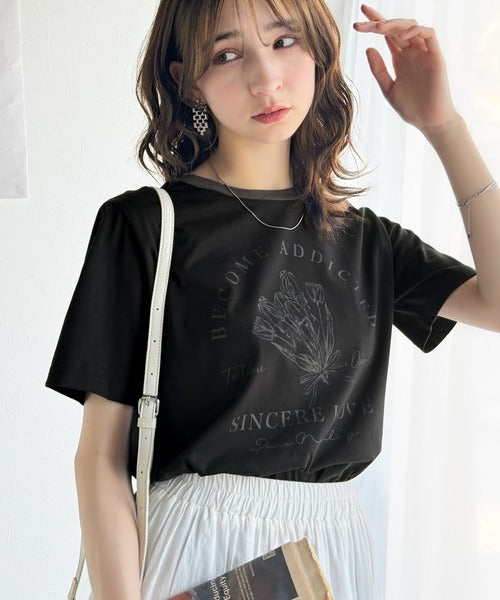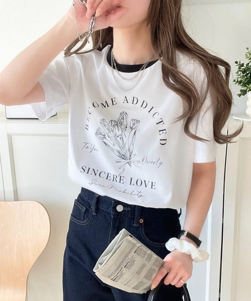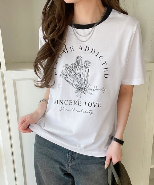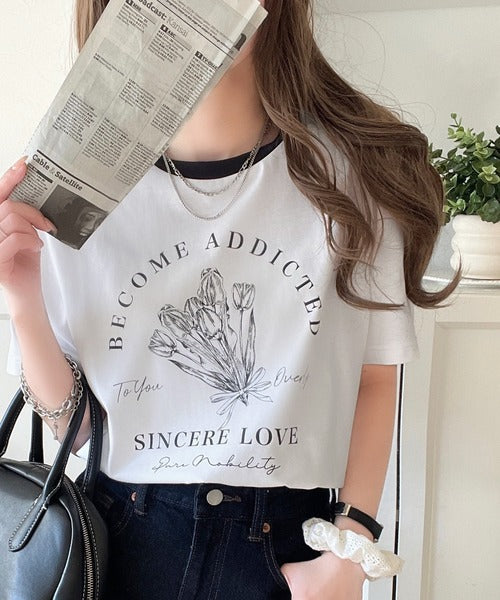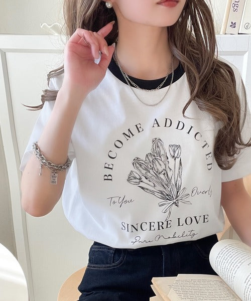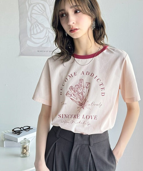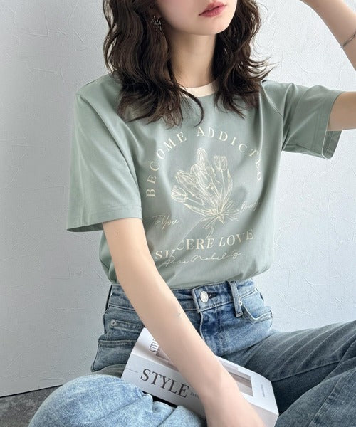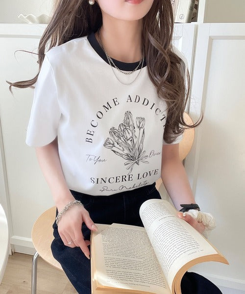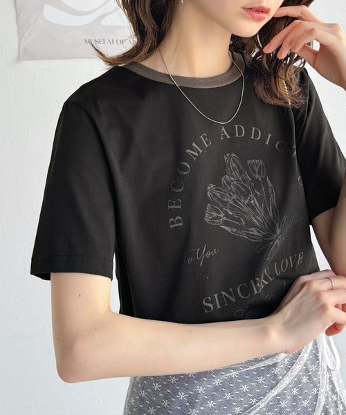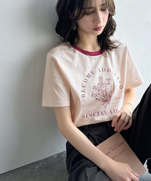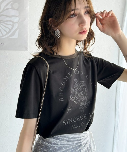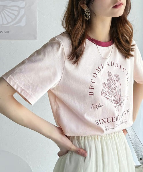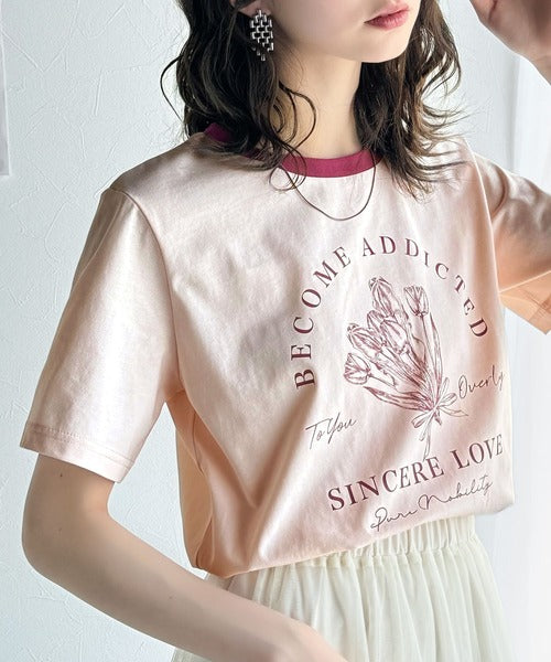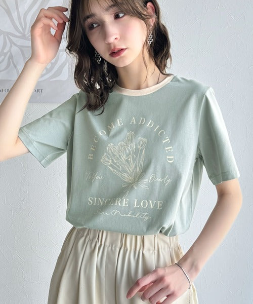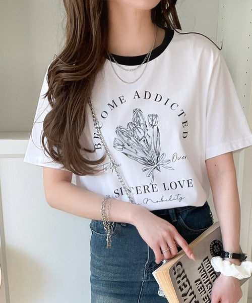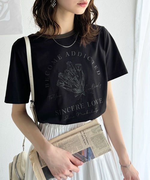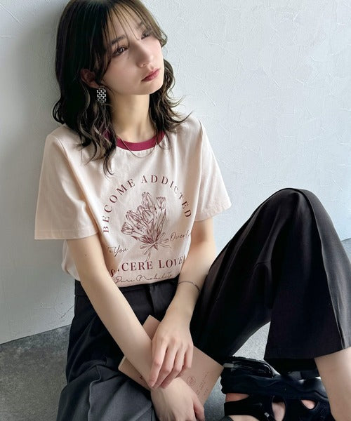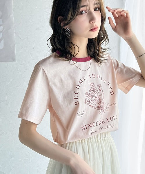 トレンドのディテールが魅力。シルケットフラワーカーブロゴリンガー半袖Tシャツ ce1020196