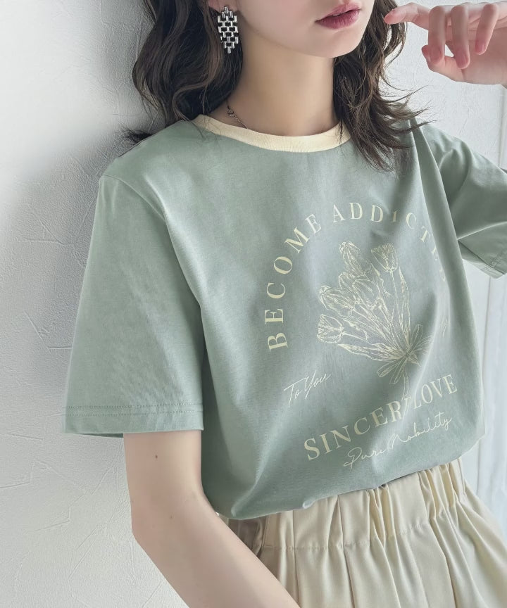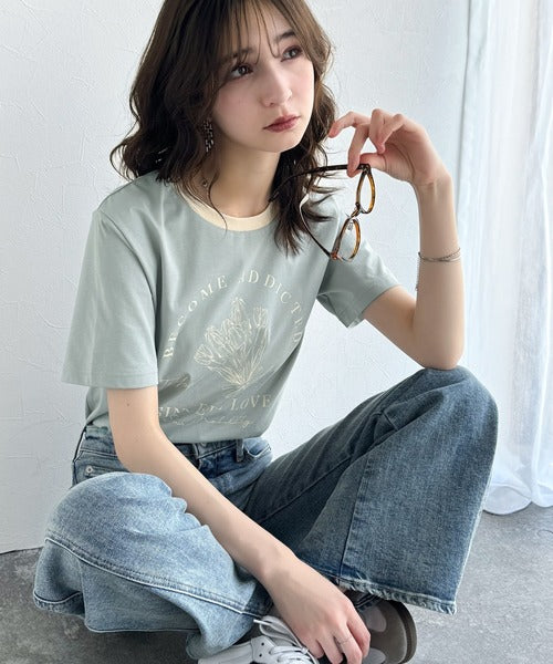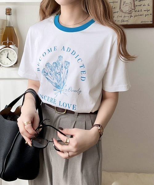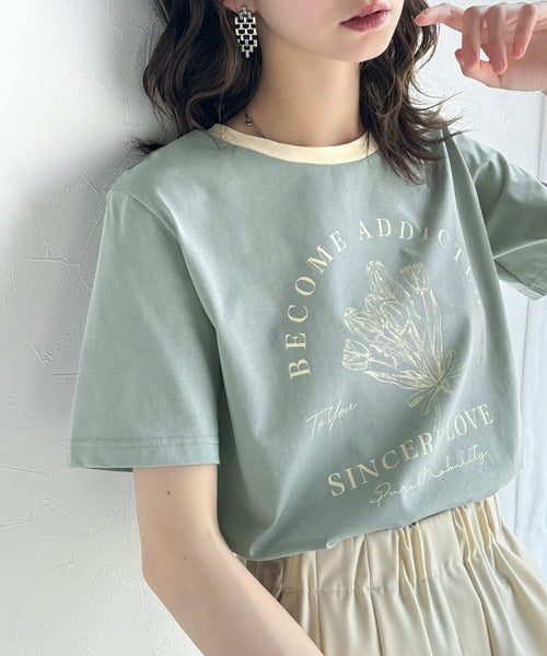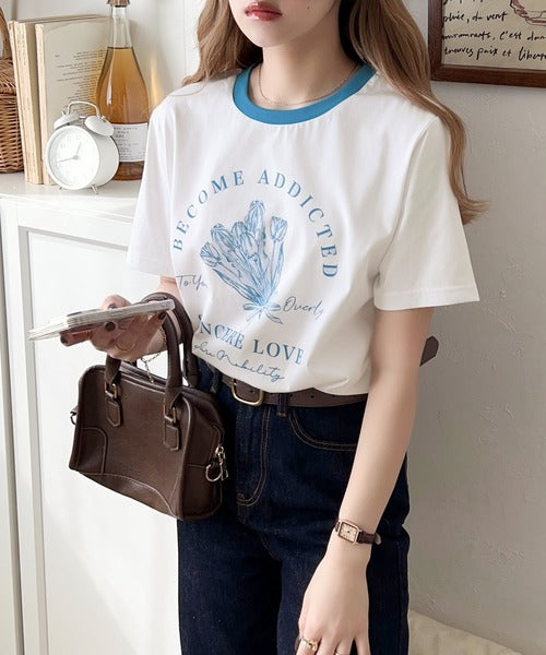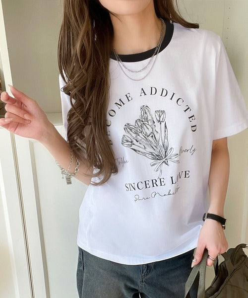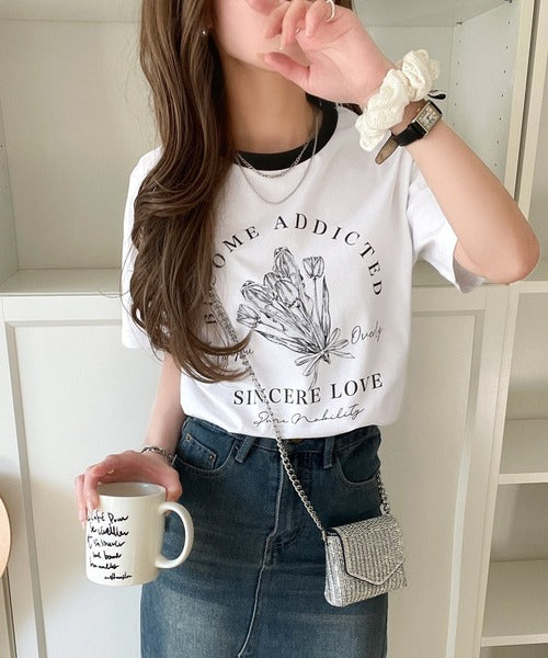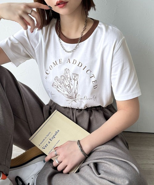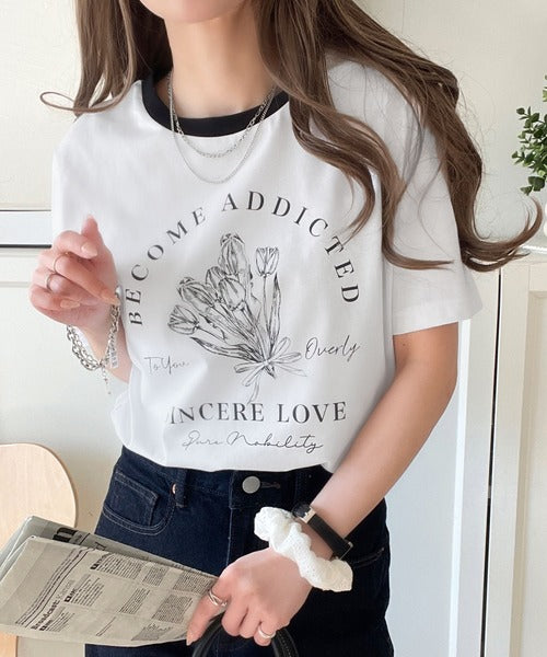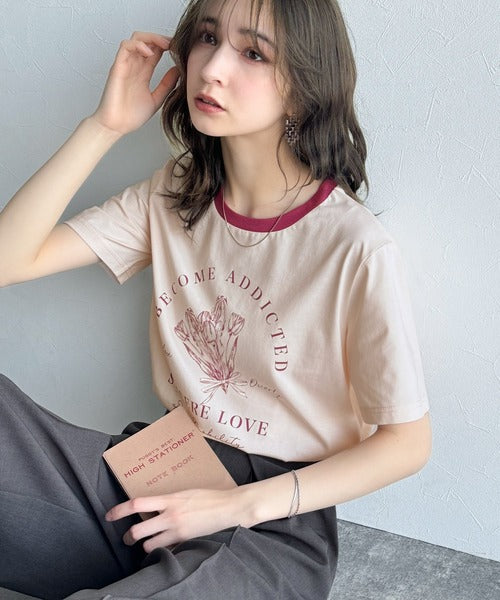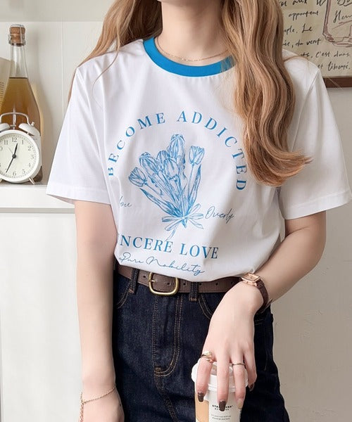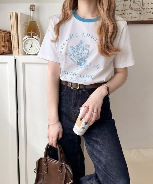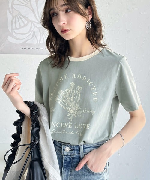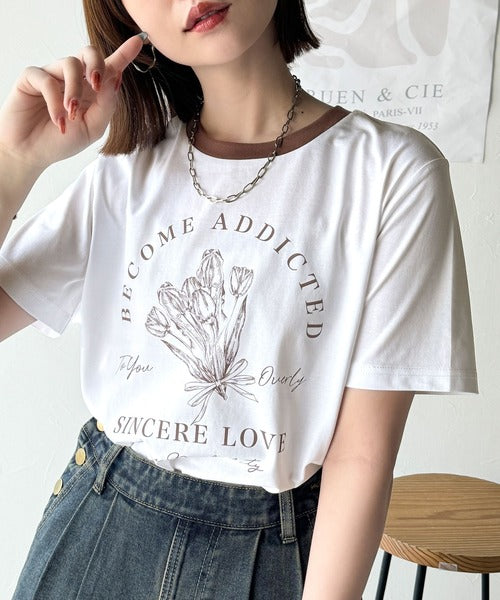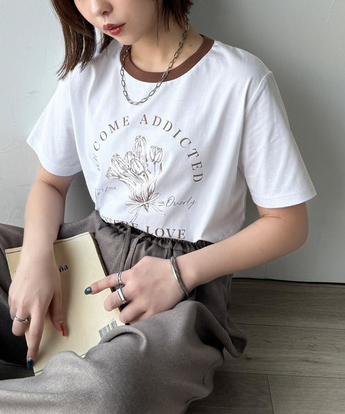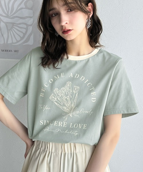 トレンドのディテールが魅力。シルケットフラワーカーブロゴリンガー半袖Tシャツ ce1020196