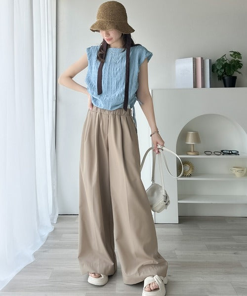 ポコポコ質感が涼しげ、夏の相棒トップス。ボートネックノースリーブサイドドロストリボンポコポコトップス ce1070164
