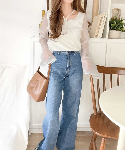 繊細なオーガンジ素材のお袖がポイントになってくれるので、一枚で大人上品な印象に。