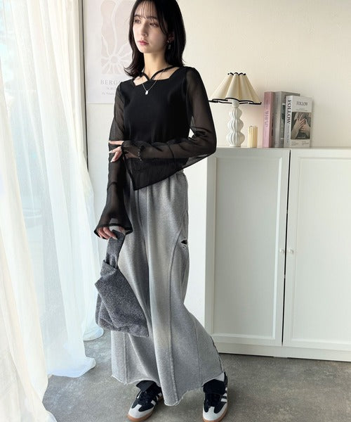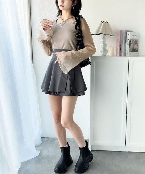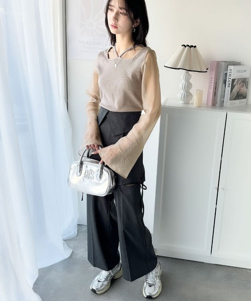 リブ素材&オーガンジ素材切替で一枚でお洒落なコーデに。