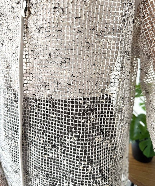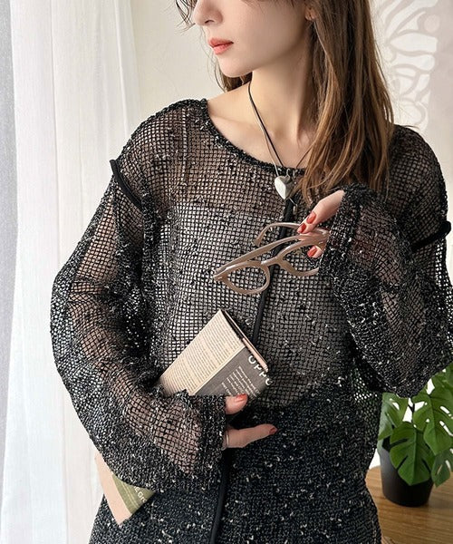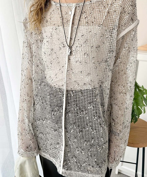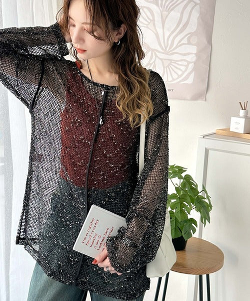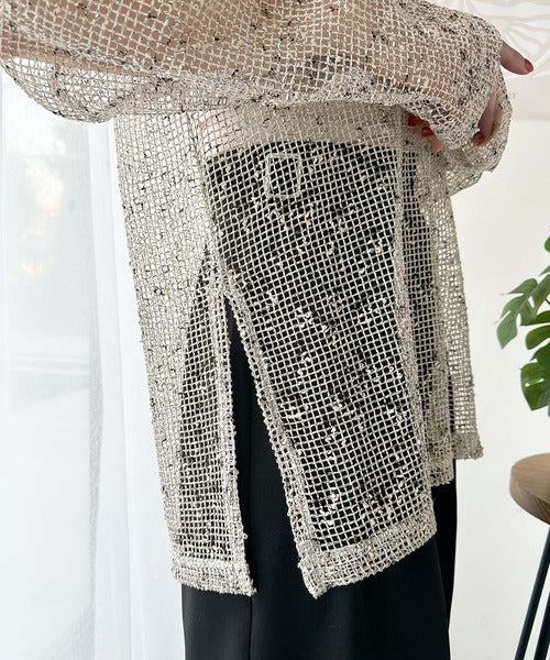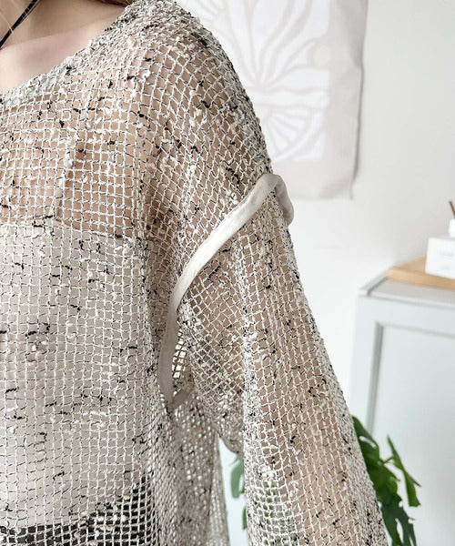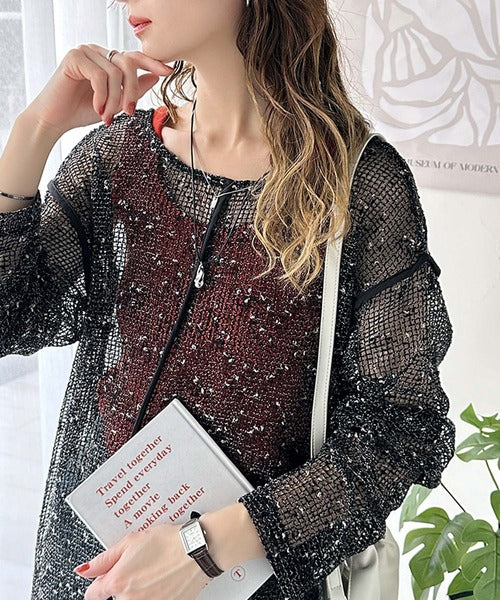 独特の透け感とミックス調のニュアンスが上品さを引き立てるメッシュニット。