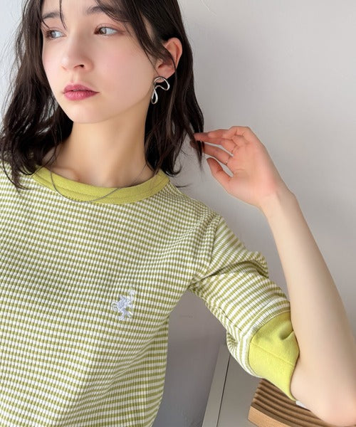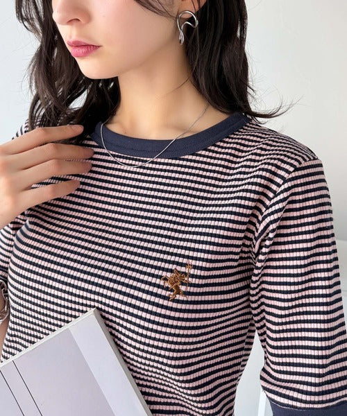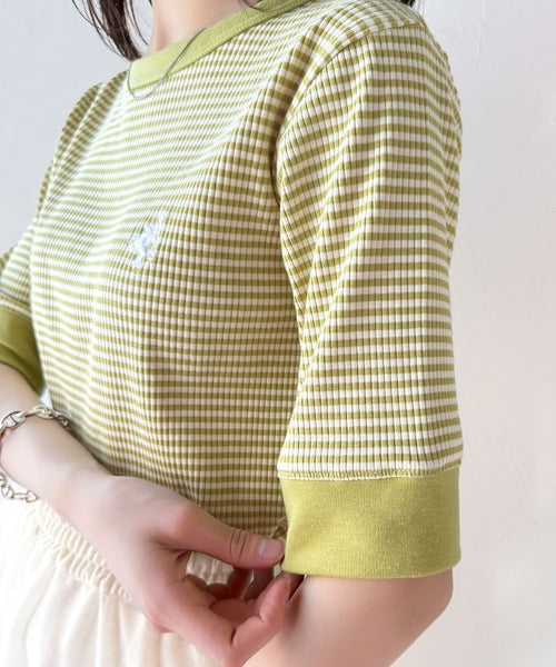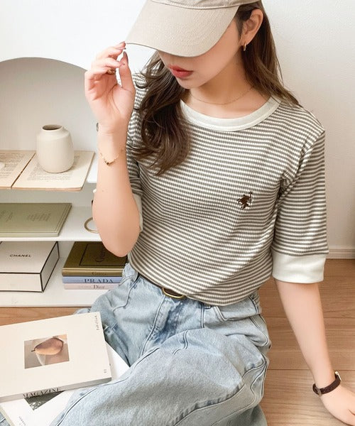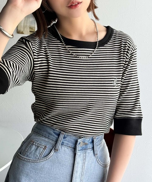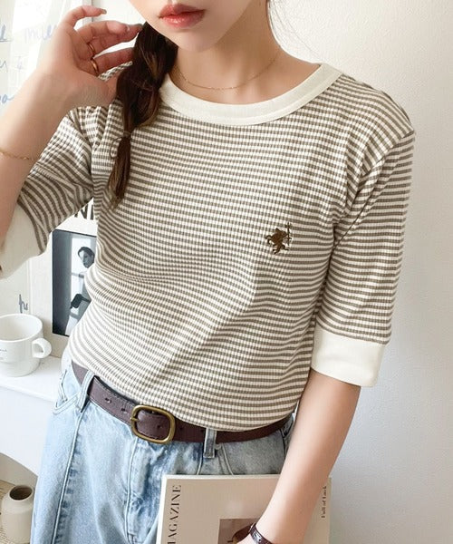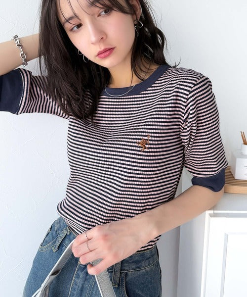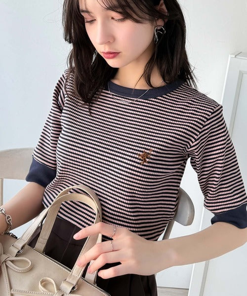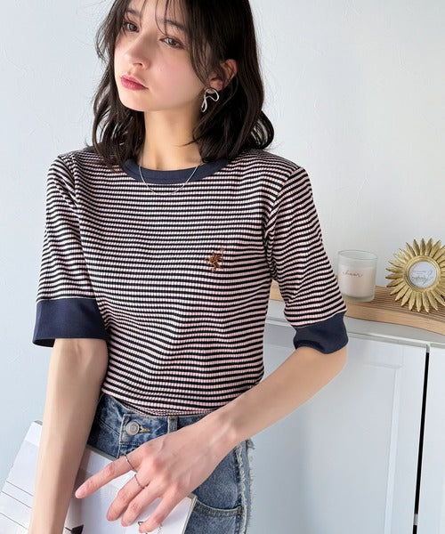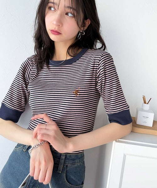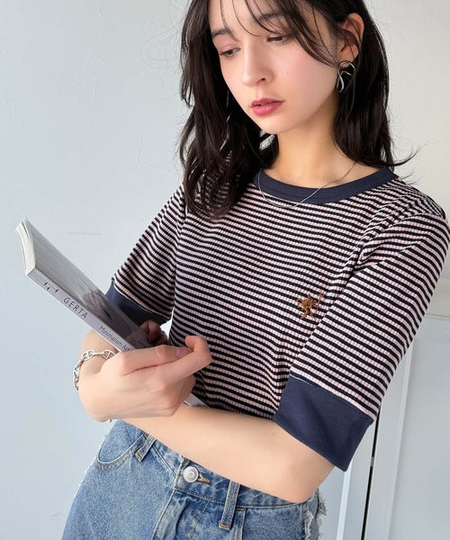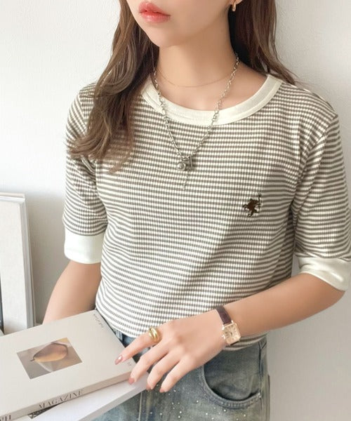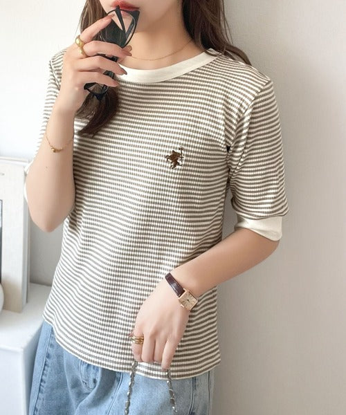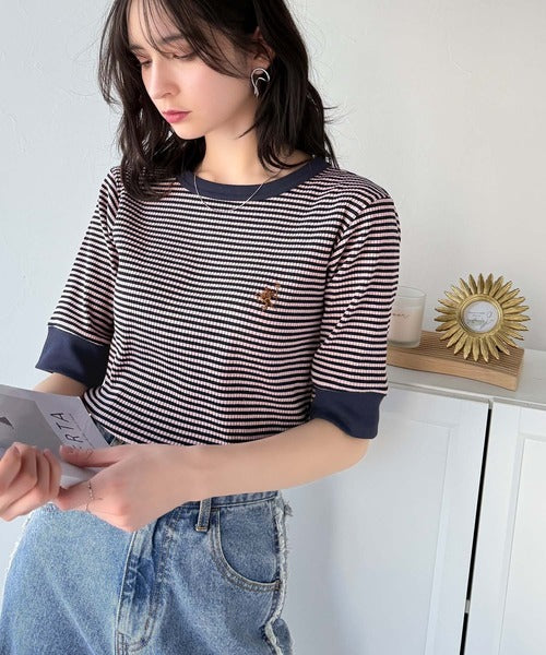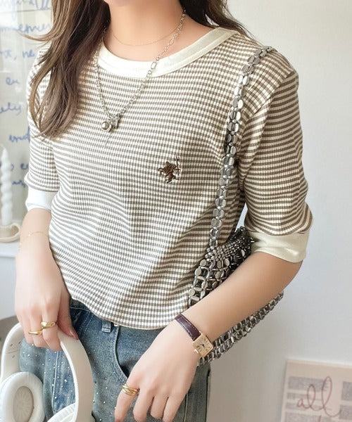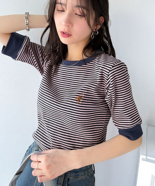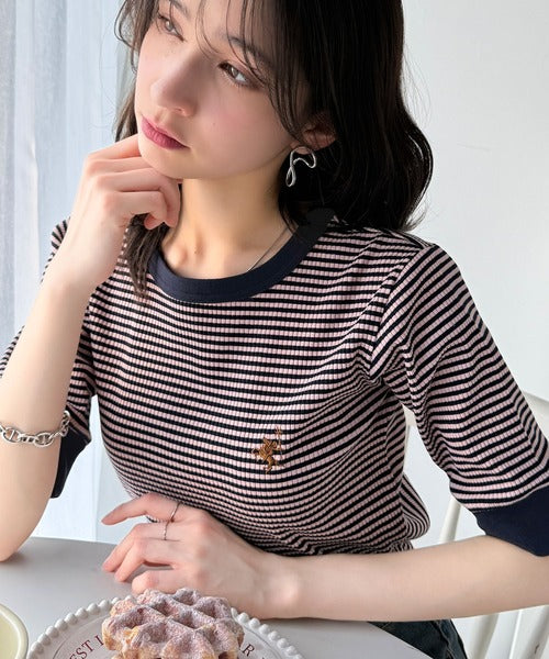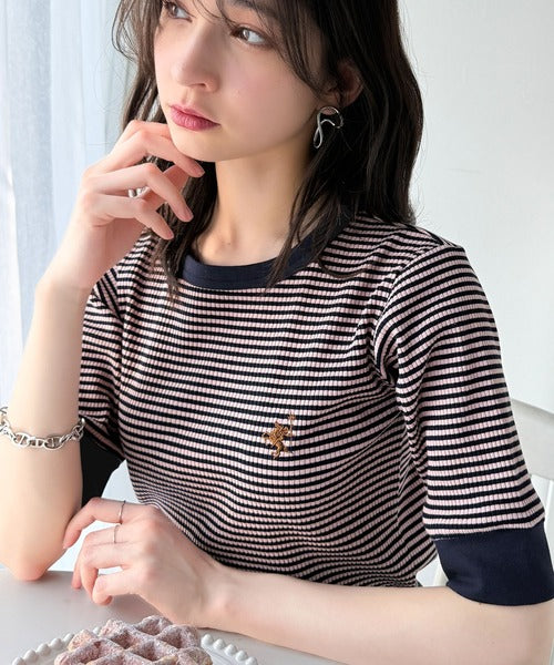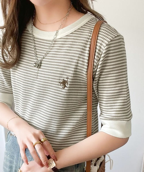 大人可愛いの新定番。袖リンガーボートネック胸刺繍ボーダーTシャツ(半袖) ce1260419