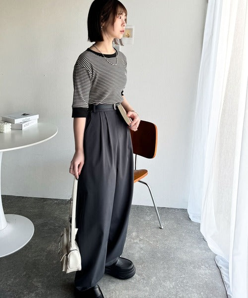 ボートネックが顔まわりをスッキリ見せ、上品な印象をプラス。