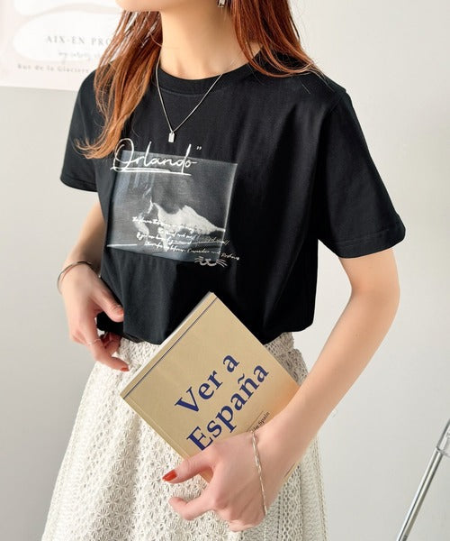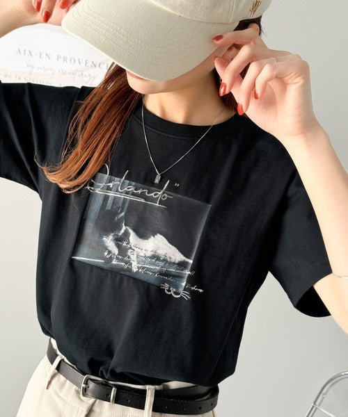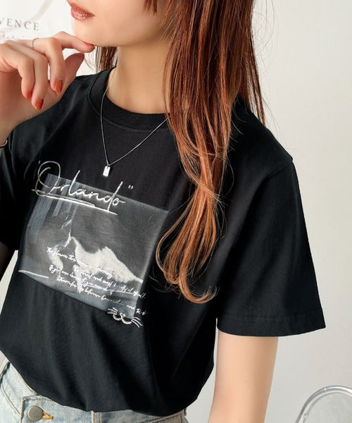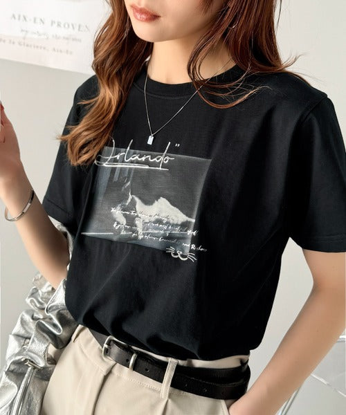 大人が着る高級感のあるカジュアルアイテム。綿100%シルケット風猫フォト箔×刺繍T ce1330015