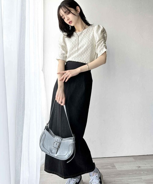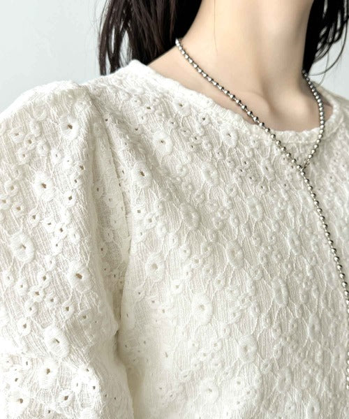 表面感が美しい花柄ジャガード生地を使用し、華やかさが際立つトップス。