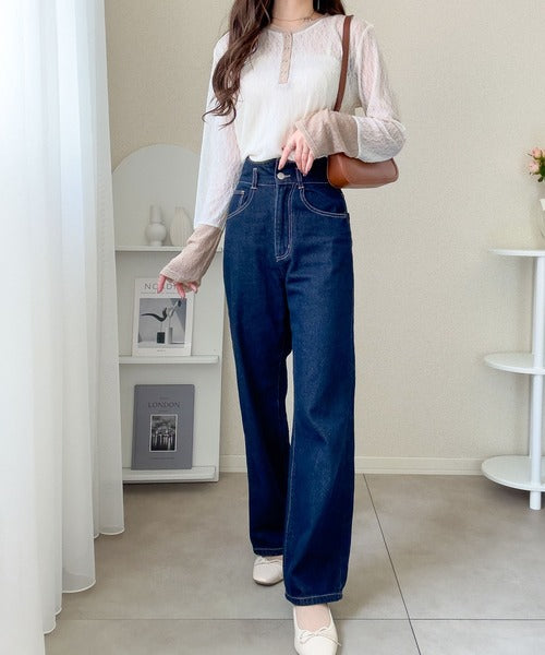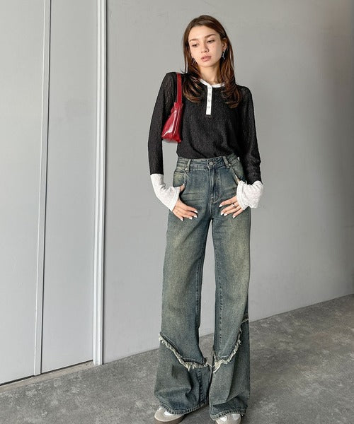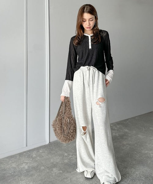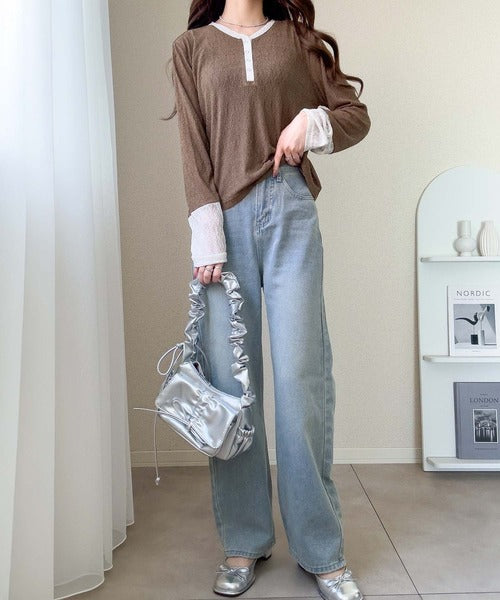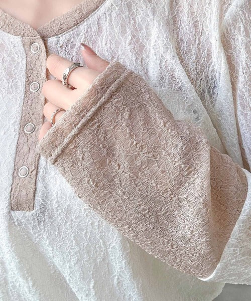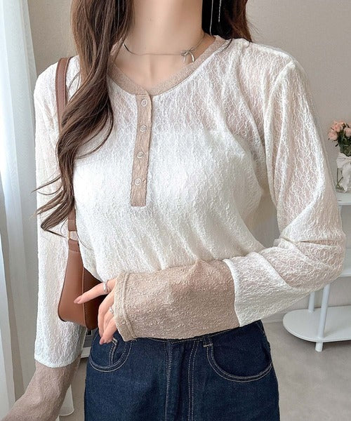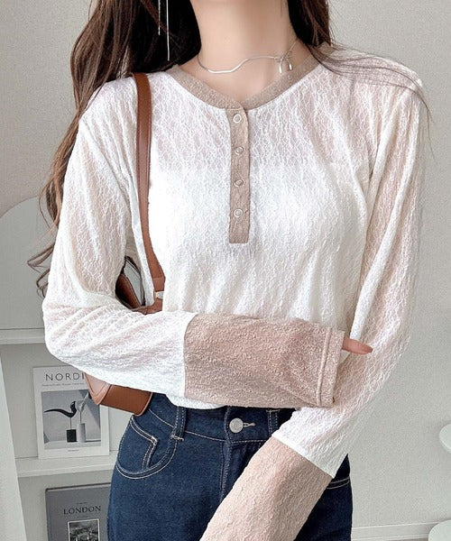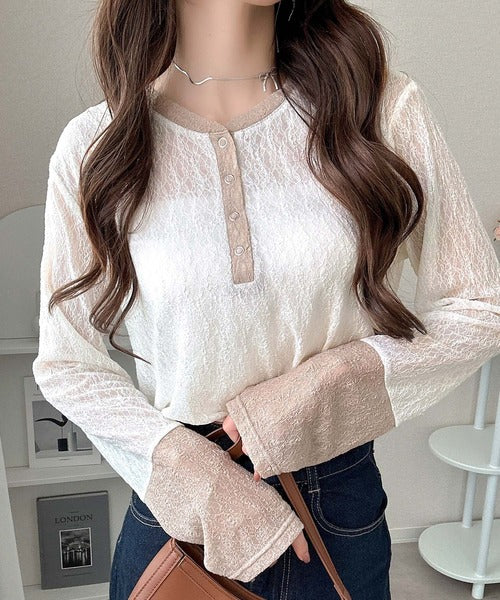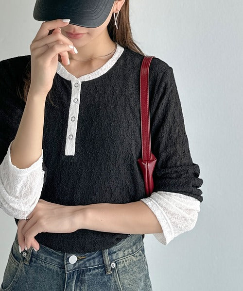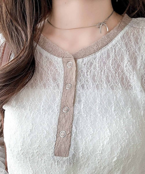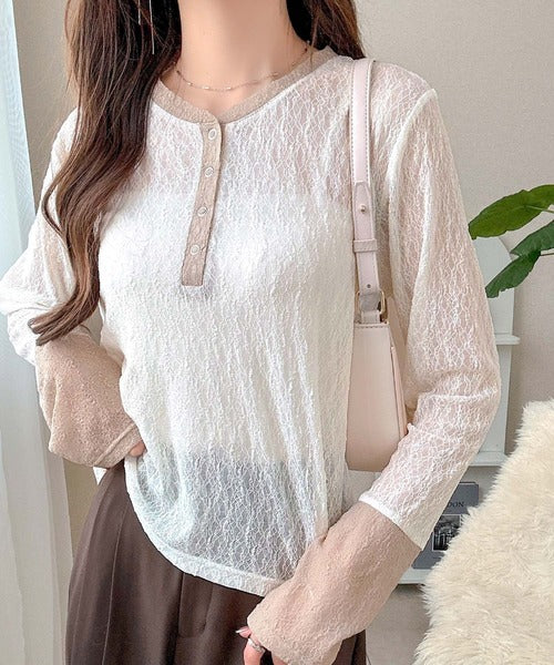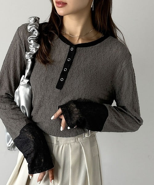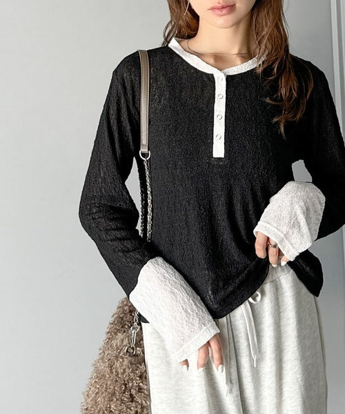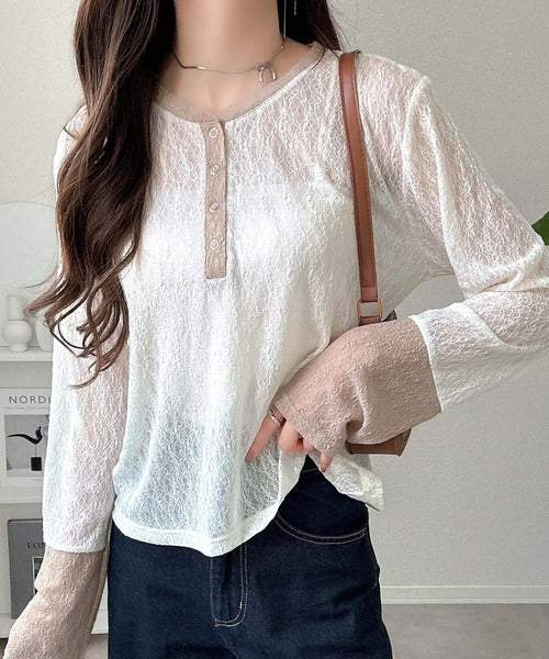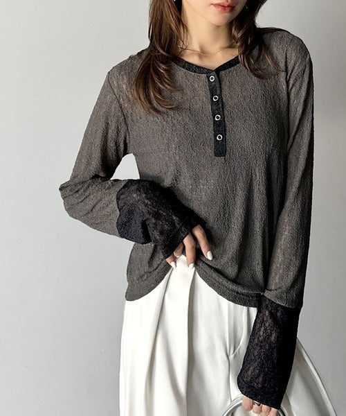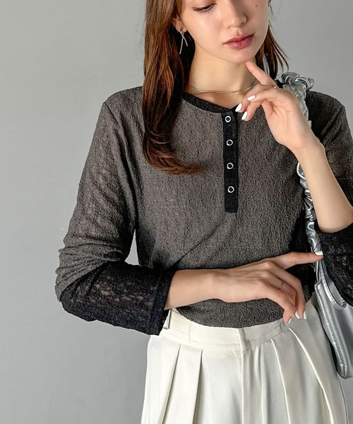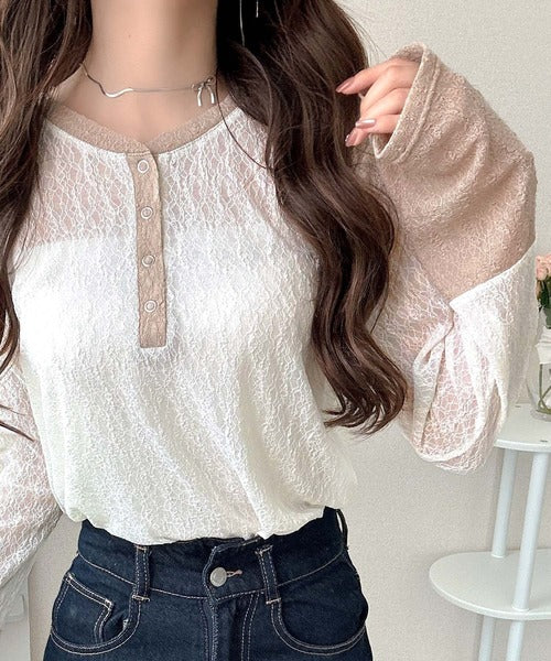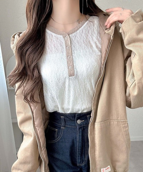 カジュアルに抜け感を演出するレースヘンリーカットソー。