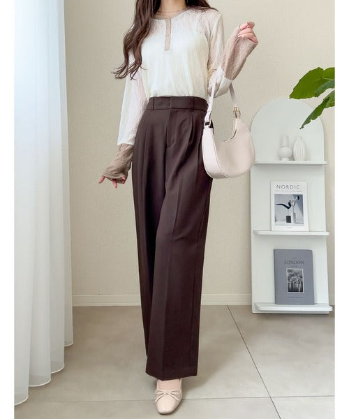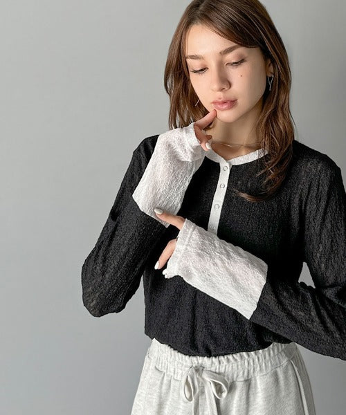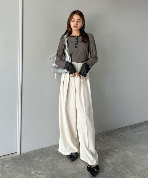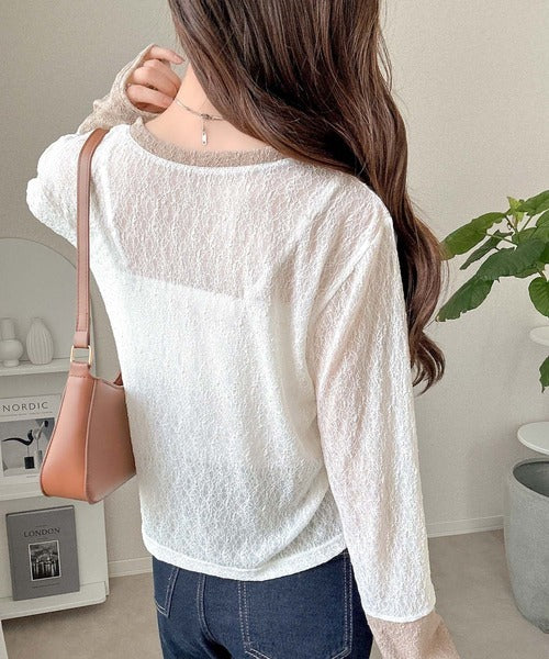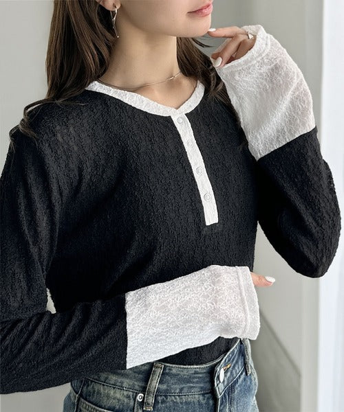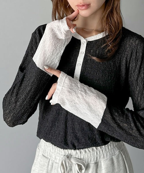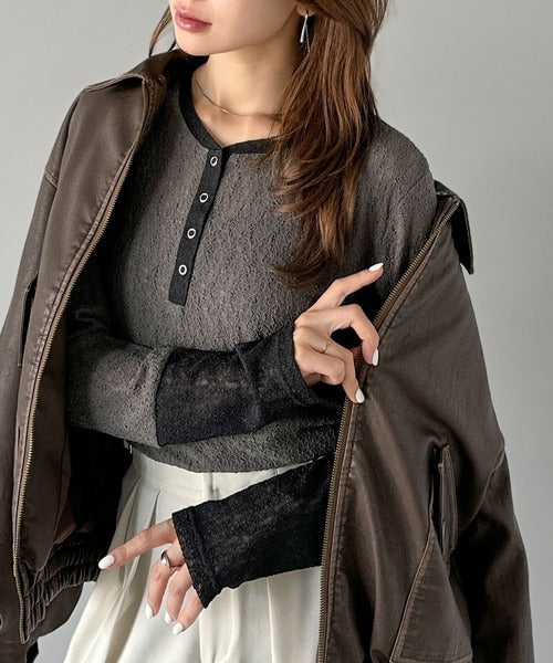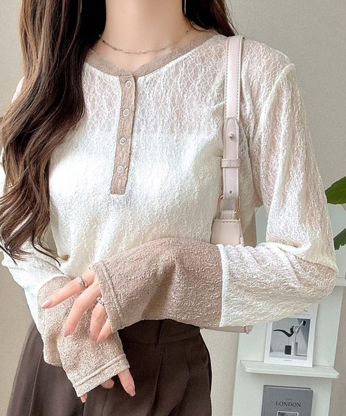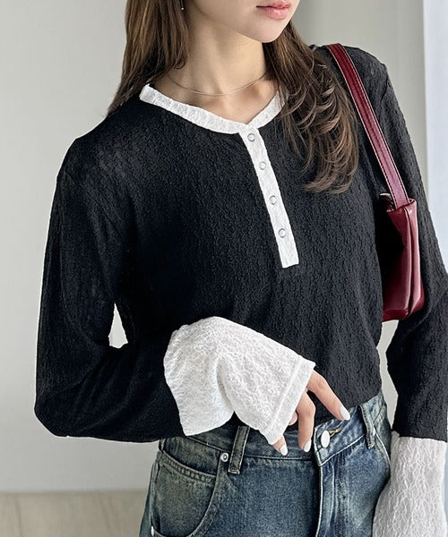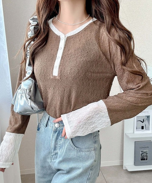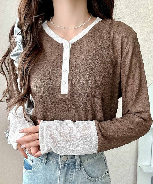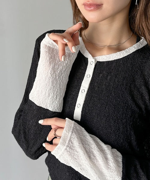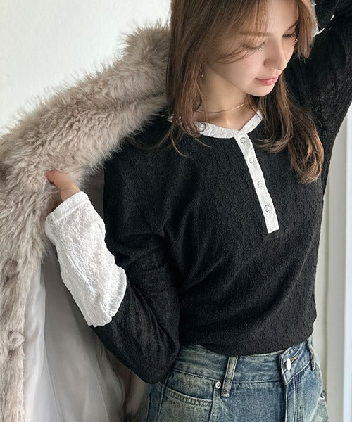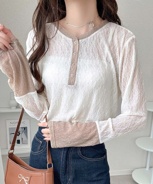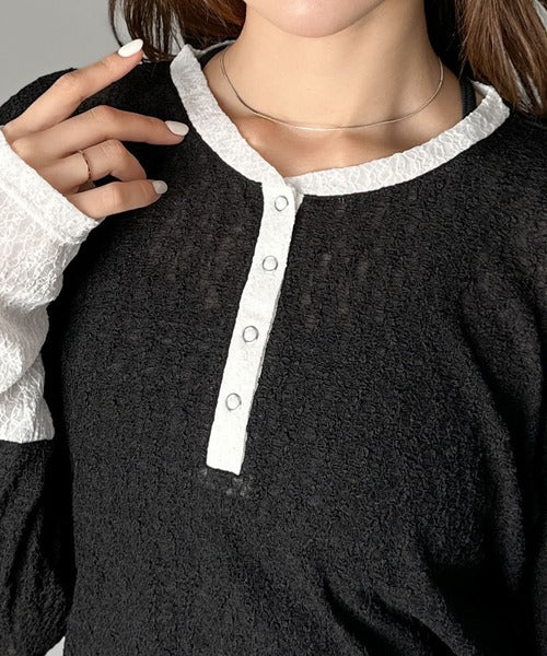 【mily bilet】シンプルさの中にフェミニンさをプラスしたデザイン。袖配色レースヘンリーカットソー(長袖) mi1019107