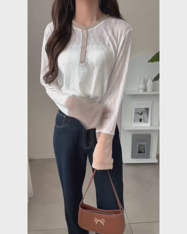 袖口や衿に配色デザインを施したヘンリーネックカットソーです。