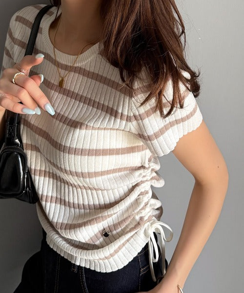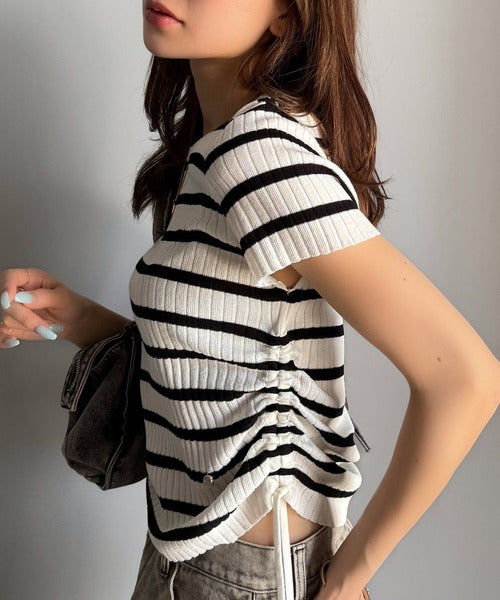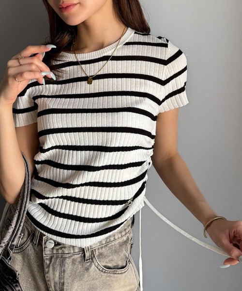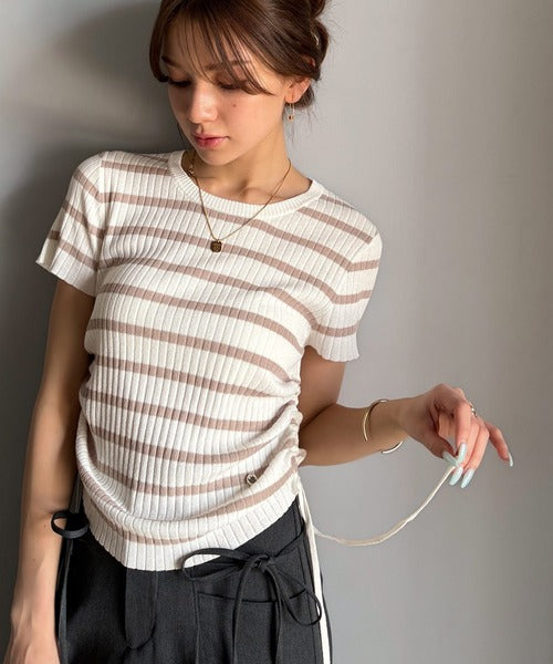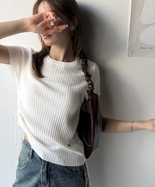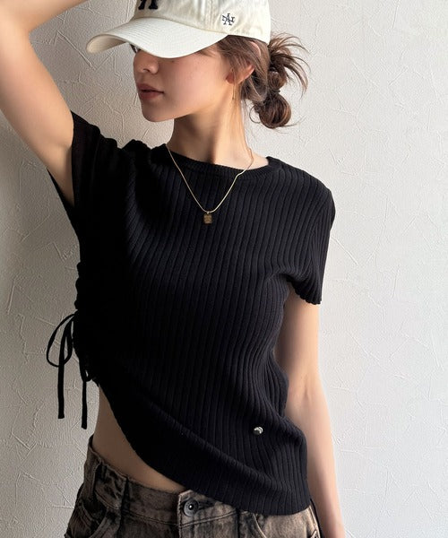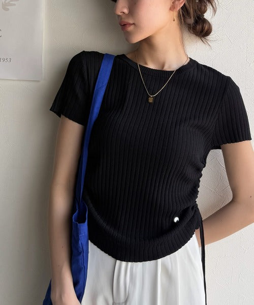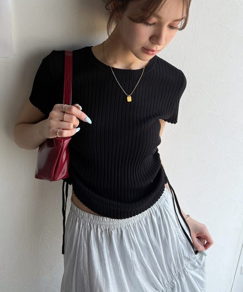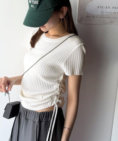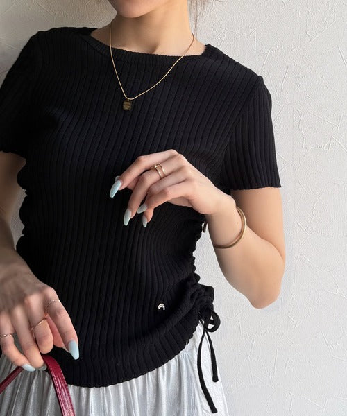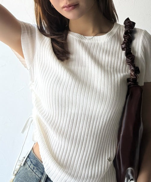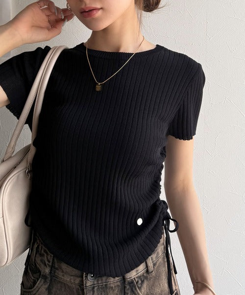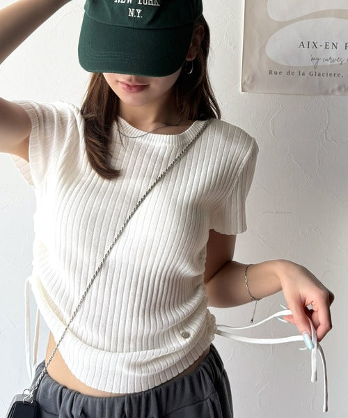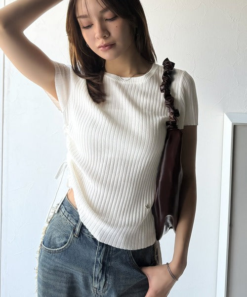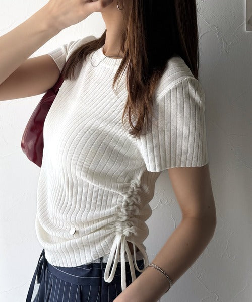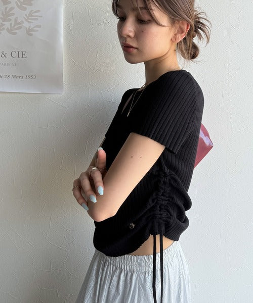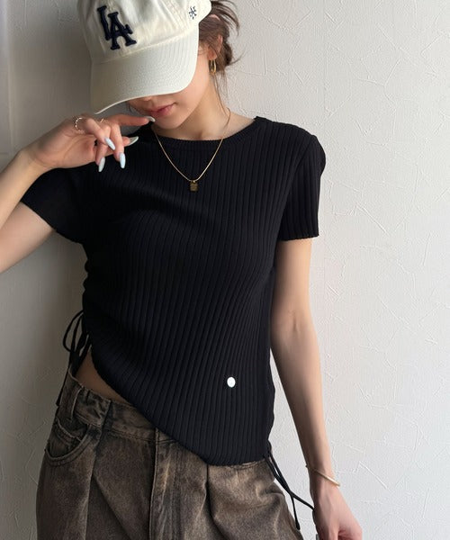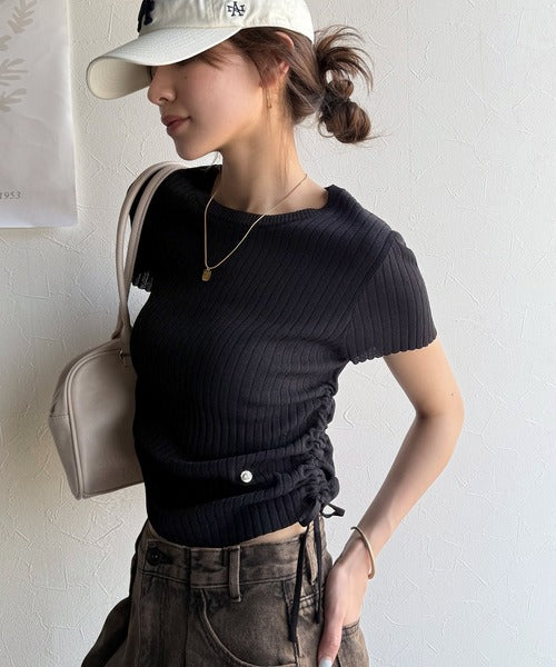 【mily bilet】トレンドのサイドリボン◎ドロスト使いボタンデザインサマーリブニットトップス(半袖) mi1029119