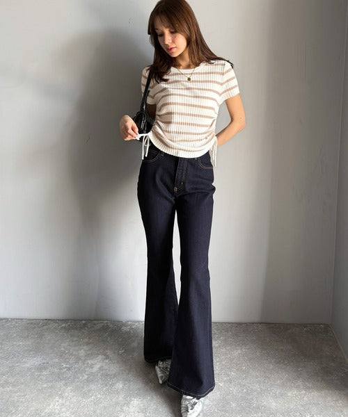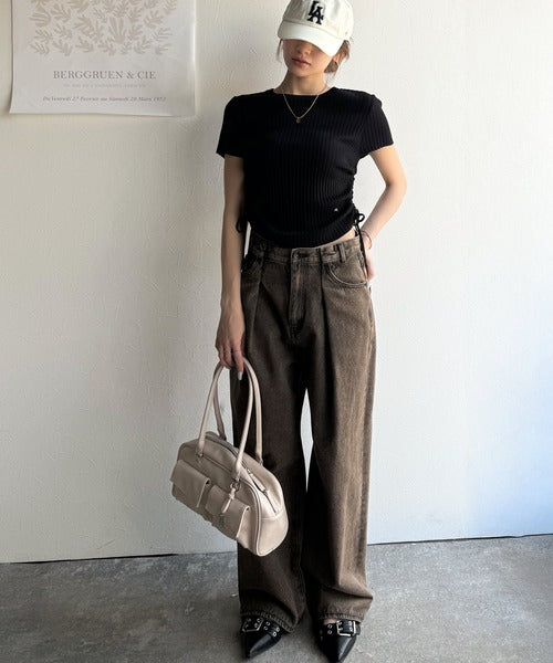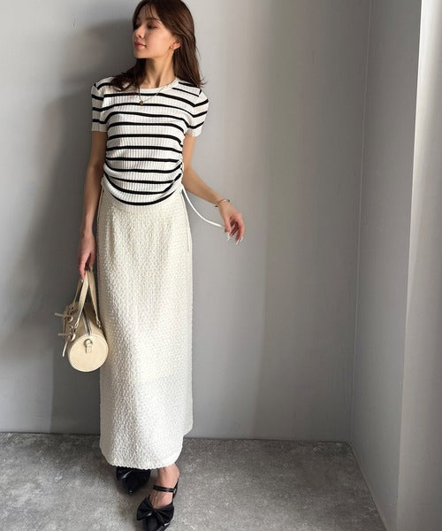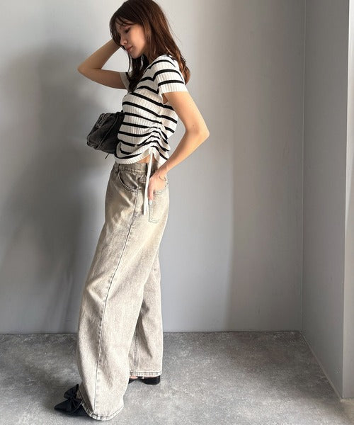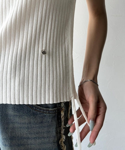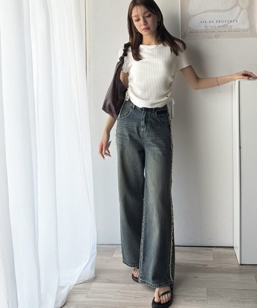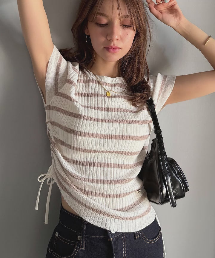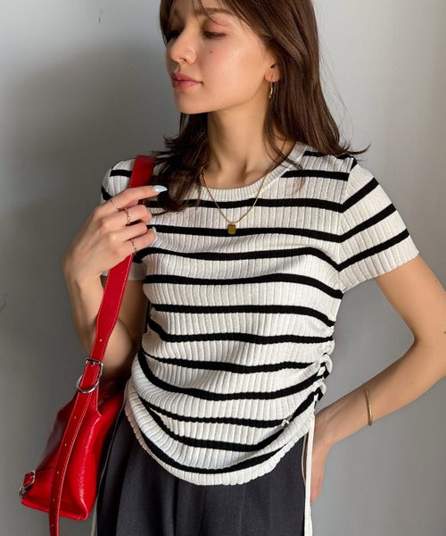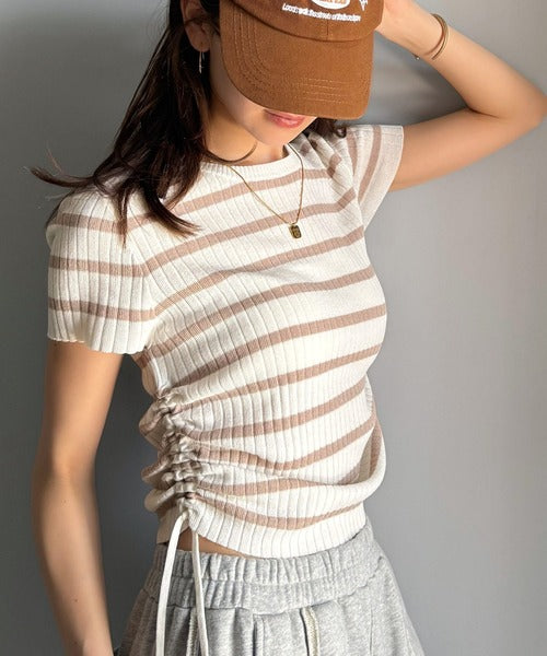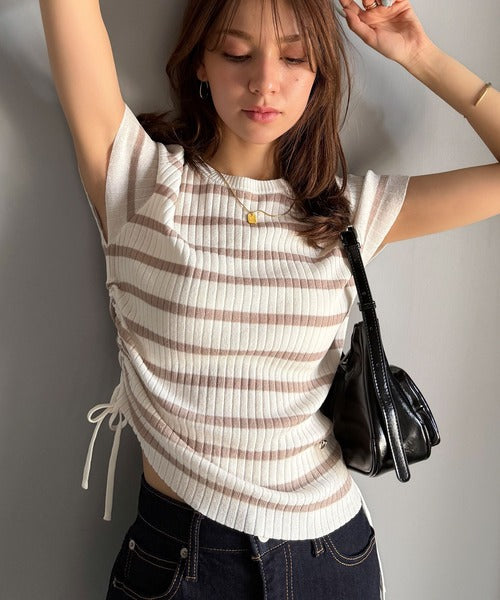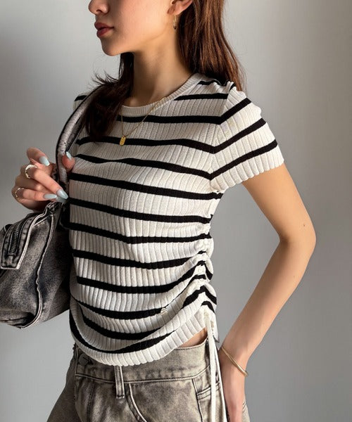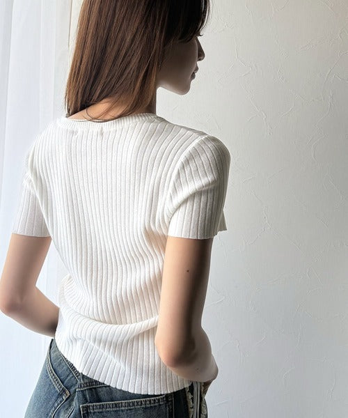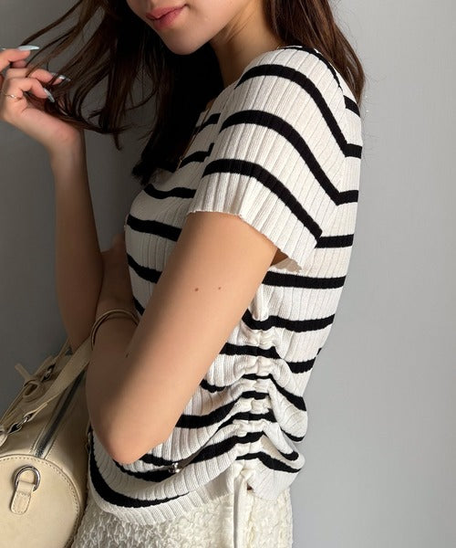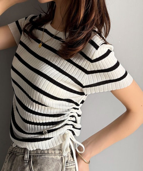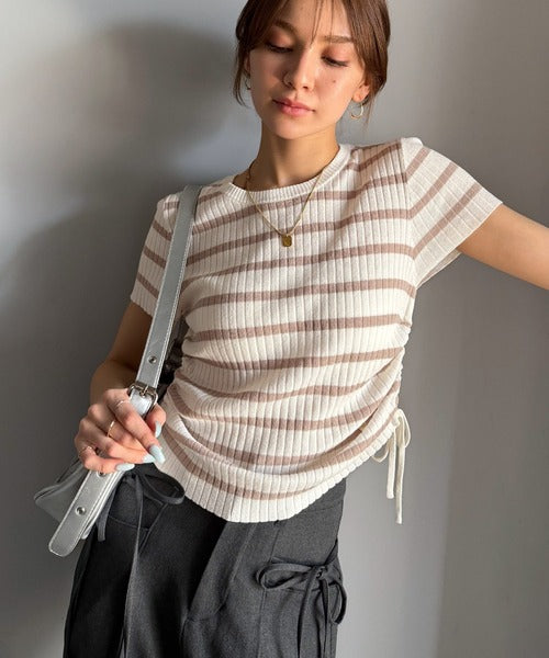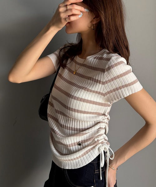 【mily bilet】トレンドのサイドリボン◎ドロスト使いボタンデザインサマーリブニットトップス(半袖) mi1029119