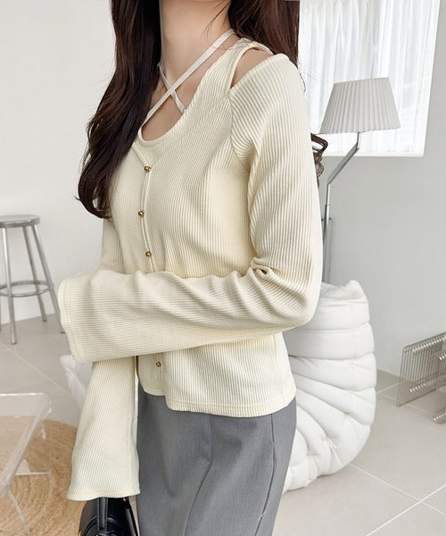 【mily bilet】ゴールドボタンが大人可愛い。オフショル2WAYレイヤードリブカットソー(長袖) mi1329020