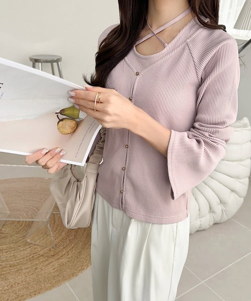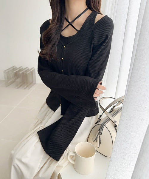 カーディガンとタンクが一体型となったアンサンブルコーデが手軽に楽しめる。