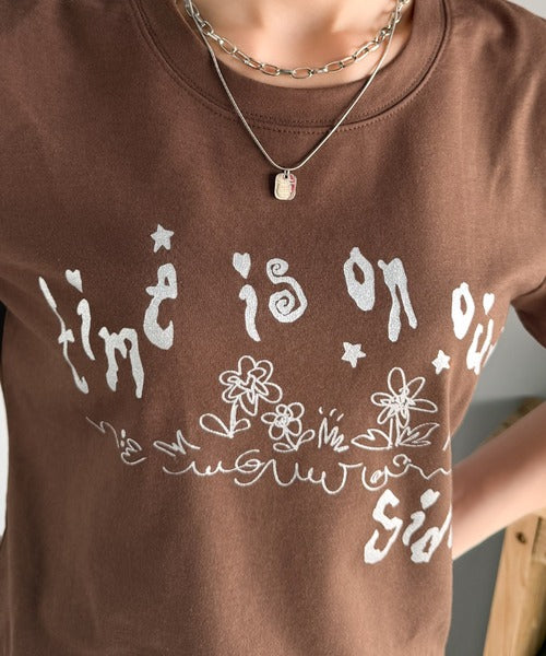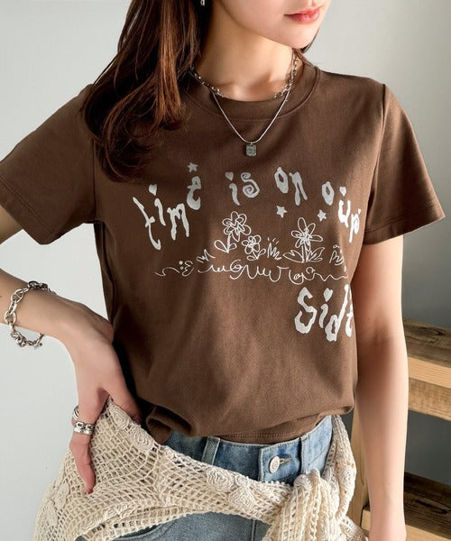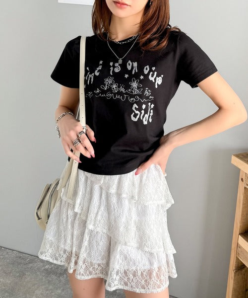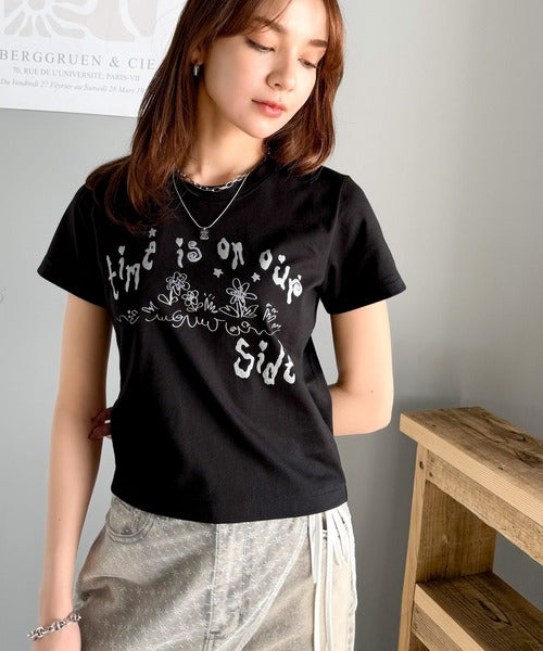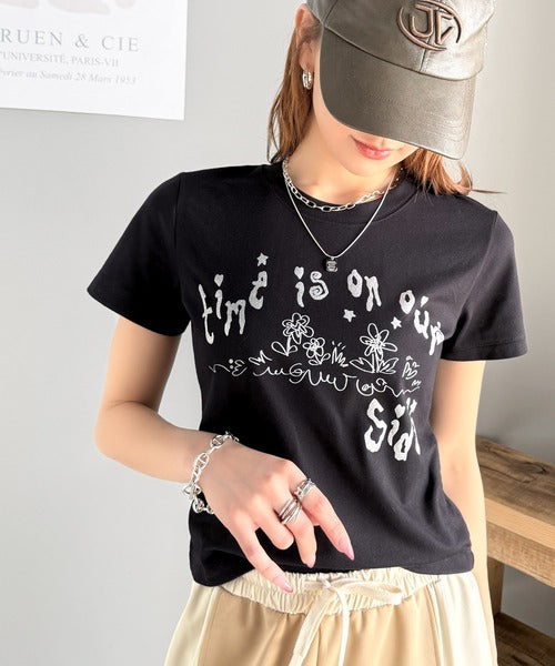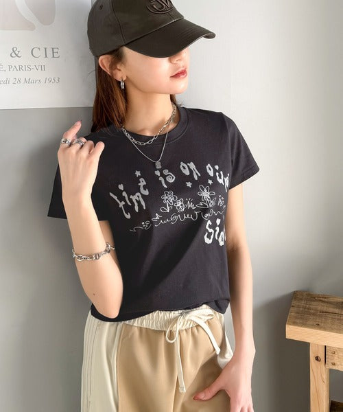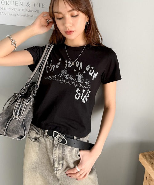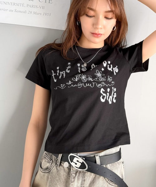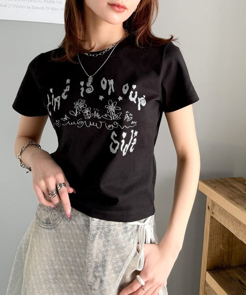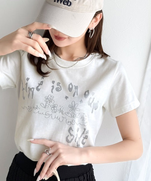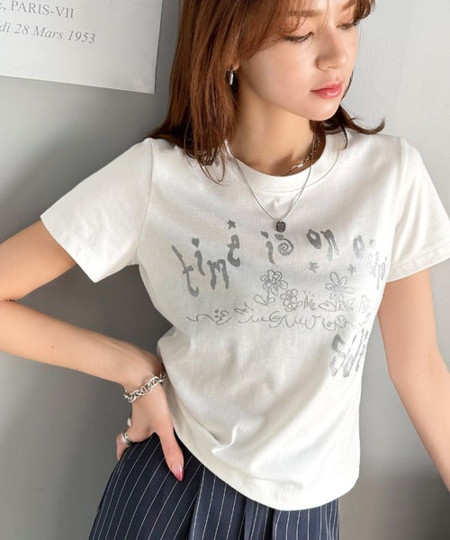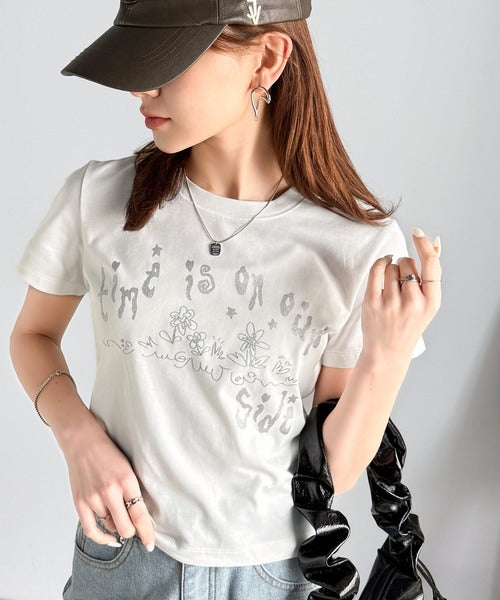 シルバーのグラフティプリントが目を引く、コンパクトサイズのTシャツ。