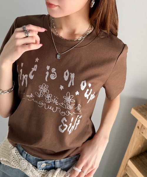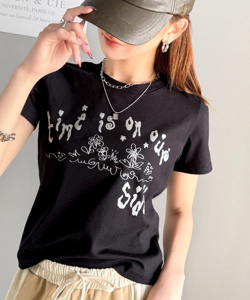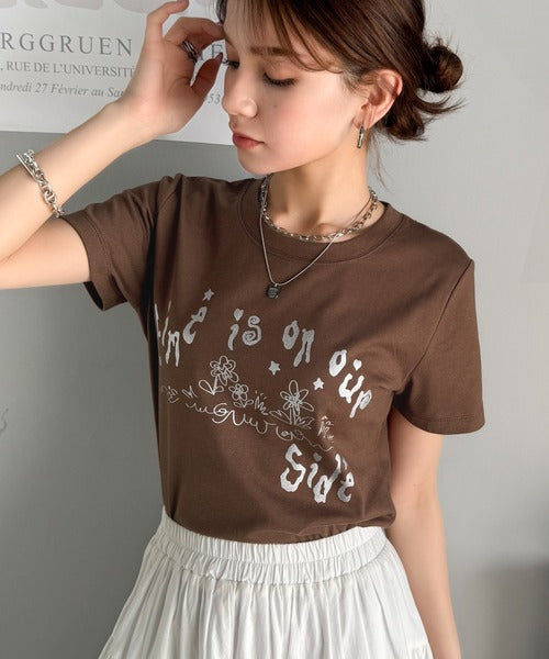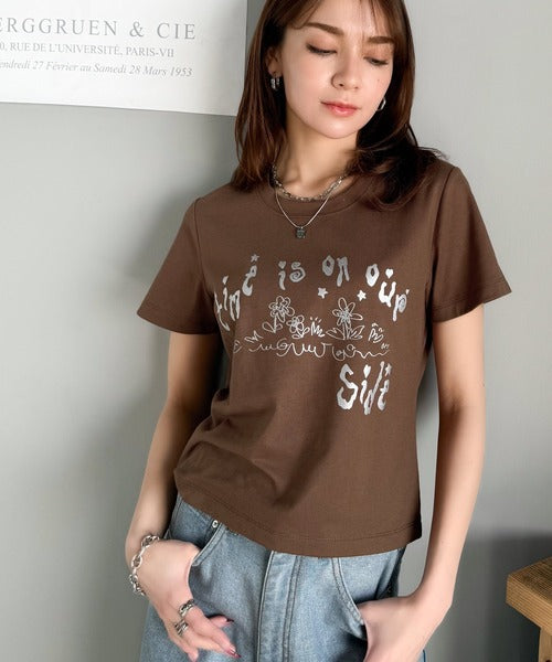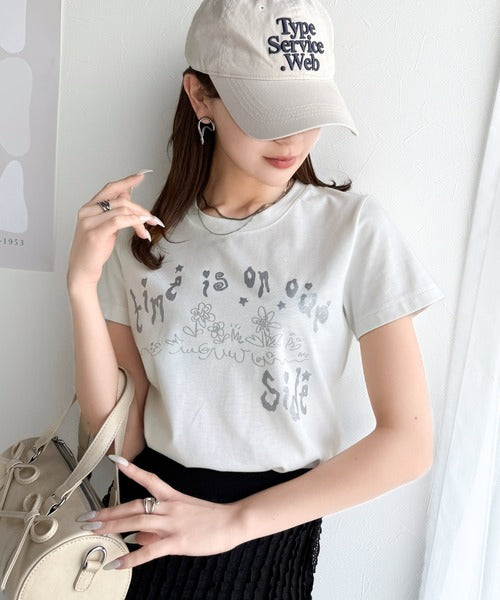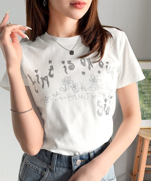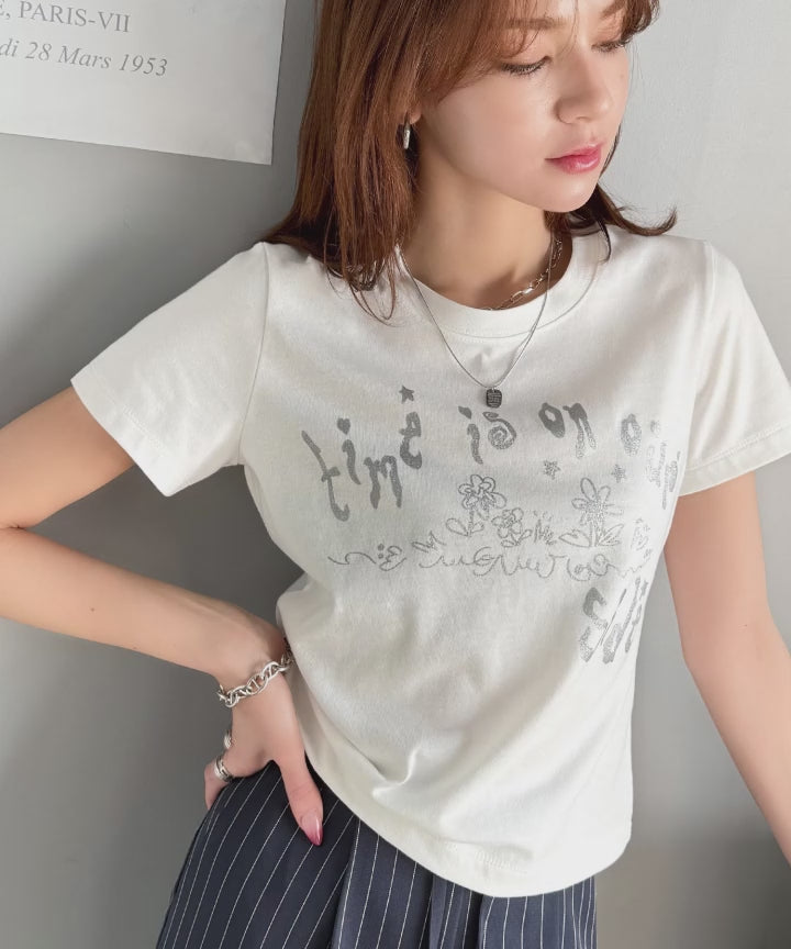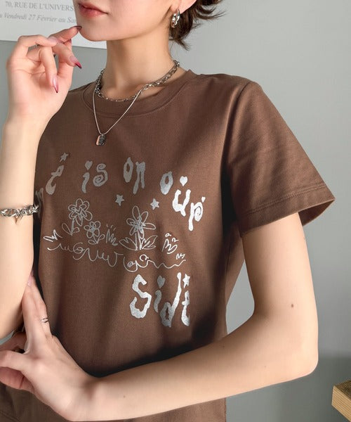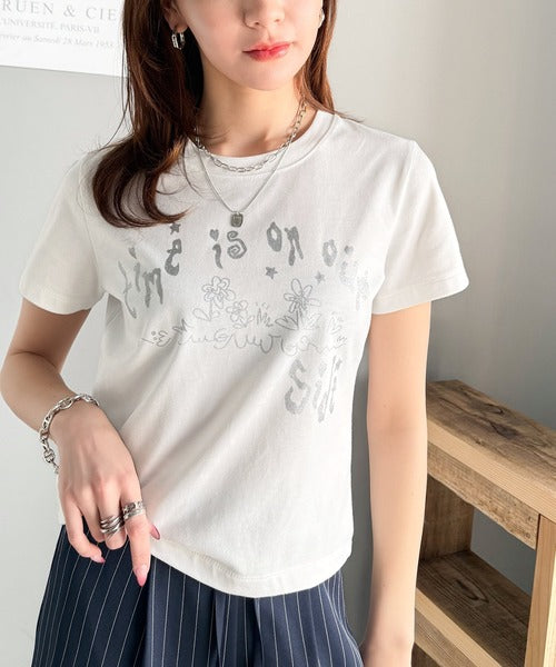 【mily bilet】大人の上品グラフティ。ハンドペイントライクシルバープリントコンパクトTシャツ mi1329023