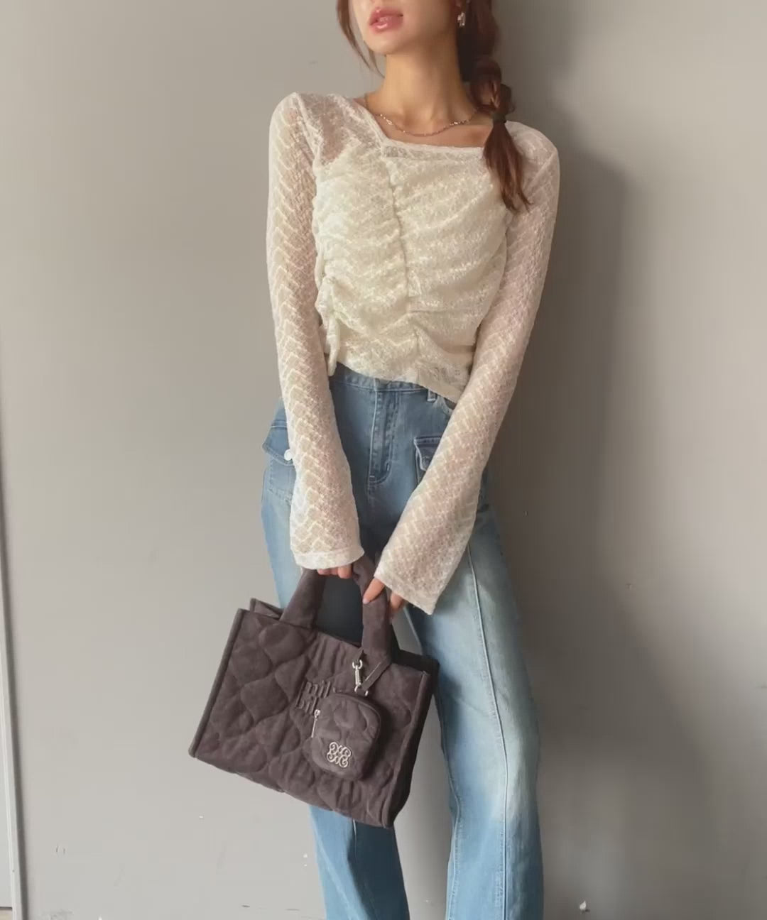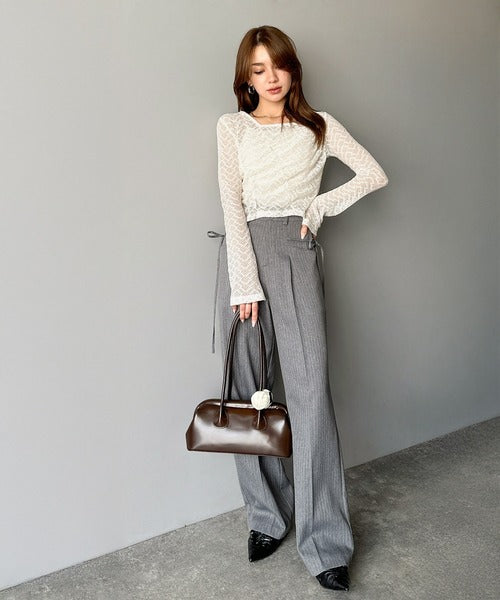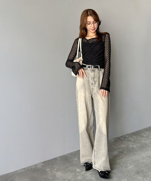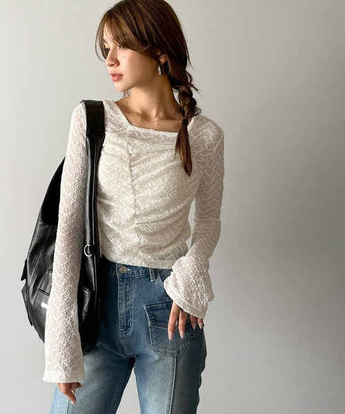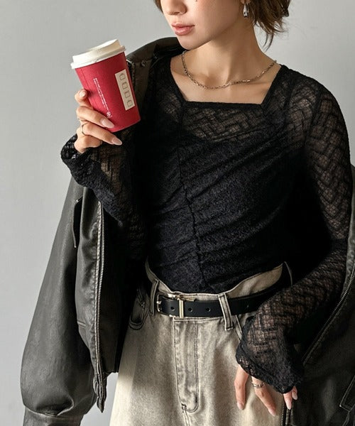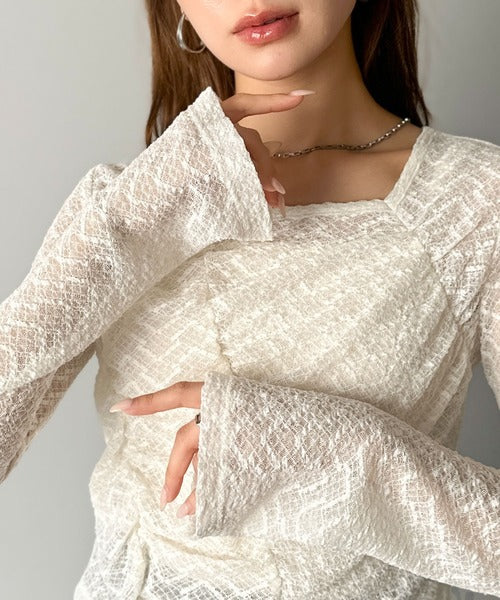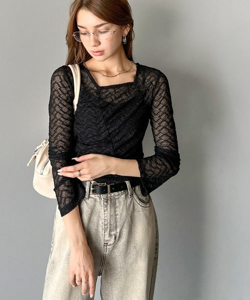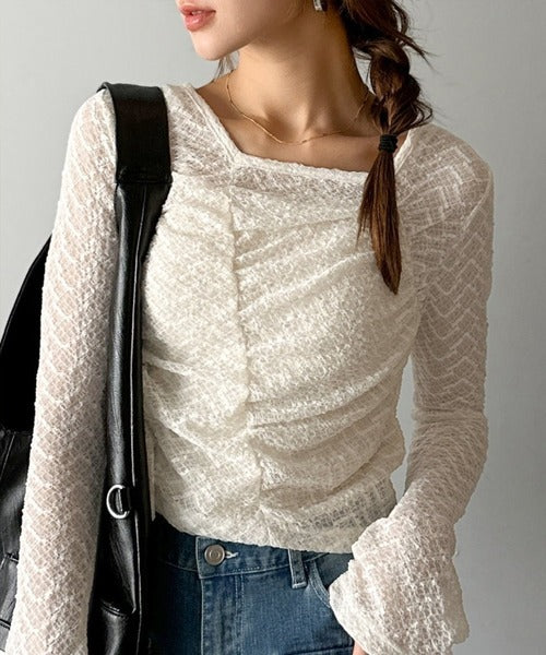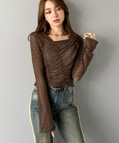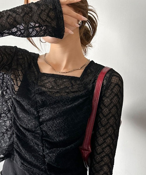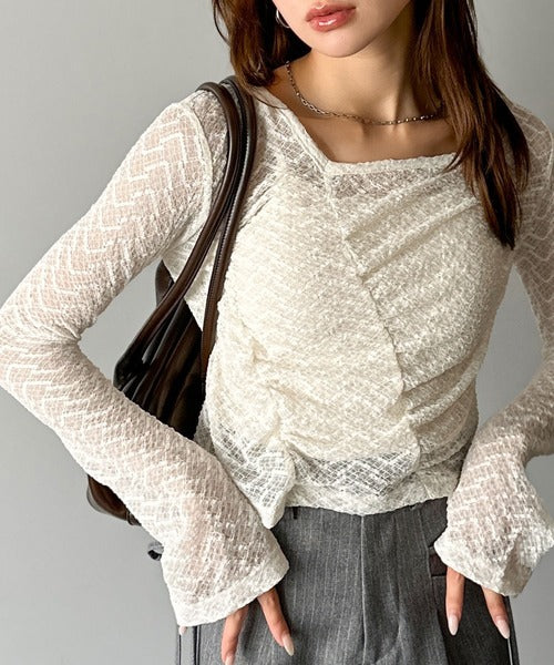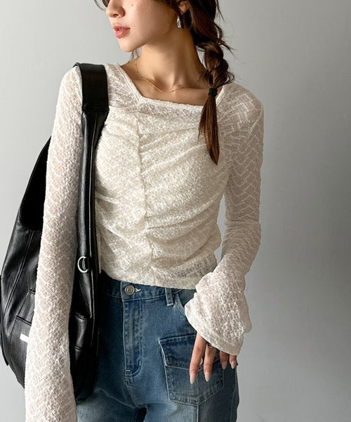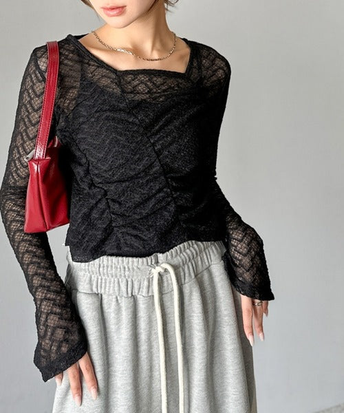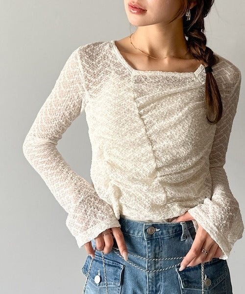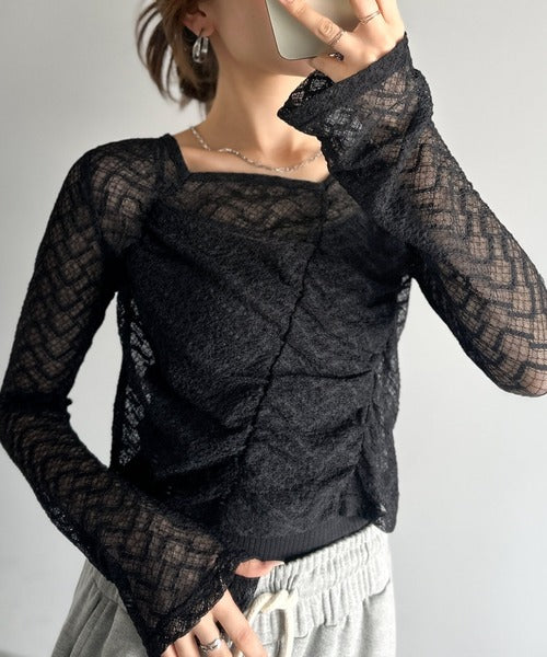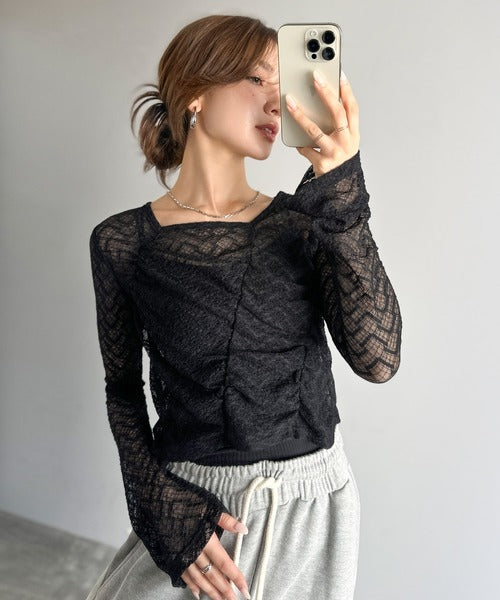 トレンドのギャザーが華やかなシアーレースアイテム。