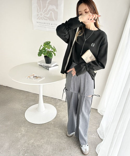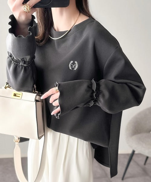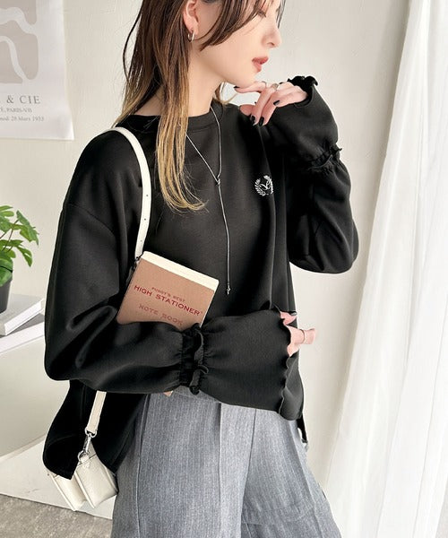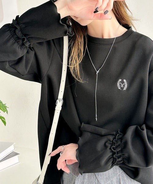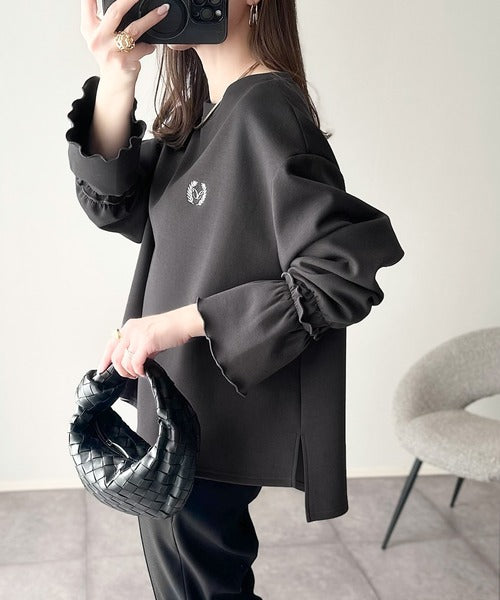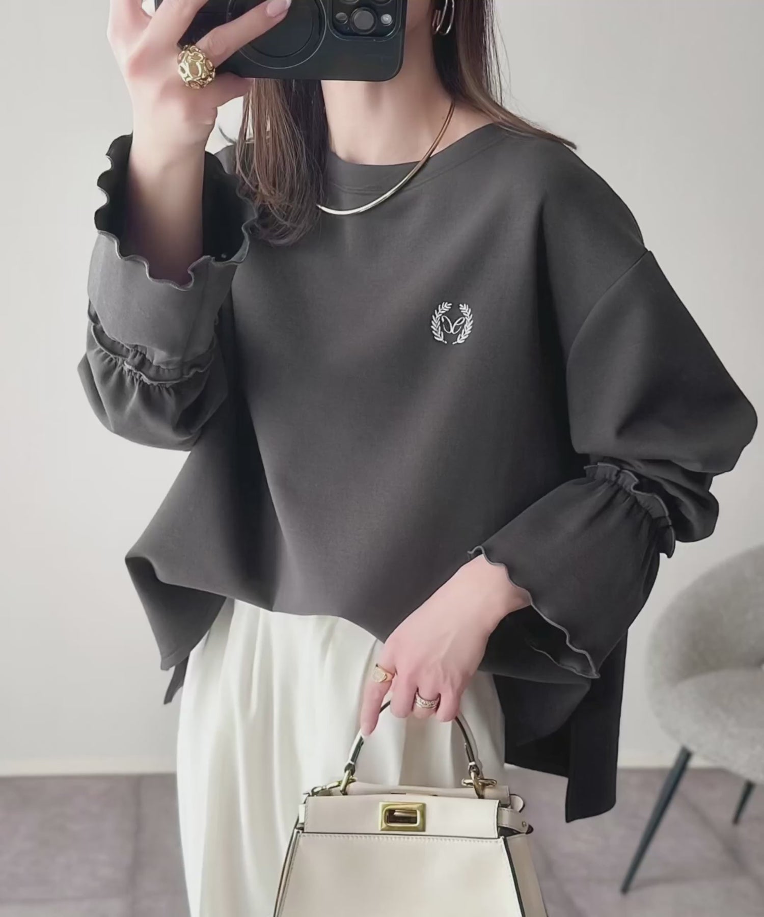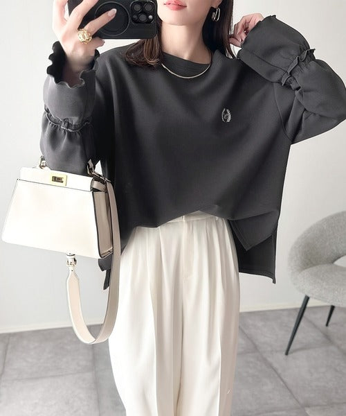 胸元のワンポイントロゴ刺繍とトレンドのキャンディースリーブが、