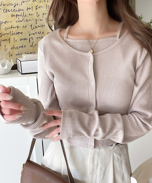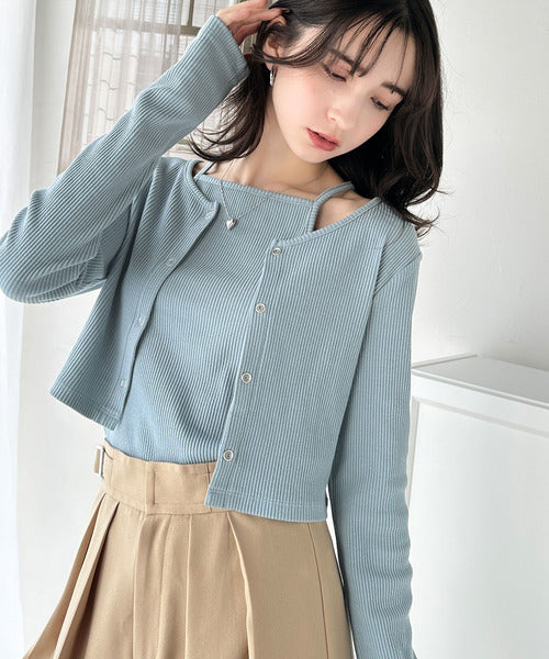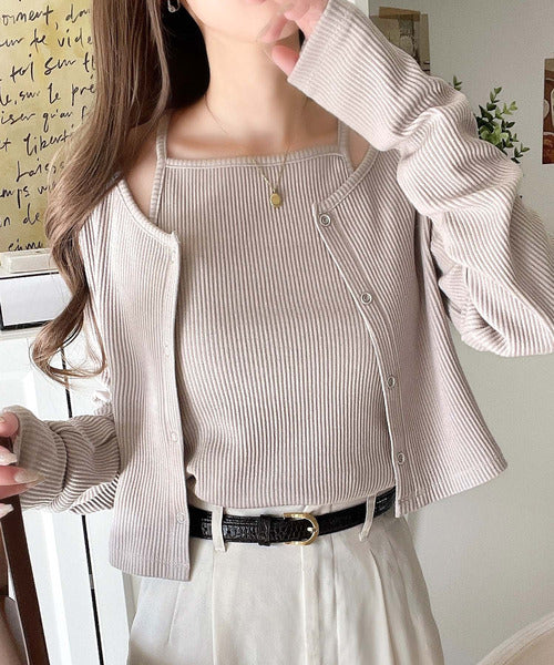 ・コンパクトな丈感のカーディガンにキャミソールが付いた着回し自在なアンサンブル
