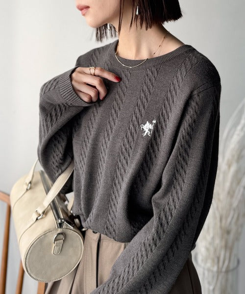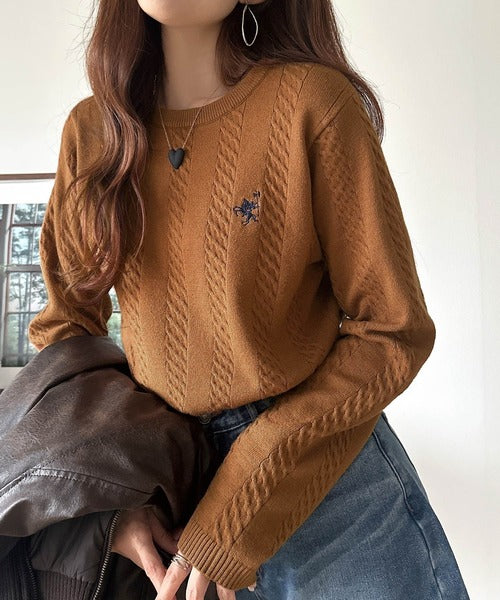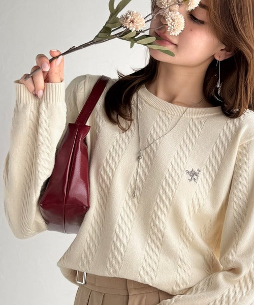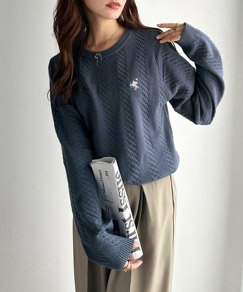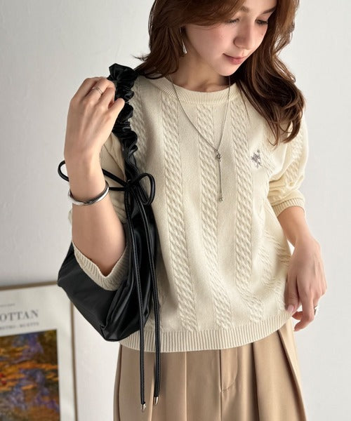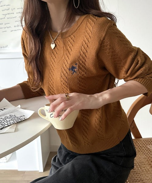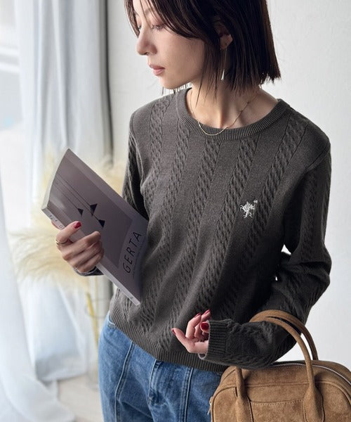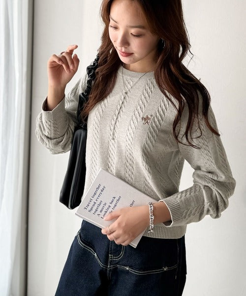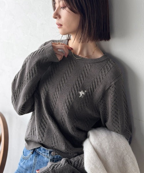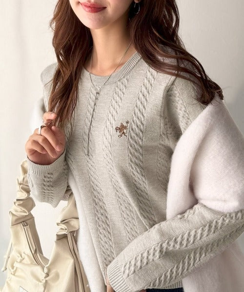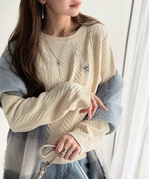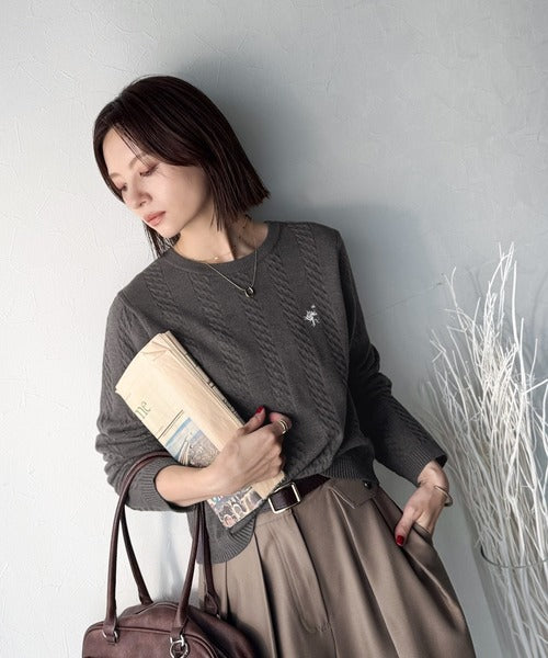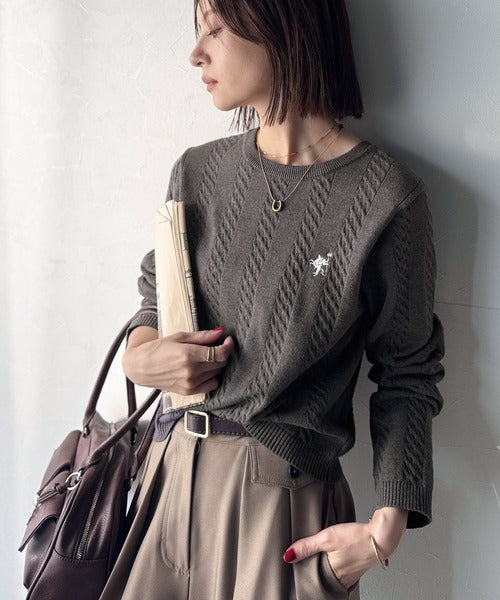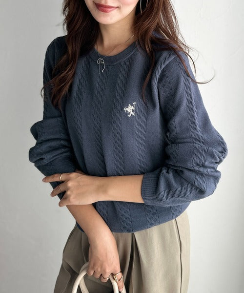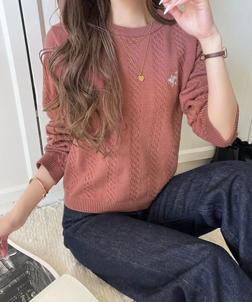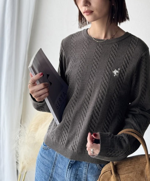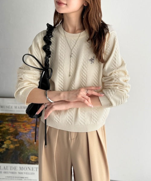 大人のためのコンパクトニット。胸刺繍ショート丈ケーブル編みニット(長袖) ce1260453