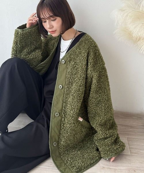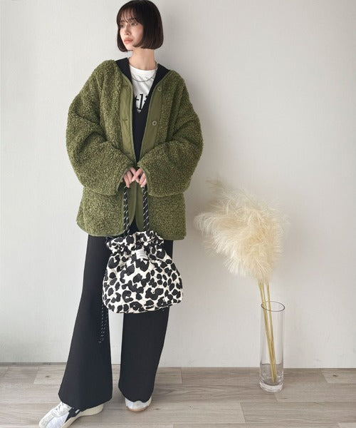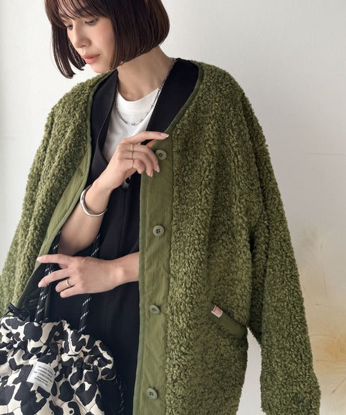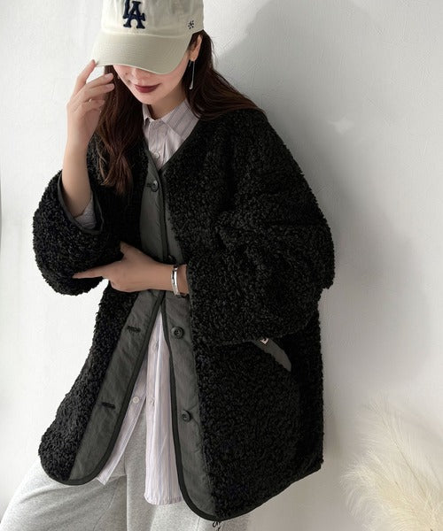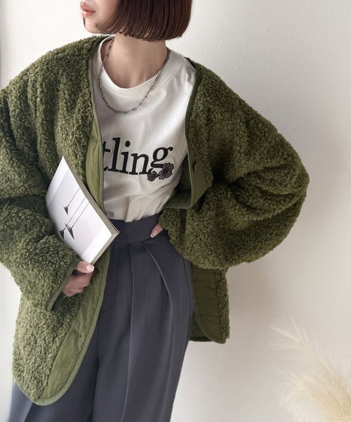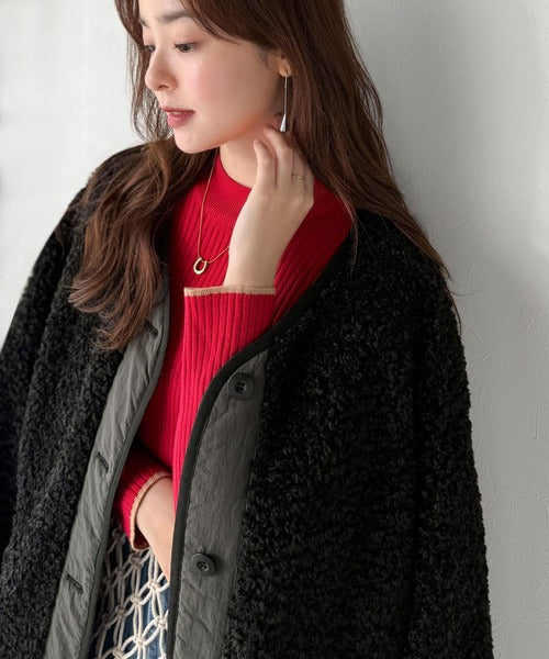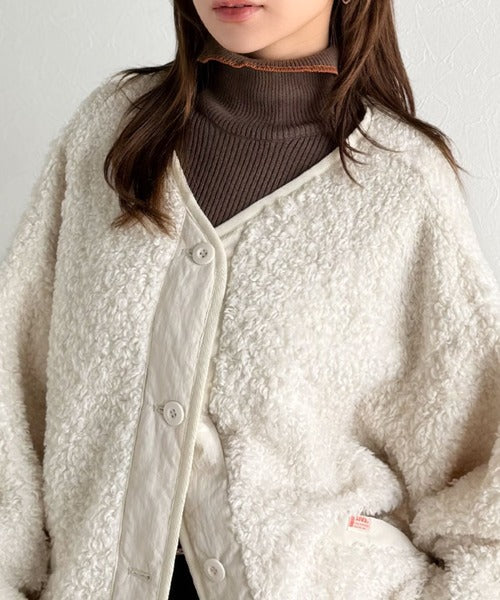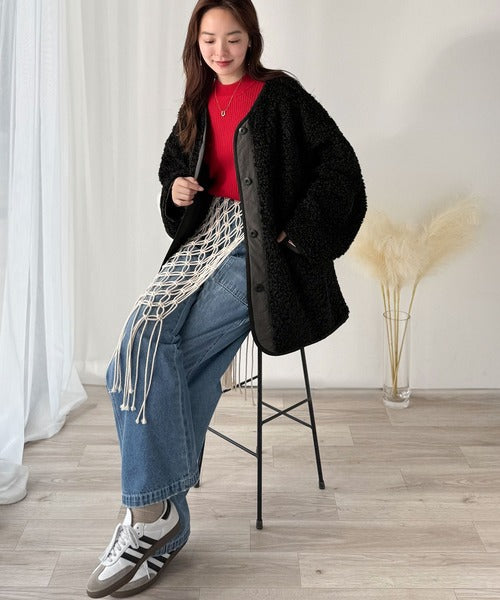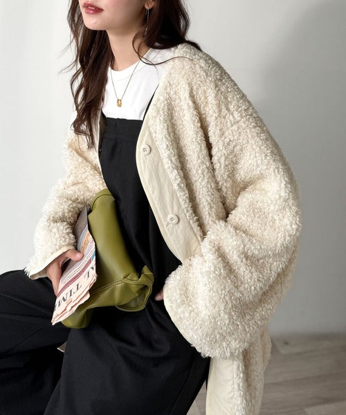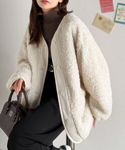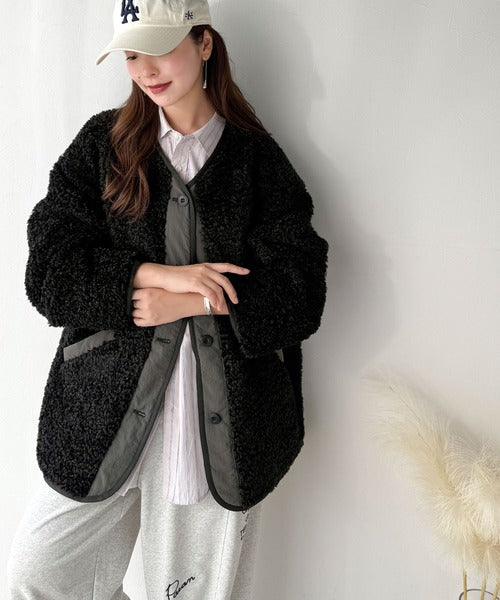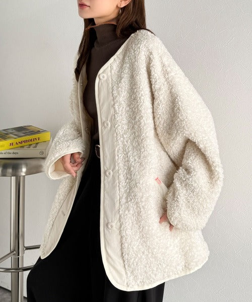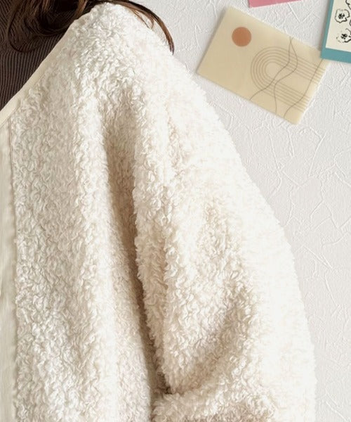 異素材を巧みに切り替えた配色デザインのノーカラーボアジャケット。