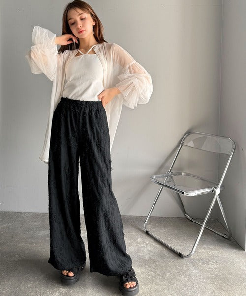甘めテイストなら、パンツにフレアなレーススカートやシアースカートを重ねて、