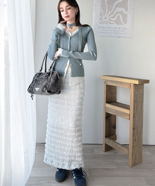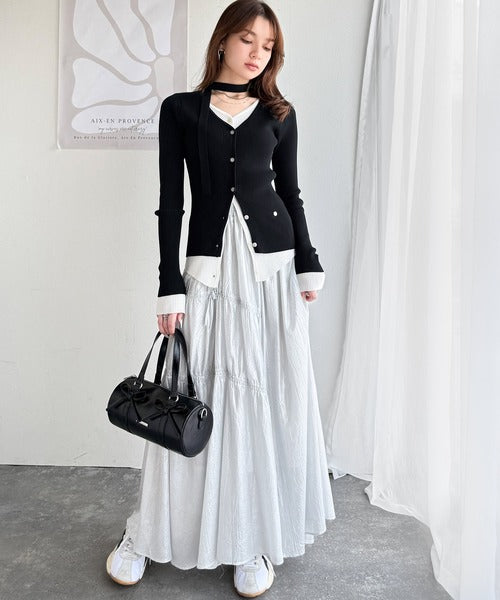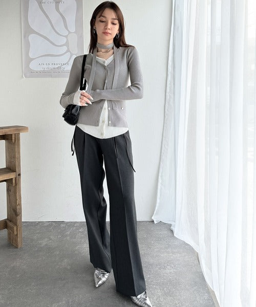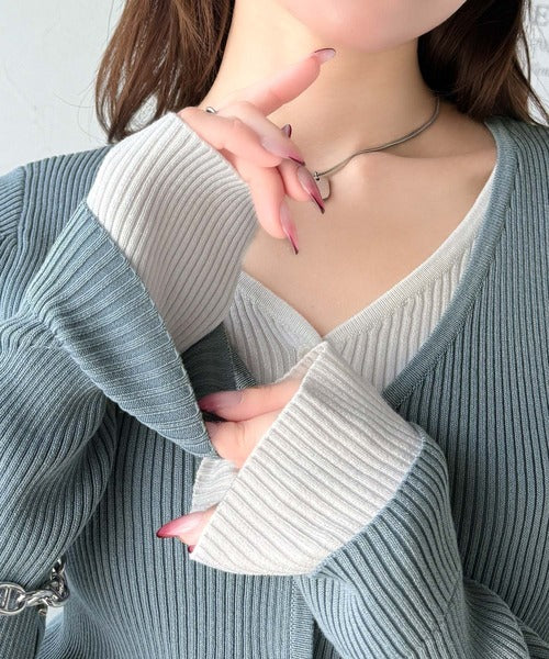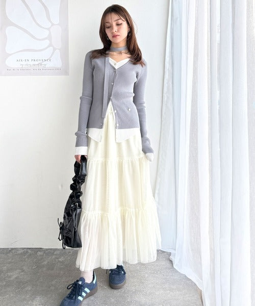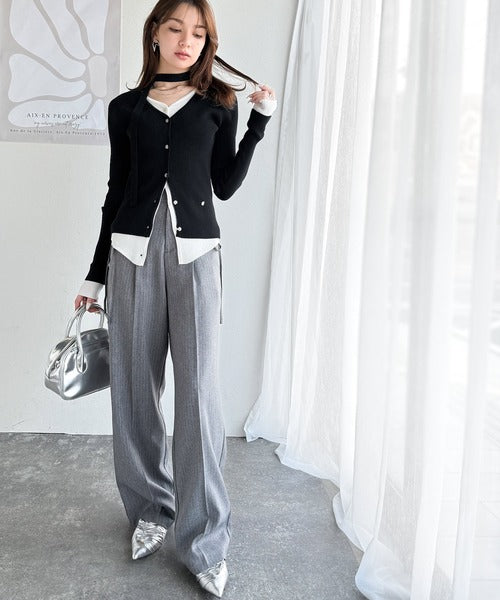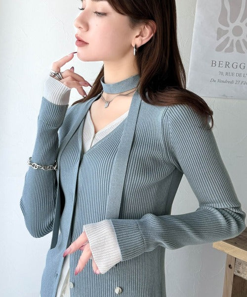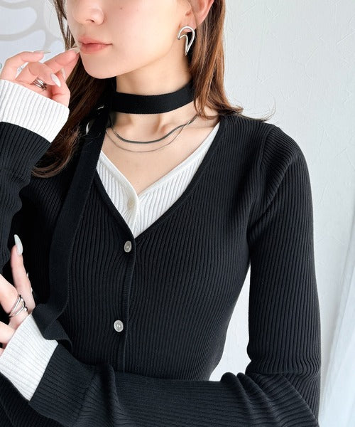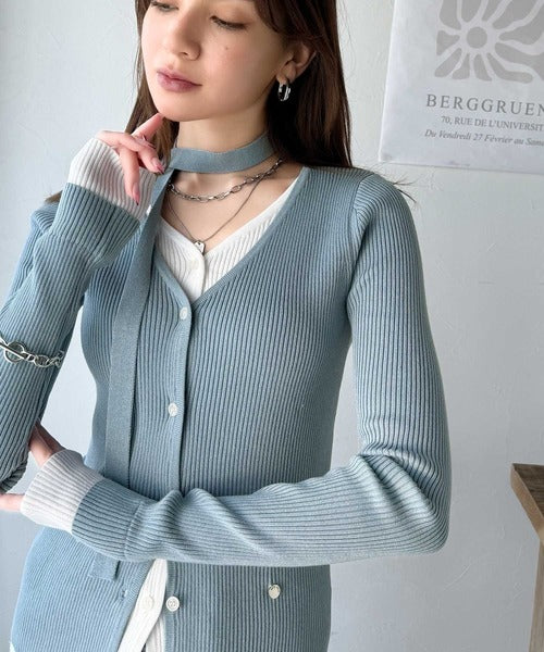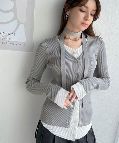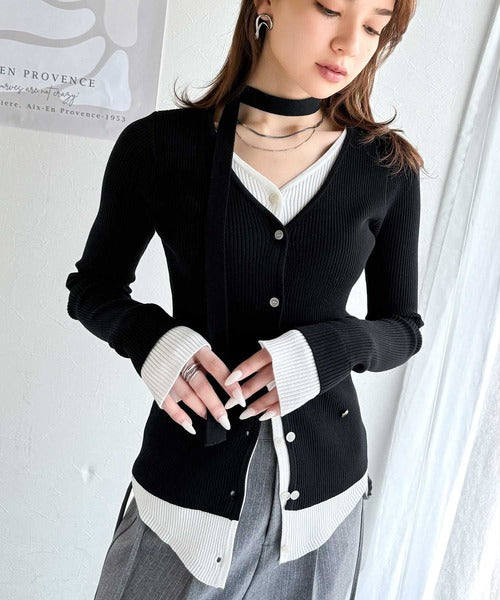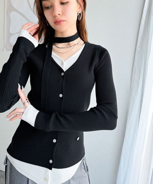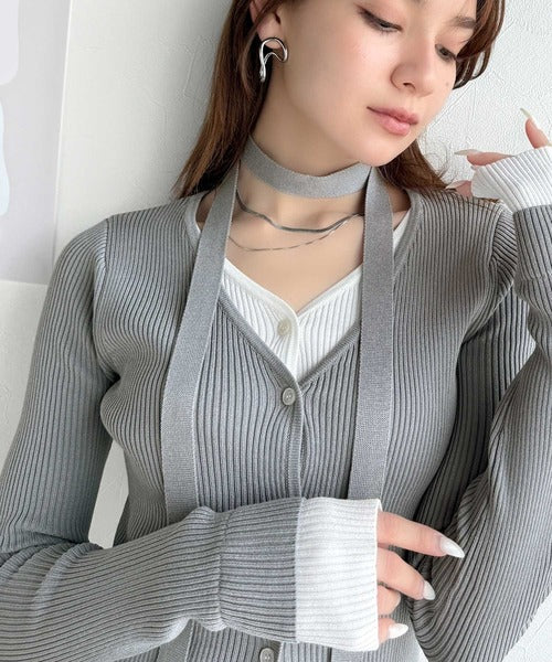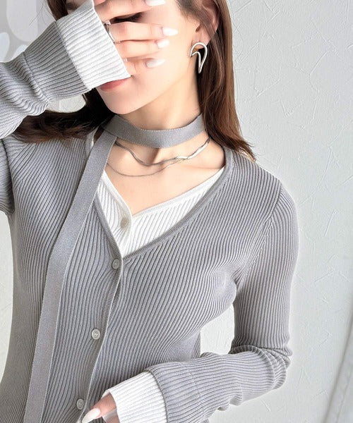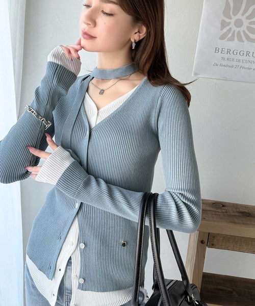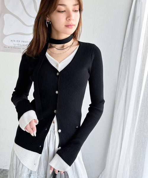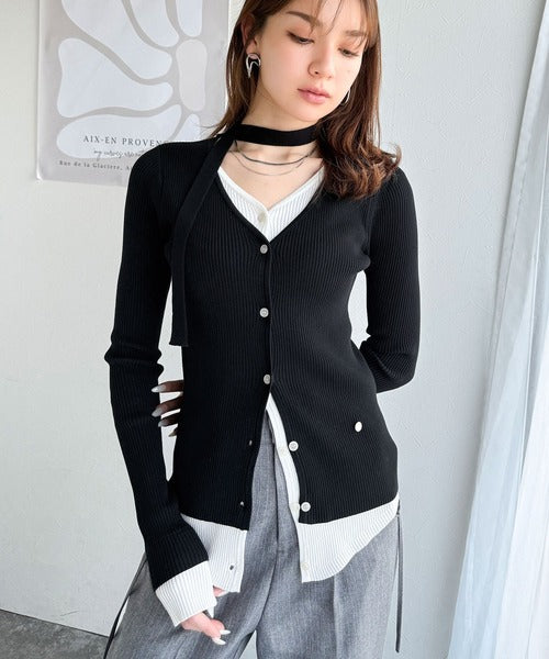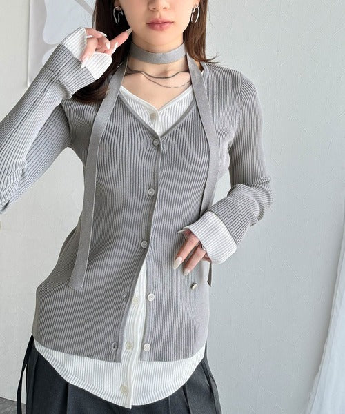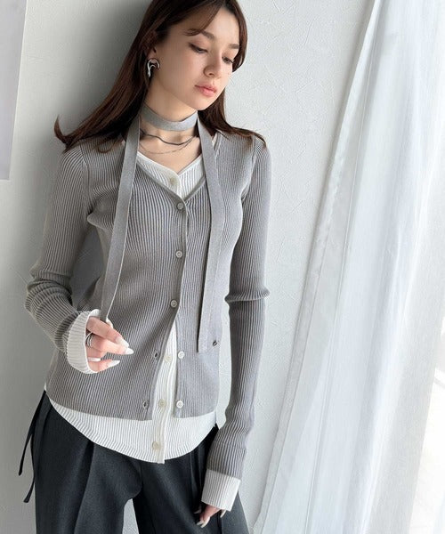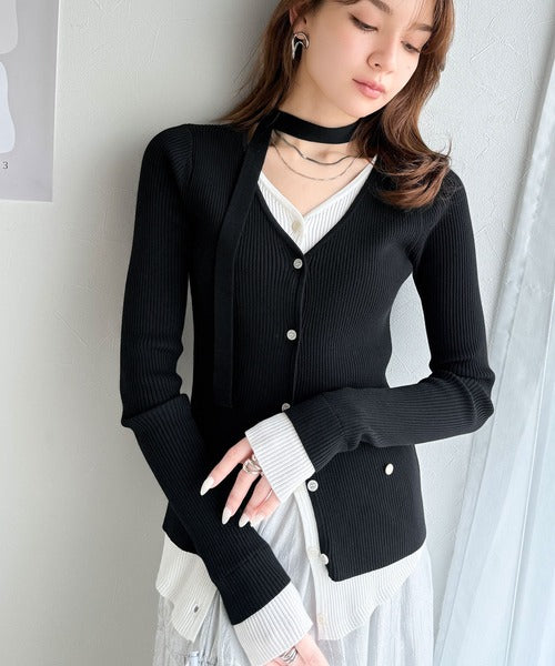 【mily bilet】洗練されたレイヤードスタイル。チョーカー紐付きレイヤード風Vネックカーディガン(長袖) mi1029108