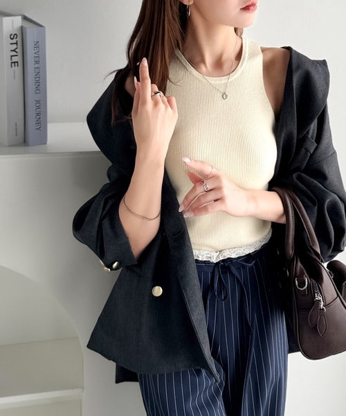 トップスとインナーが分かれているので、自由なコーディネートが楽しめるセットアップ。