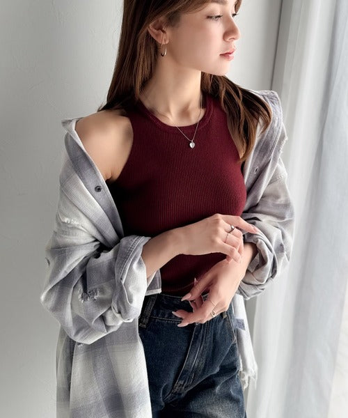 襟ぐりのカットオフデザインから覗くインナーが、さりげない抜け感をプラス。