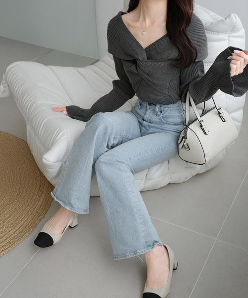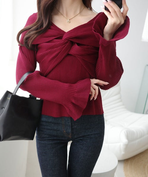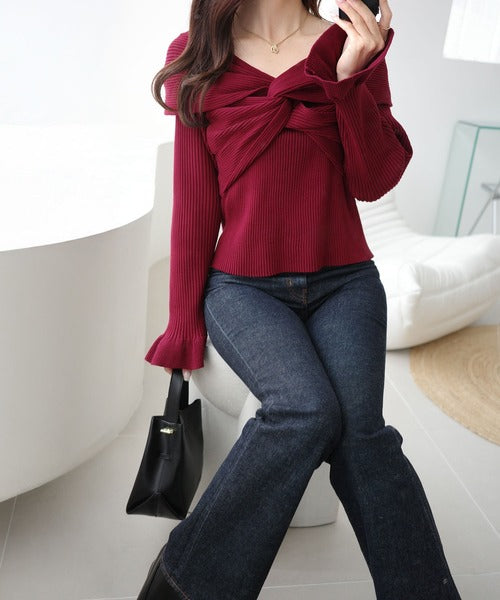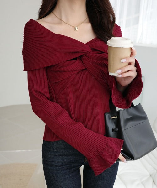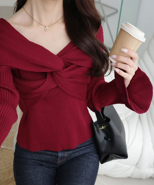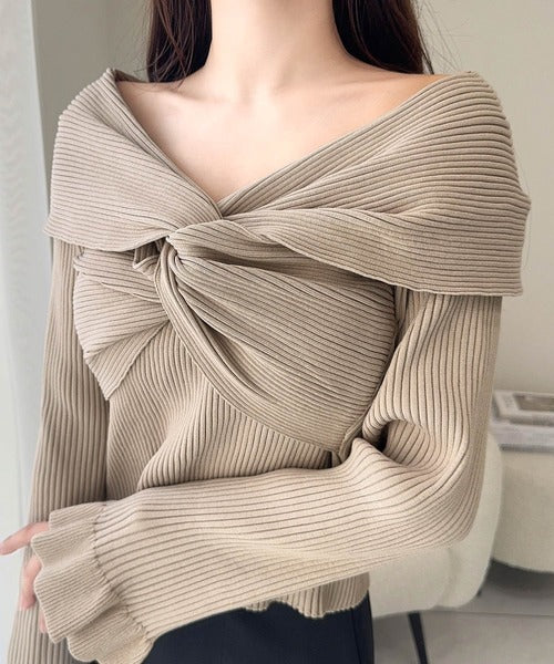 ツイストデザインがポイントの、華やかさと上品さを兼ね備えたリブニットプルオーバー。